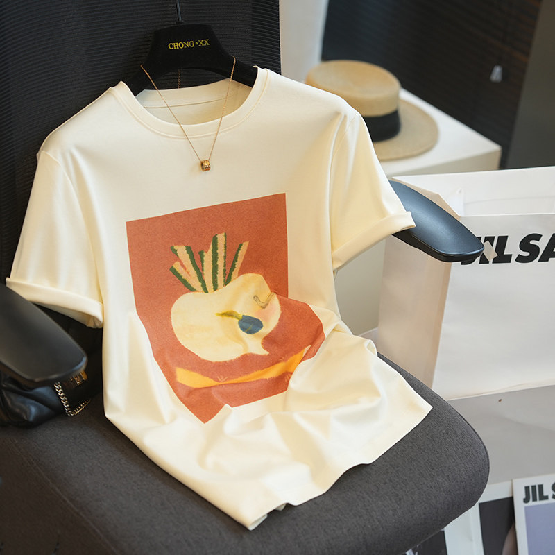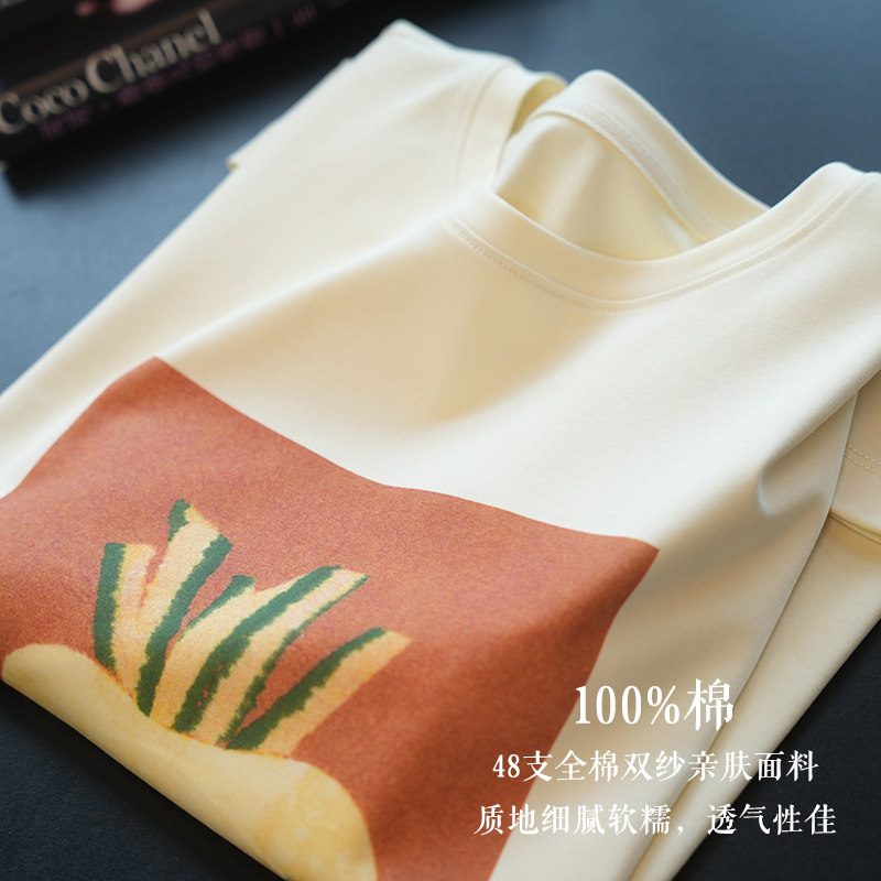 禾家涂鸦48支纯棉双纱圆领短袖 A101R T恤女复古艺术印花上衣春夏季