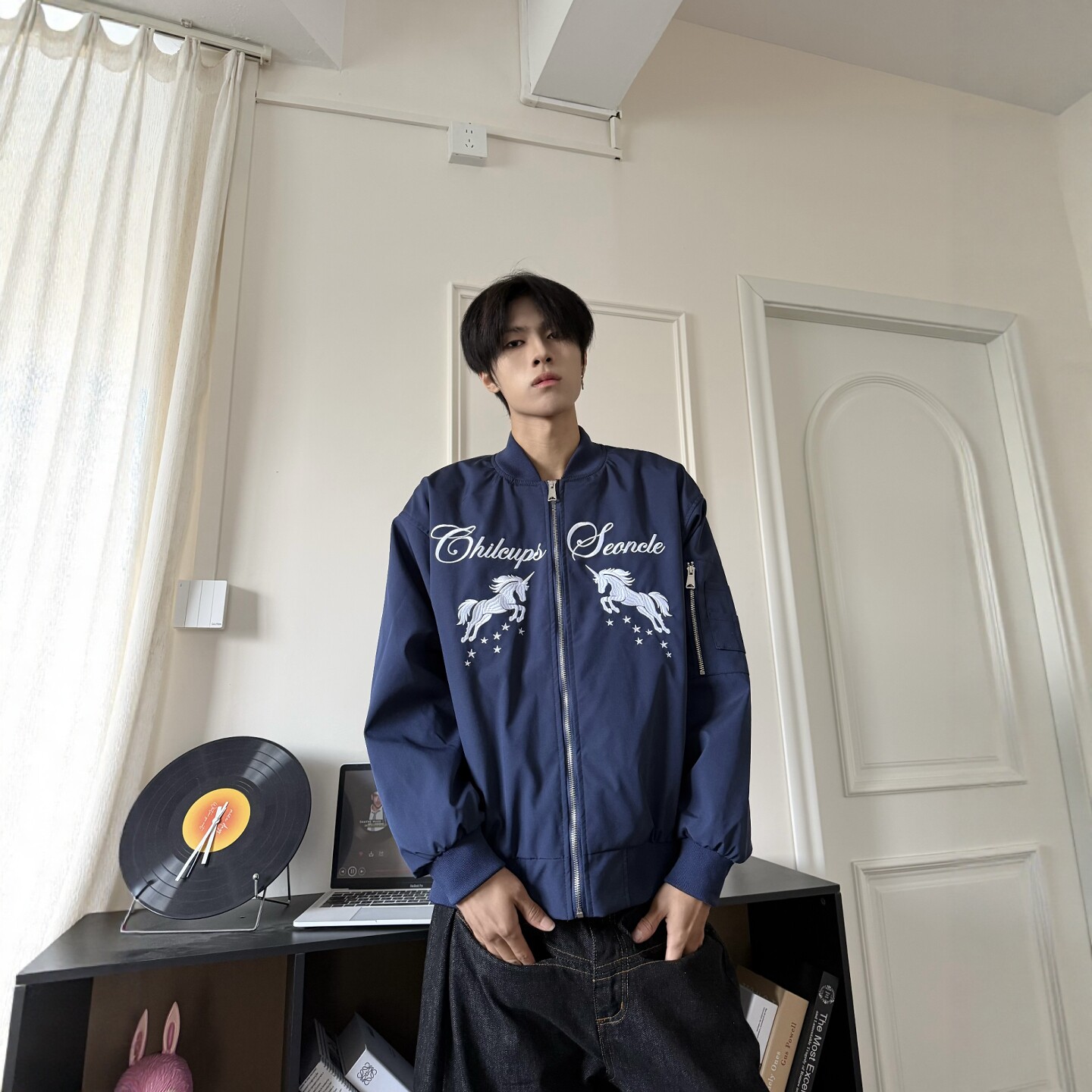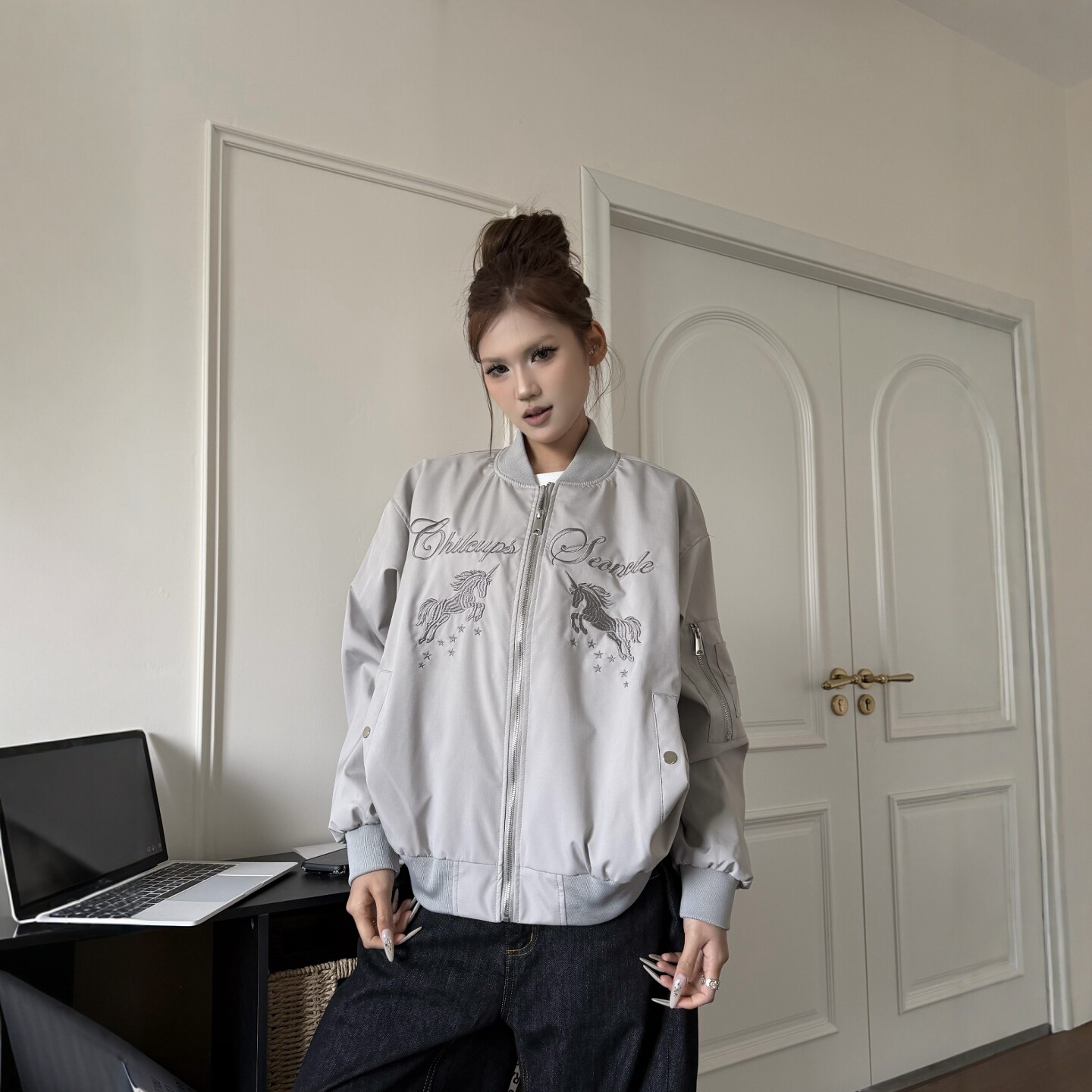 情侣百搭休闲外套 新款 DHSS美式 街头跃马刺绣飞行夹克男女宽松春季