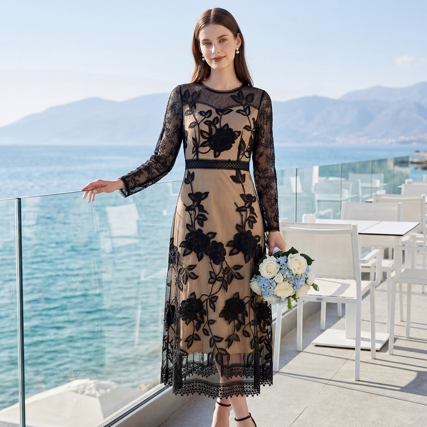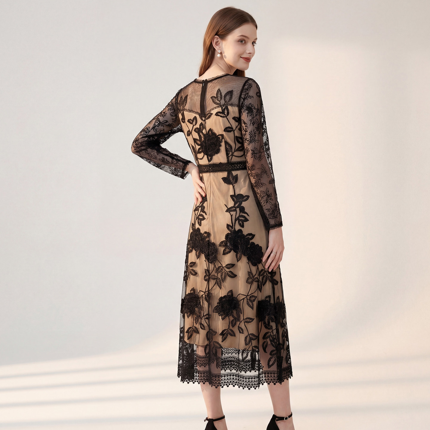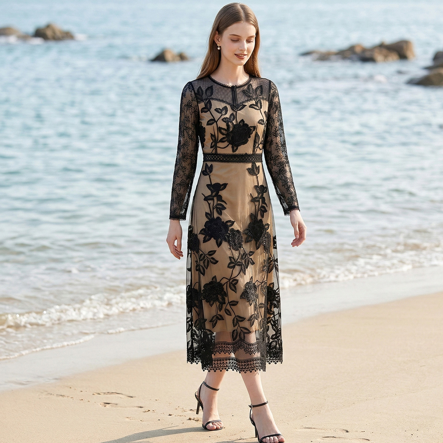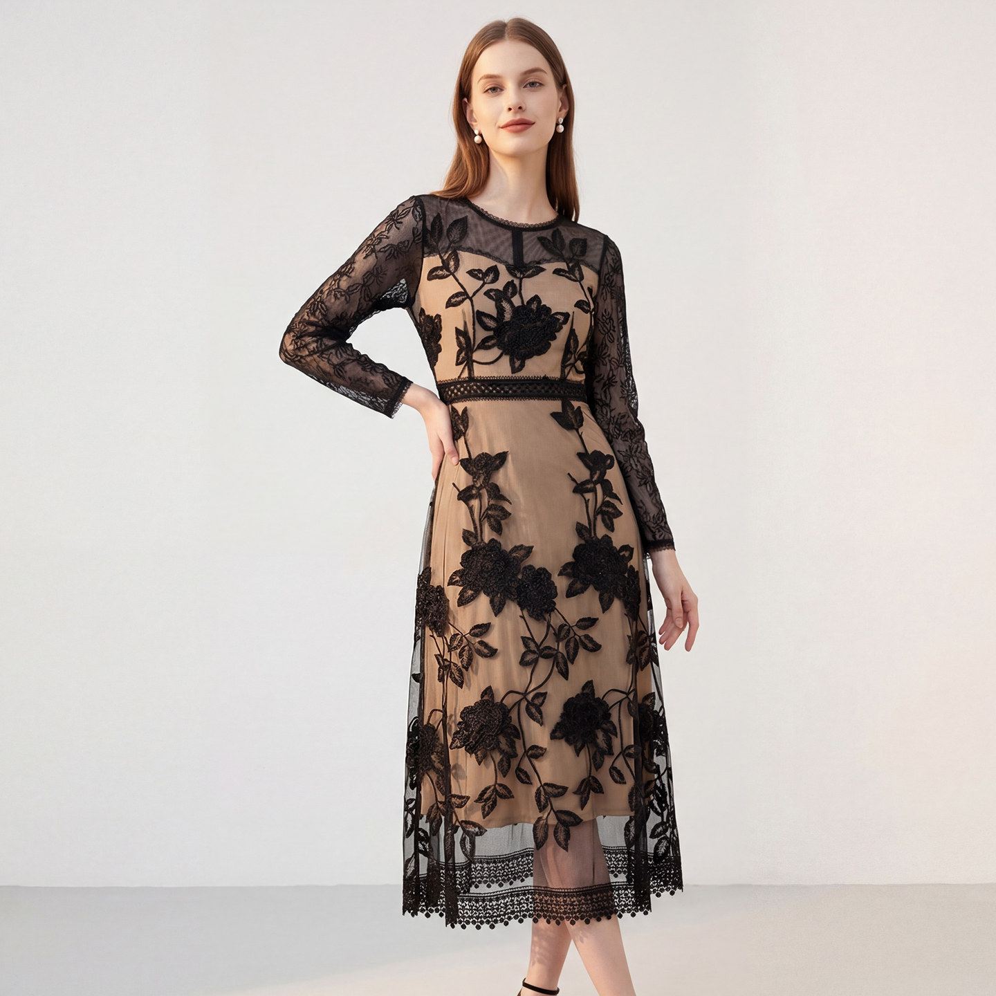 女 长裙气质时尚 马天奴2026春夏新款 黑色刺绣圆领收腰连衣裙子长袖