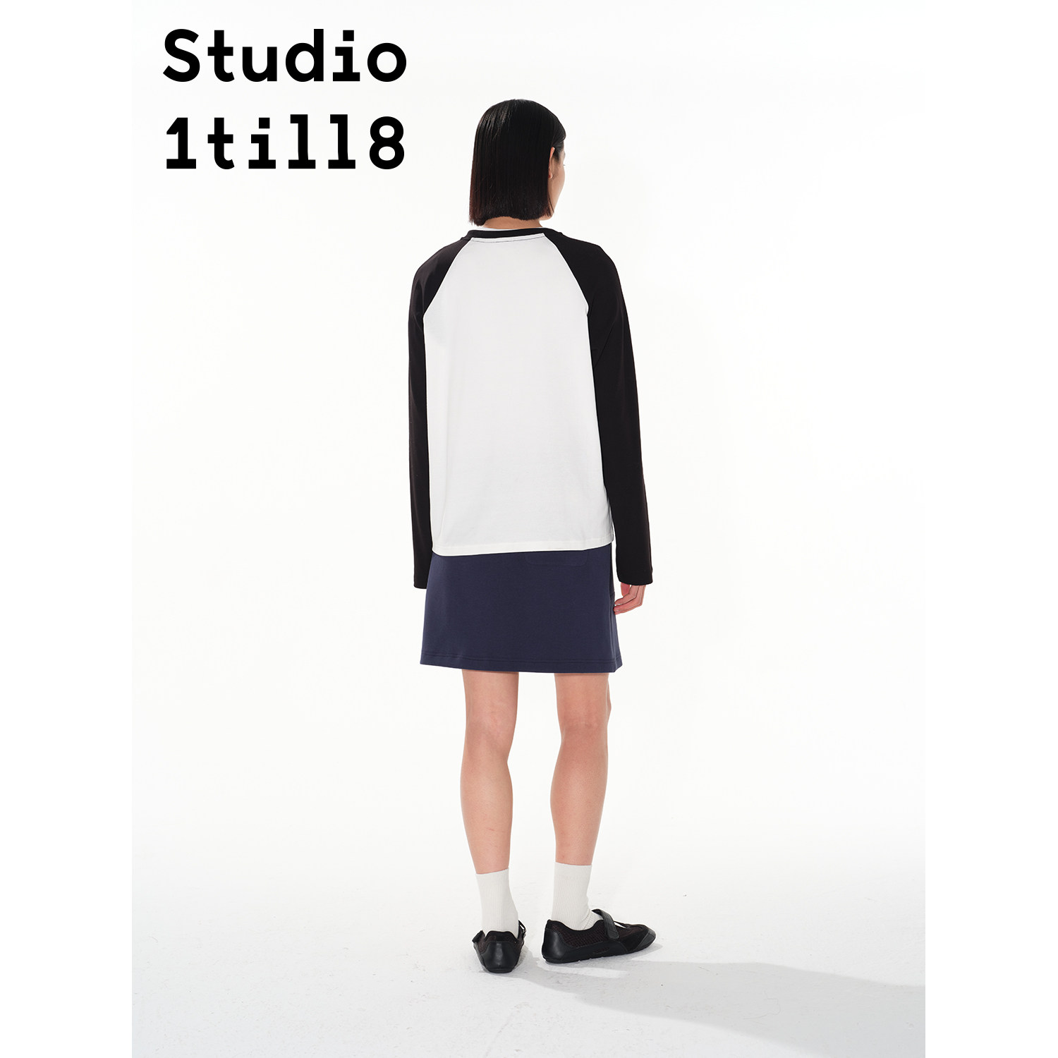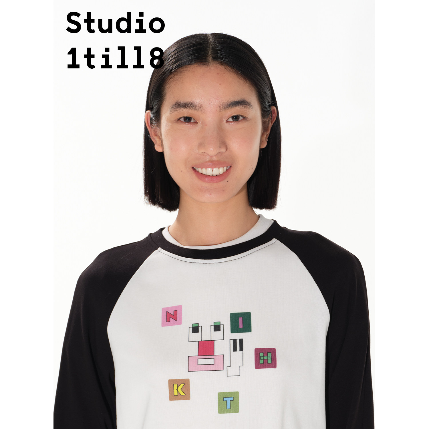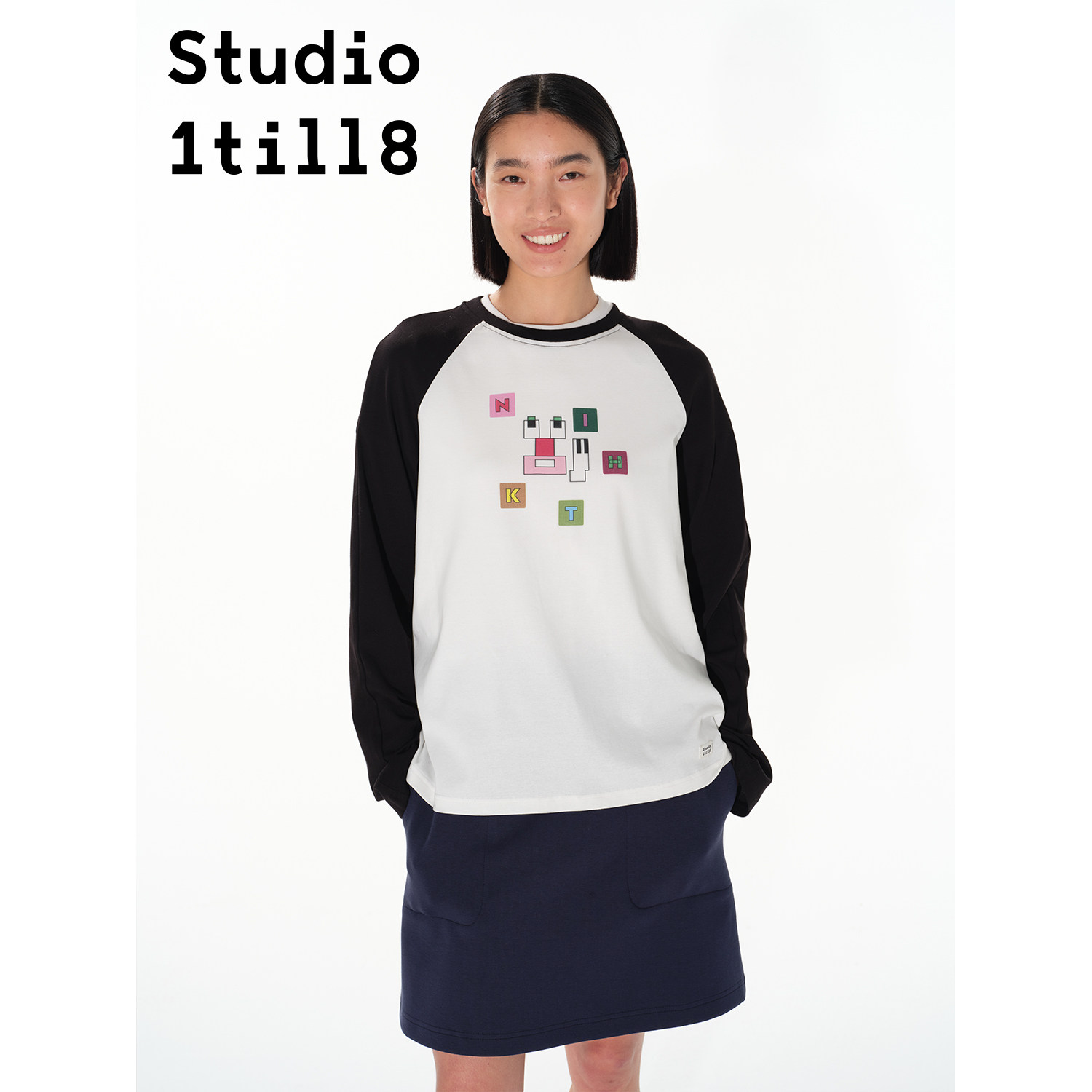 上衣 T恤女宽松百搭插肩袖 黑白色 几何表情印花长袖 Studio1till8