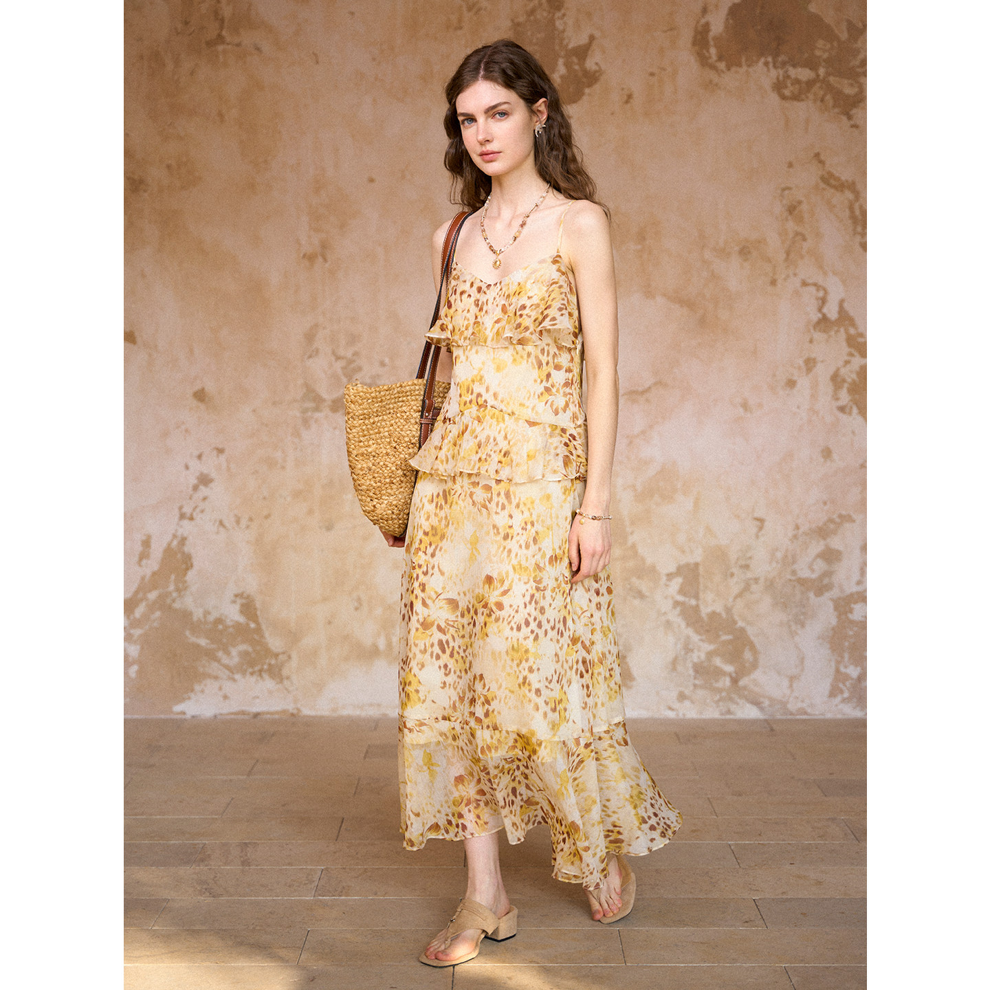 Miorastudio法式 复古干枯姜黄色豹纹长裙荷叶边度假吊带连衣裙女
