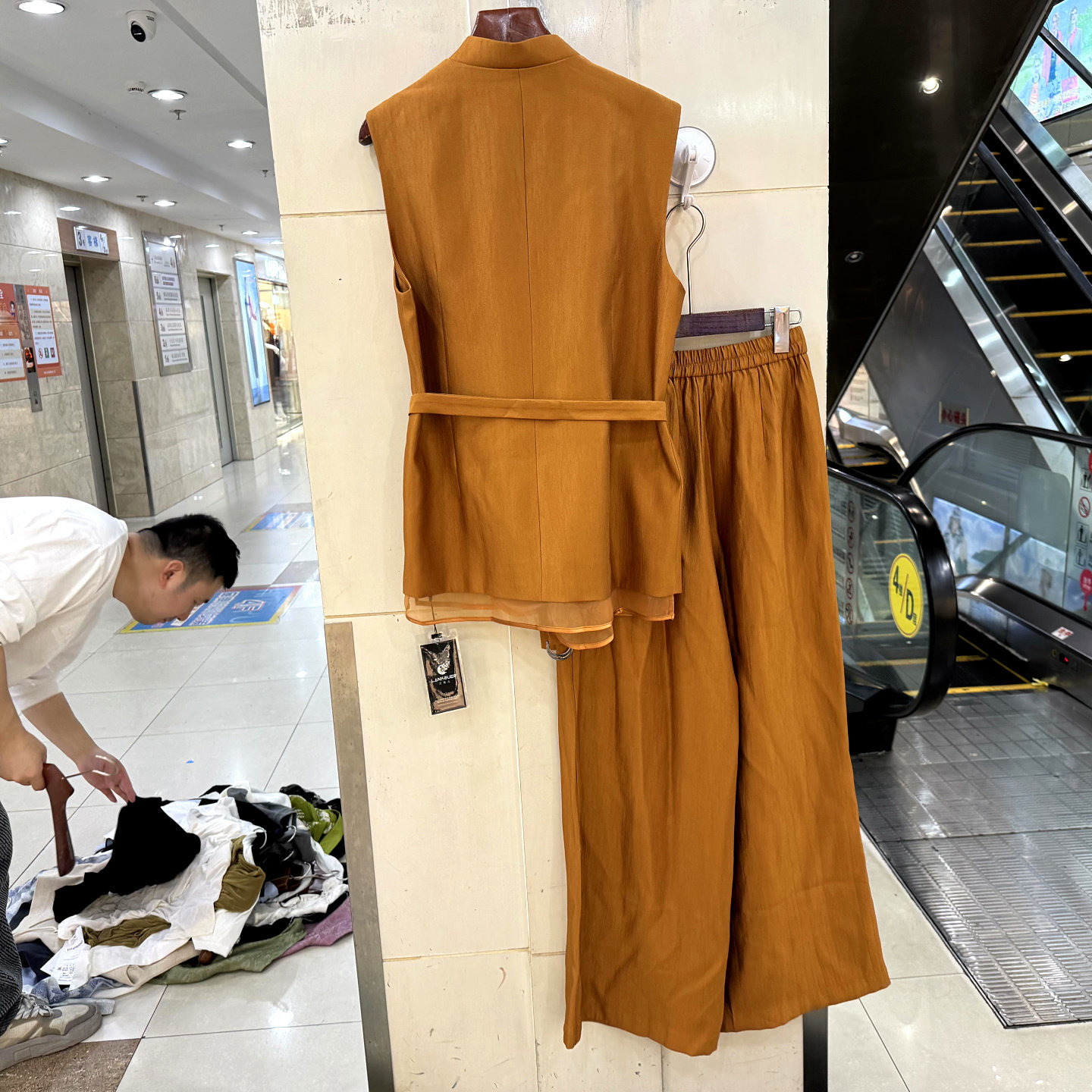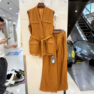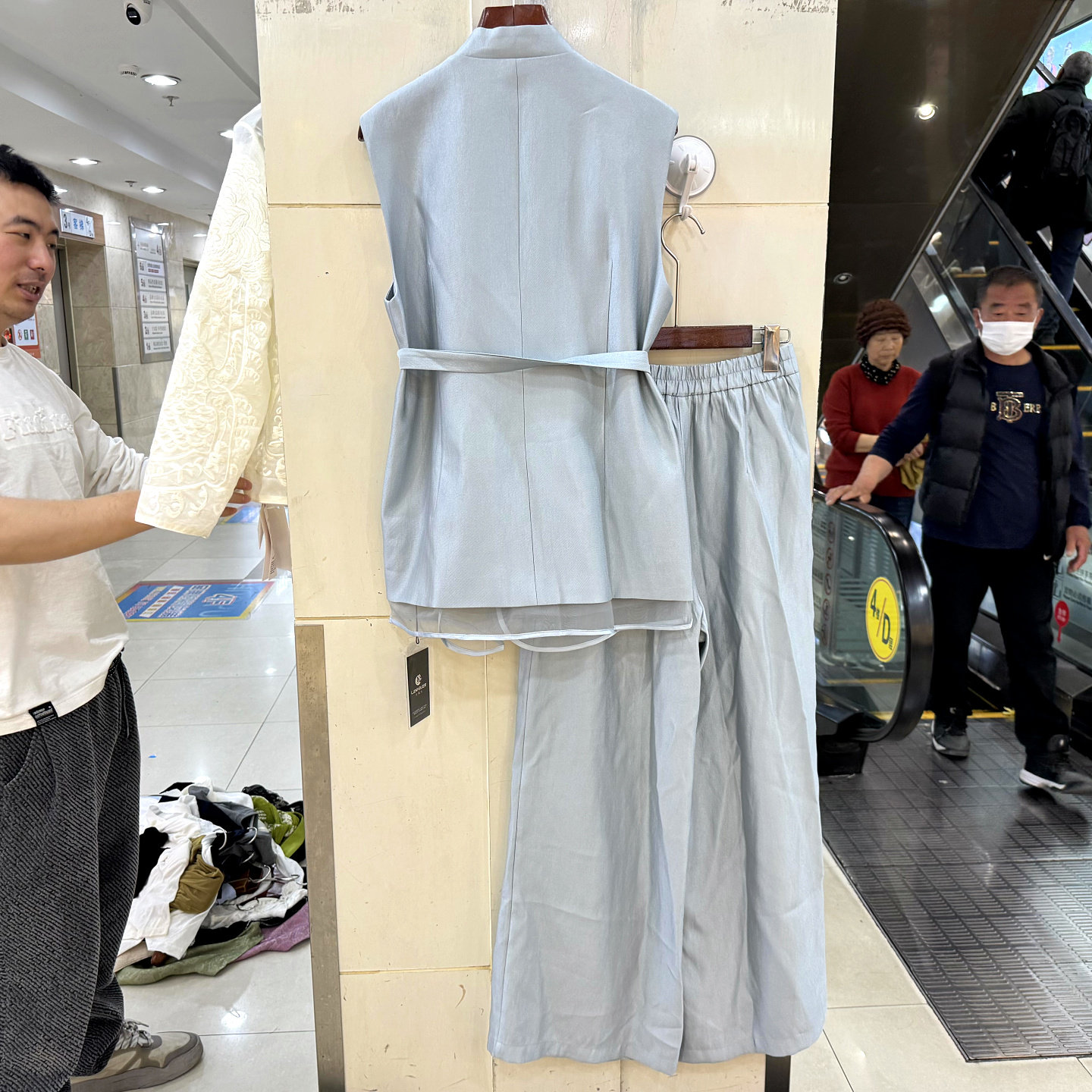 醋酸两件套 直筒裤 兰蔻儿K701 欧根纱边V领无扣系带马甲中长外套
