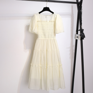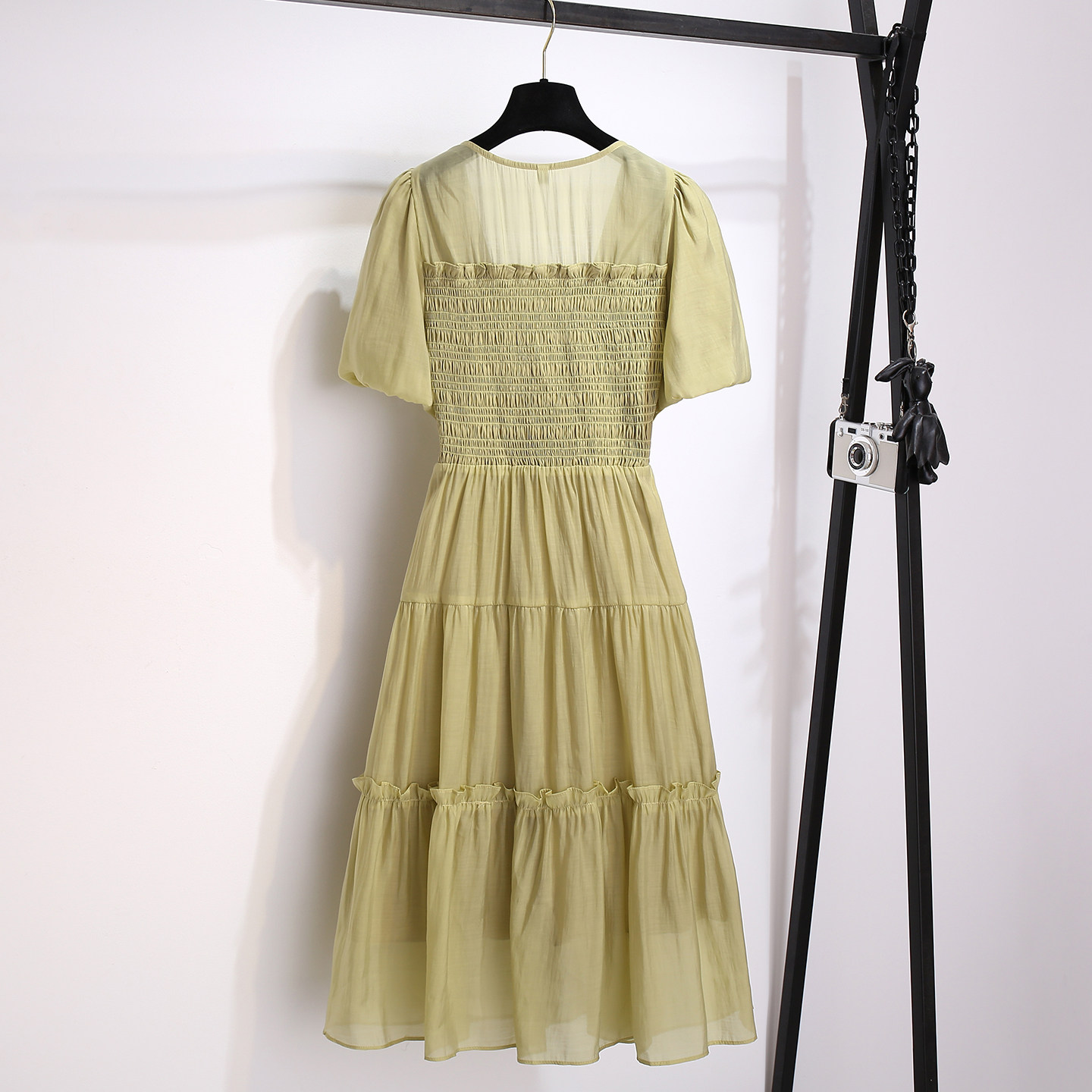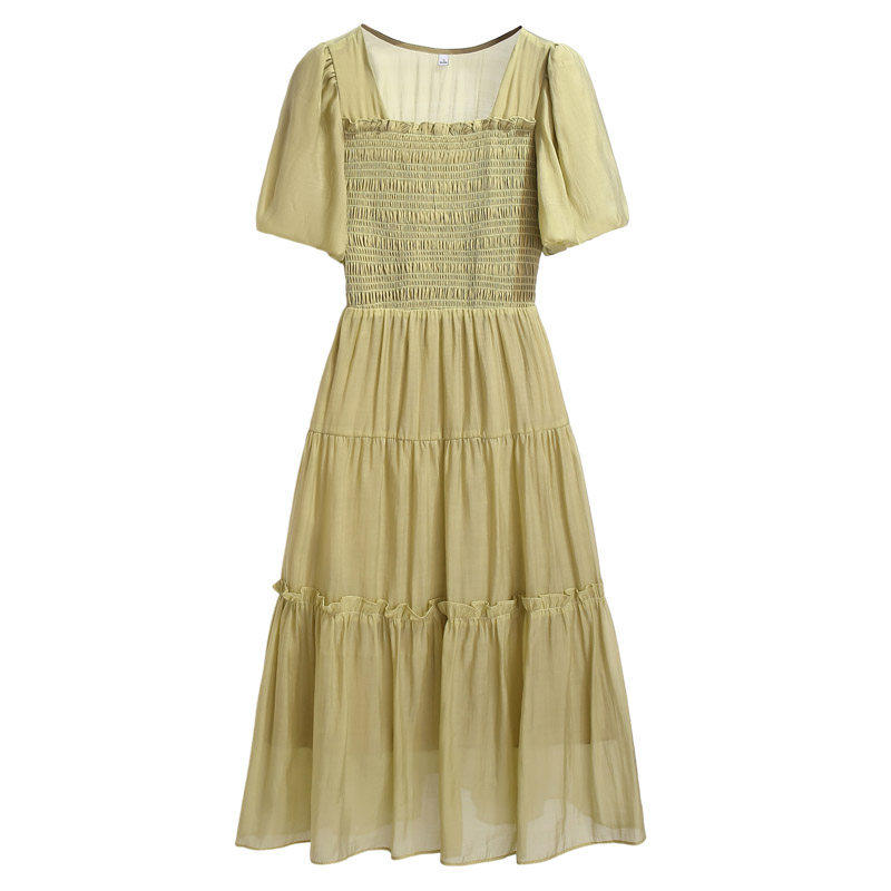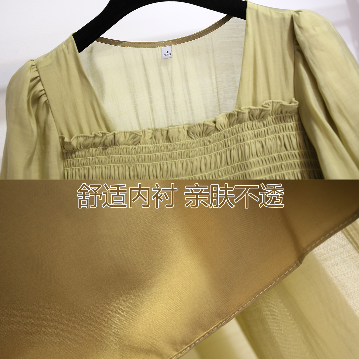 掐收腰a字长裙子 新款 牛油果绿色方领泡泡袖 天丝连衣裙女2026夏季