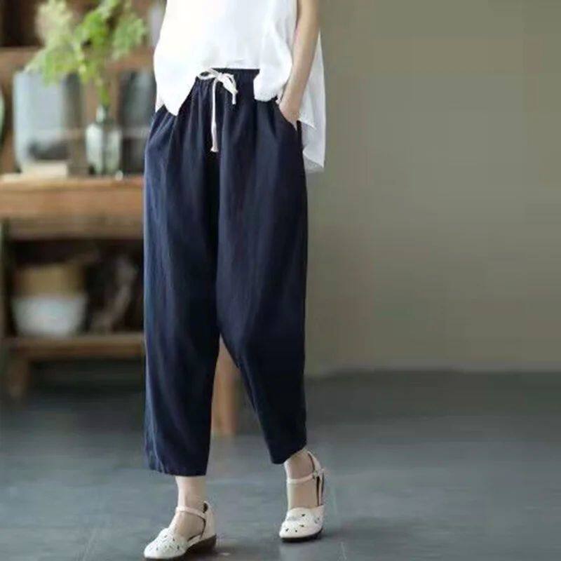女哈伦裤 Linen Nine Cotton Pants Points 休闲棉麻绑带九分萝卜裤