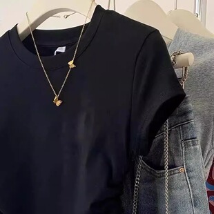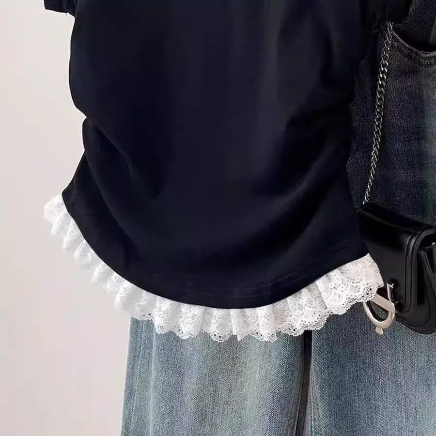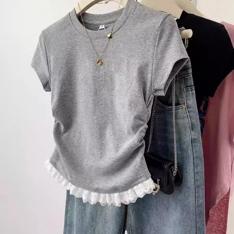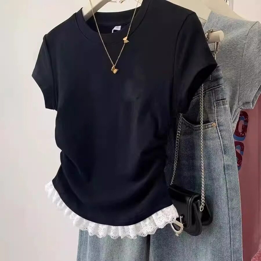 显瘦上衣 T恤女蕾丝拼接设计感小众修身 大码 200斤拼接褶皱正肩短袖