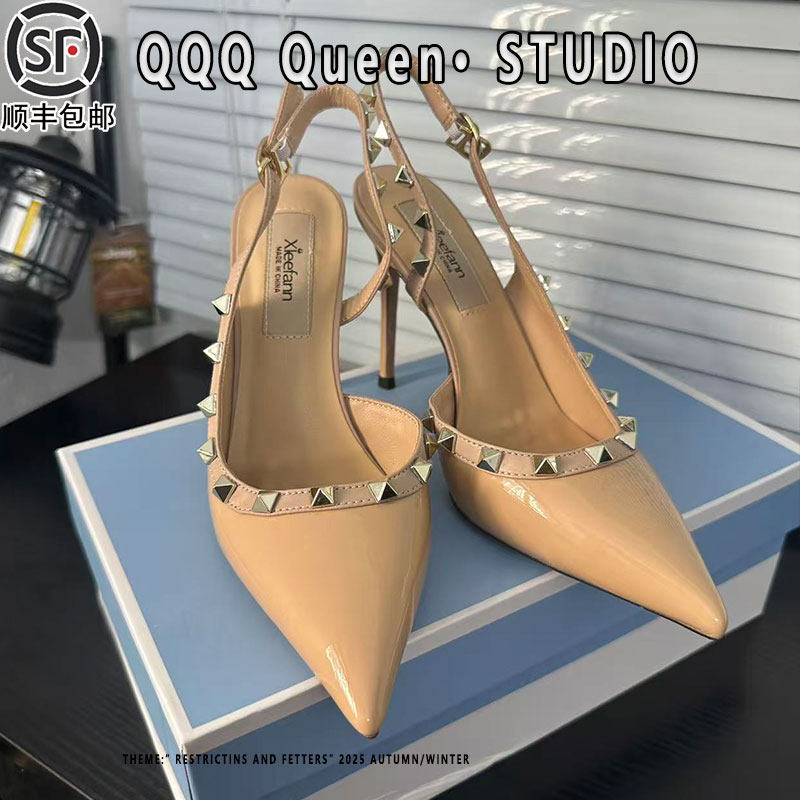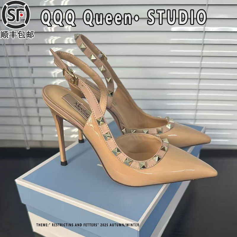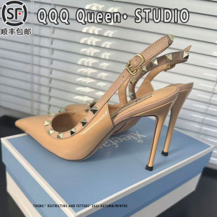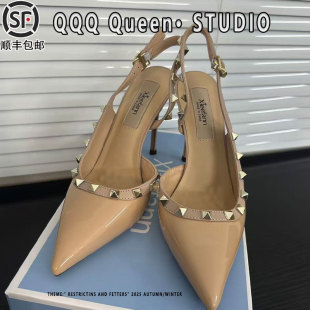女 女包头凉鞋 裸色尖头细跟高跟鞋 女铆钉2026春夏一字带扣性感单鞋