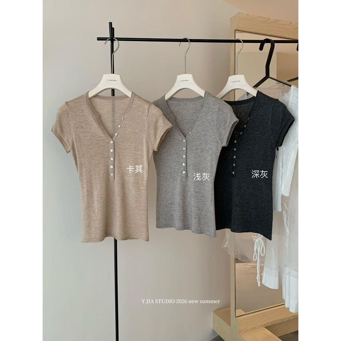 女春夏新款 显瘦卷边针织衫 休闲上衣 伊嘉韩系气质亨利领修身 Y.JIA