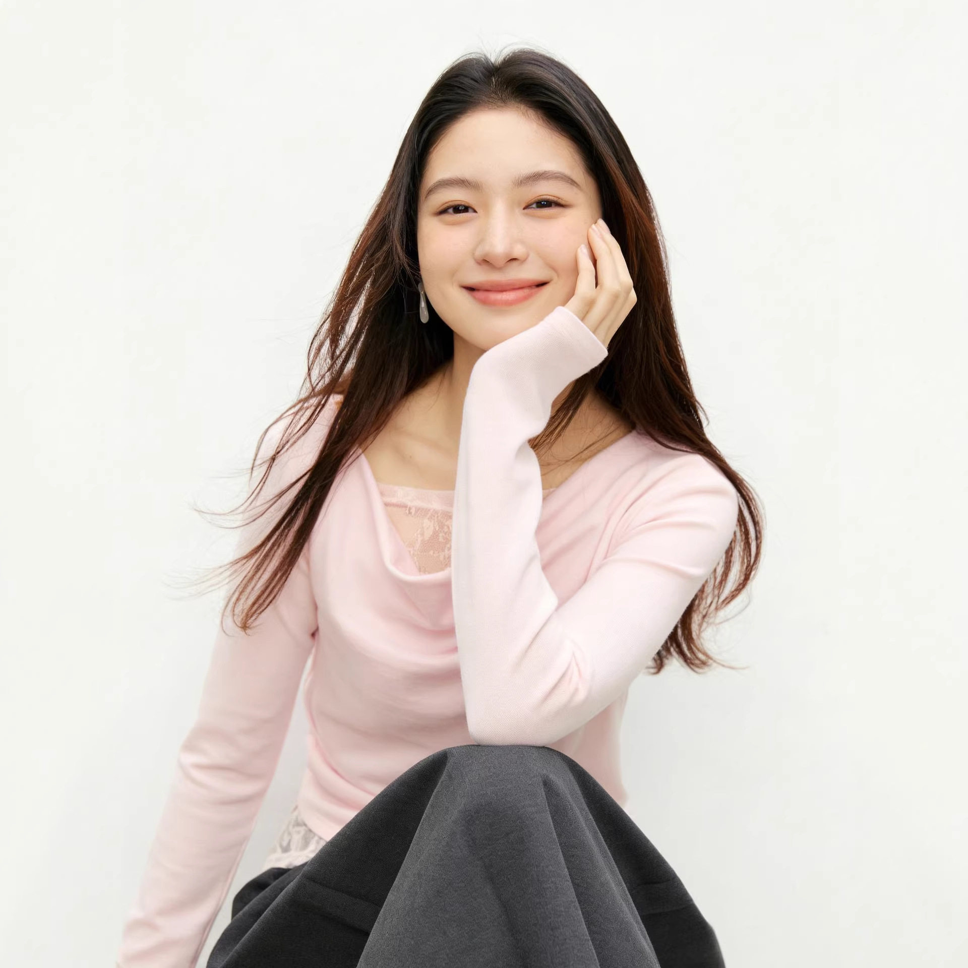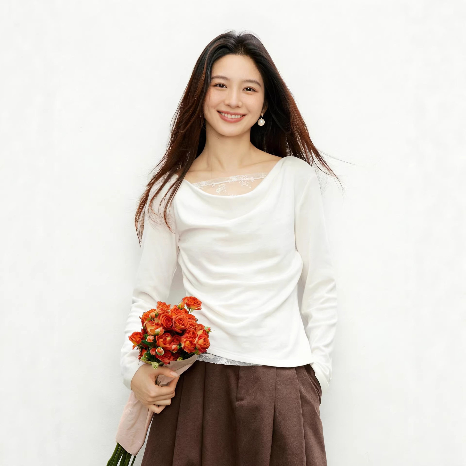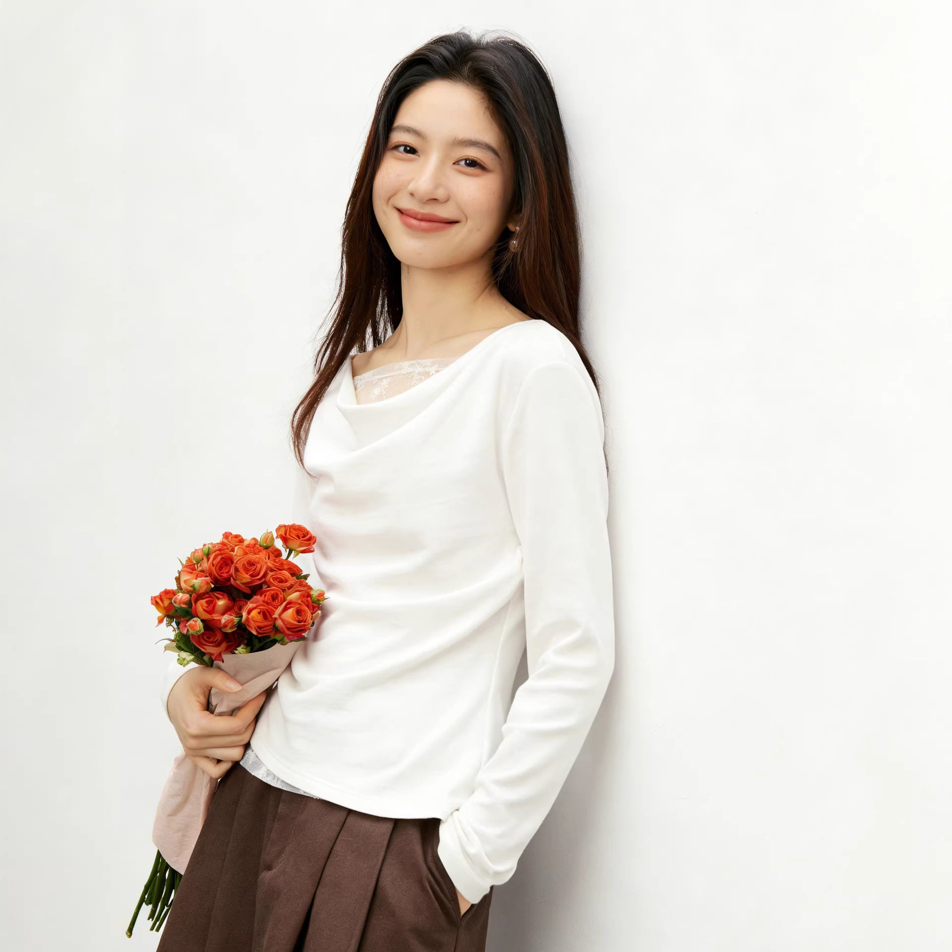 荡领抽皱长袖 女装 打底休闲显瘦上衣 蕾丝拼接T恤2026春夏新款 法式