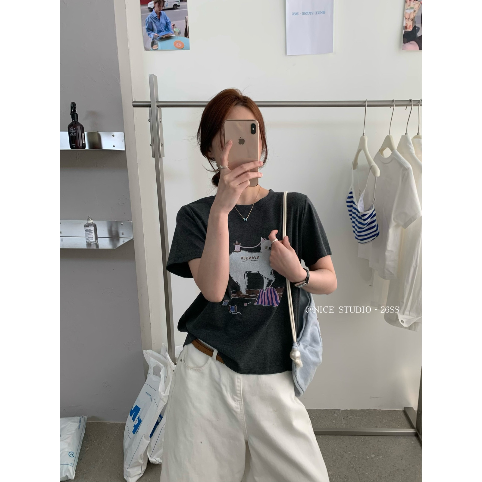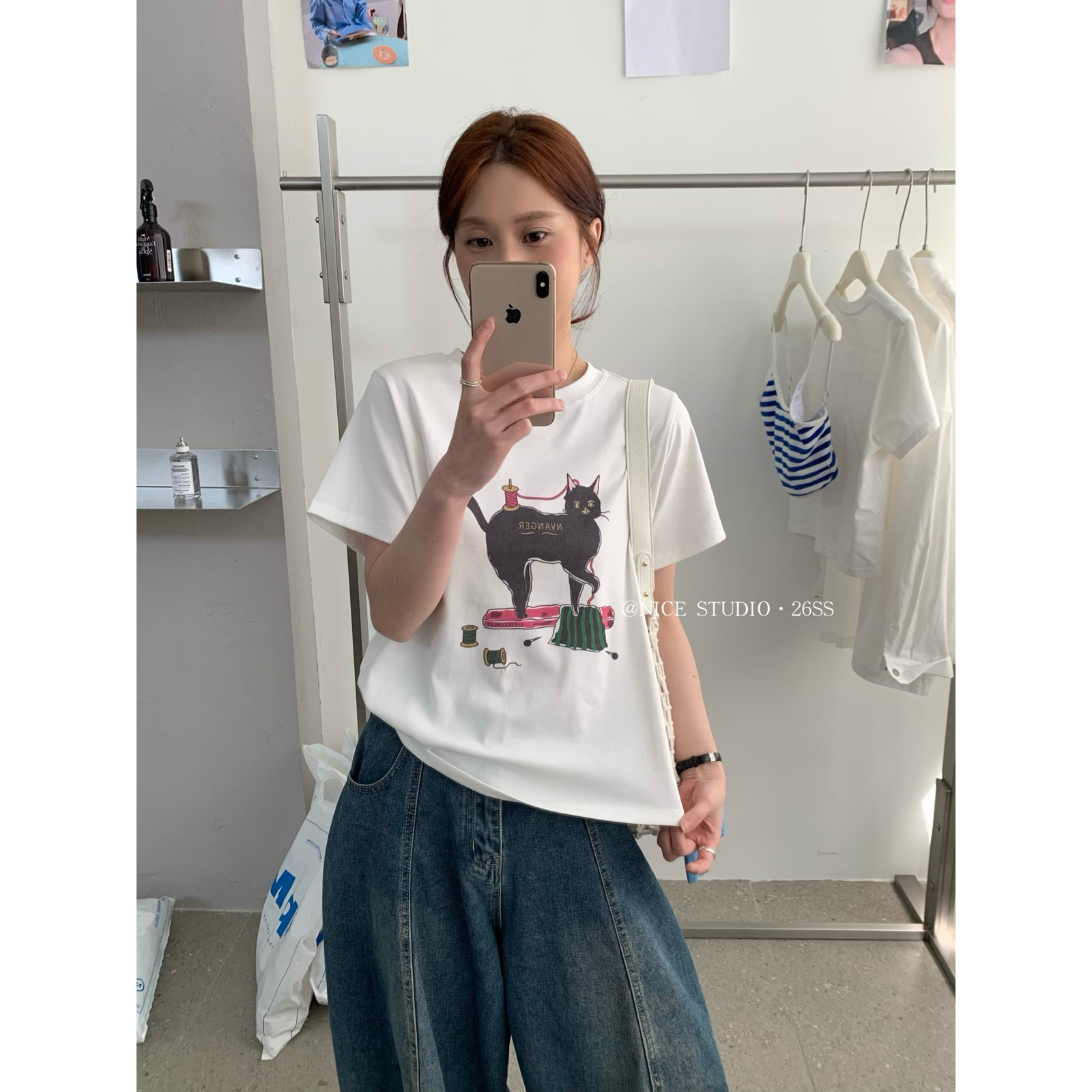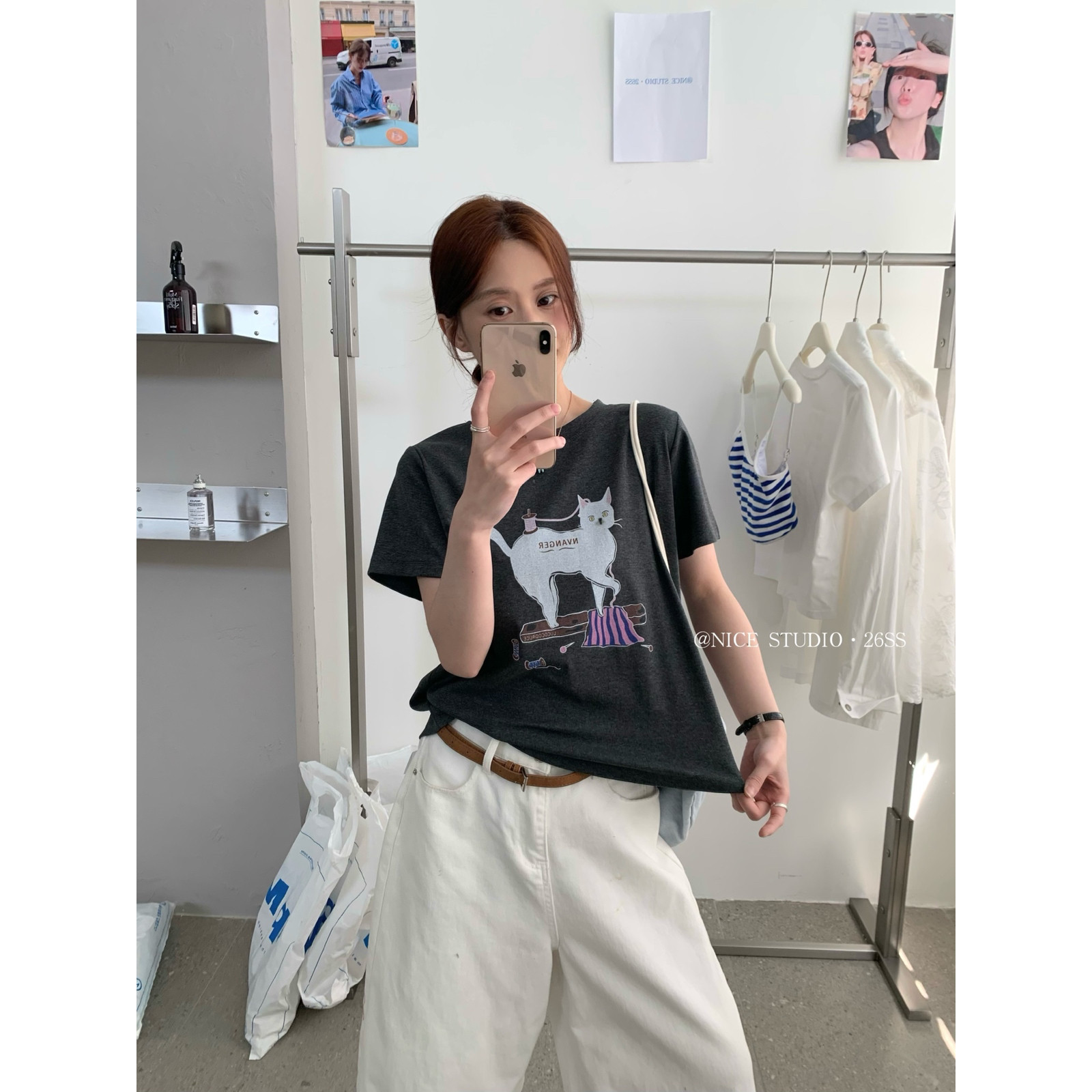 韩系卡通猫咪宽松百搭短袖 2026夏季 T恤女1227 STUDIO 奶思家NICE