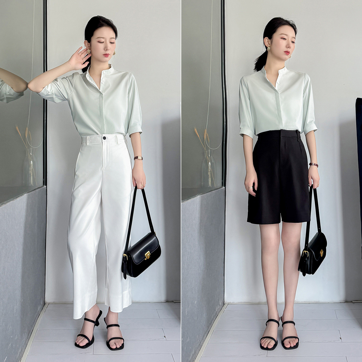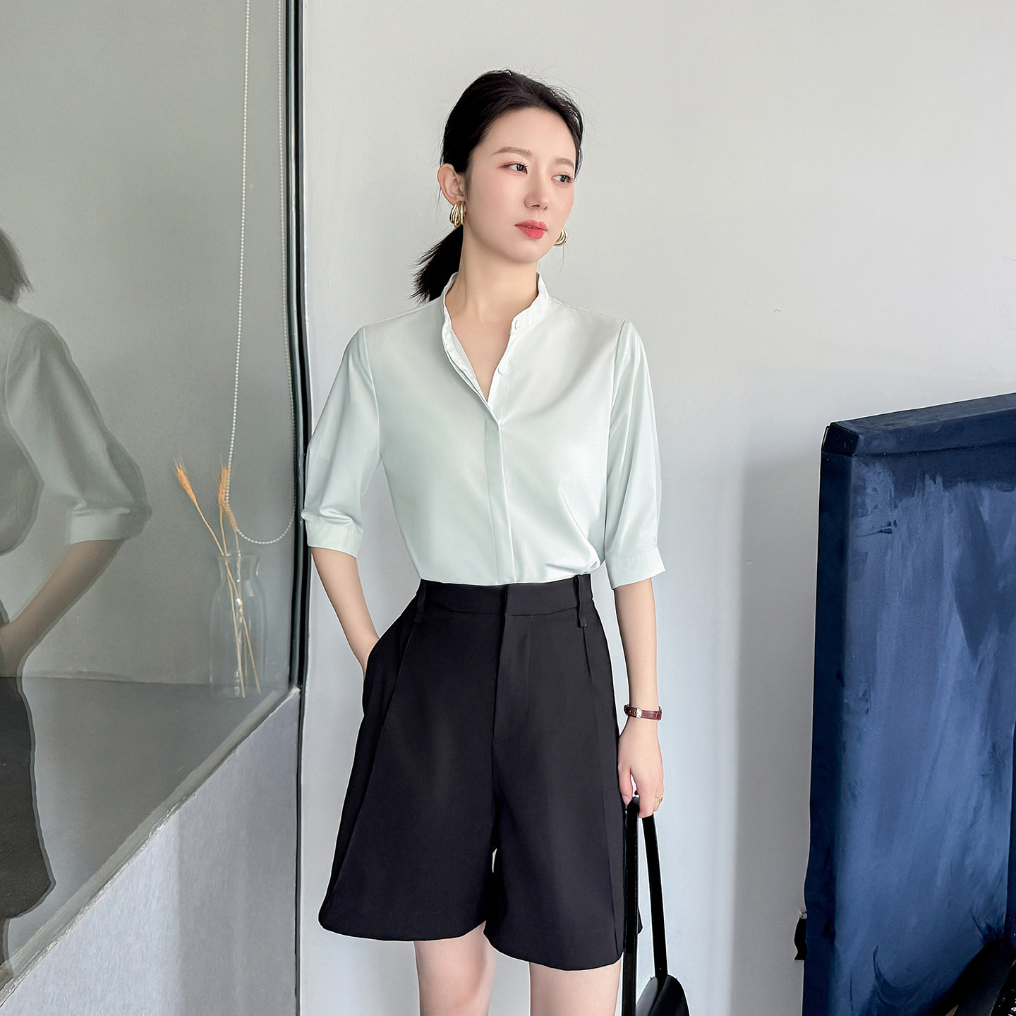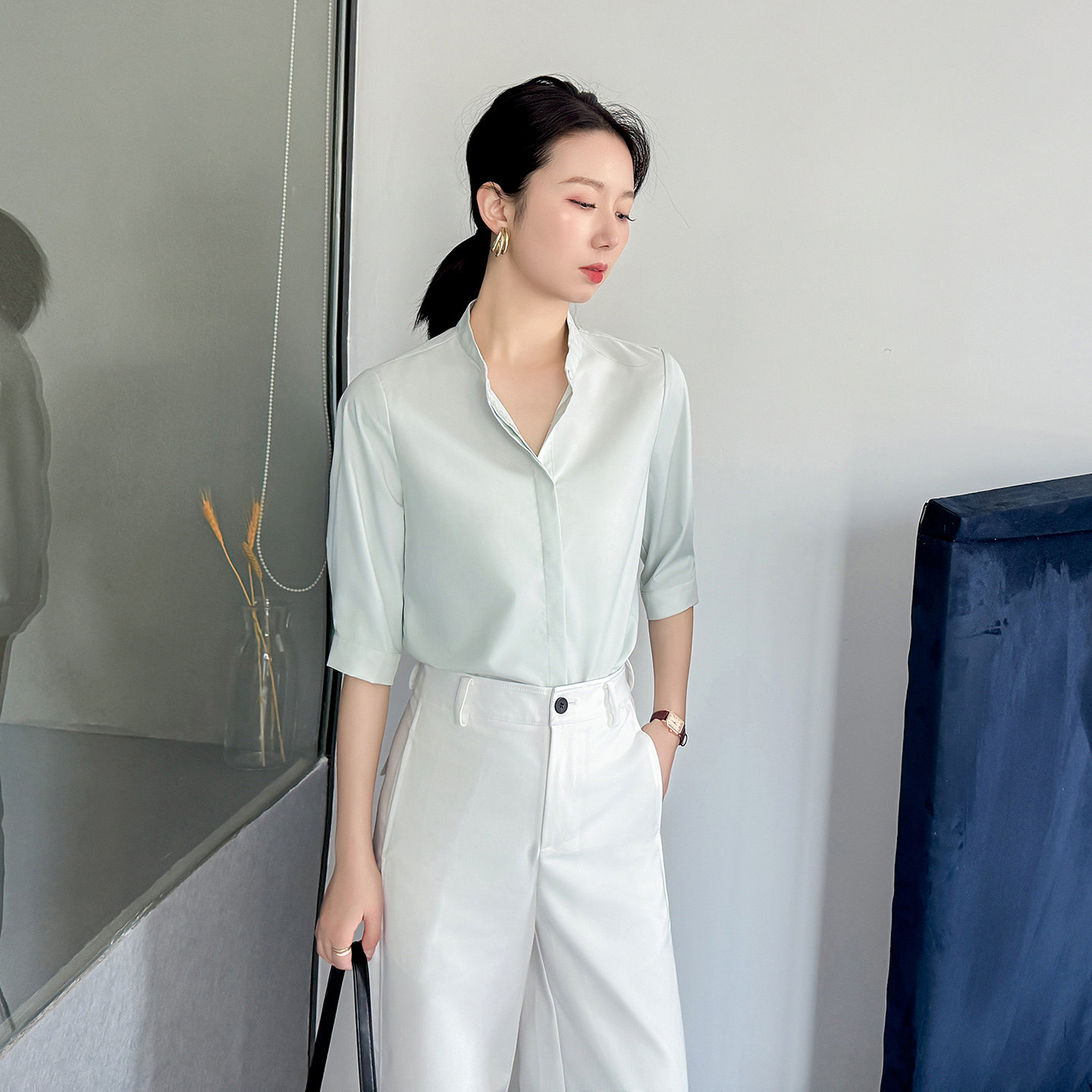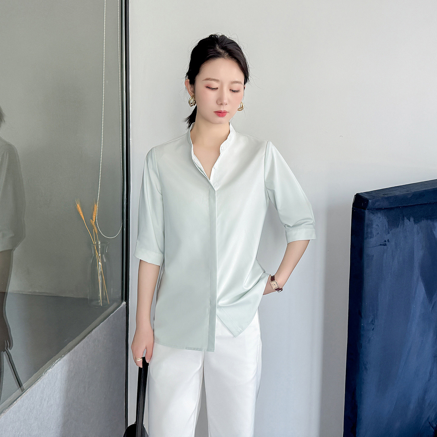 薄荷绿色衬衫 衬衣 女高级感气质风清新穿搭上班通勤高端立领五分袖