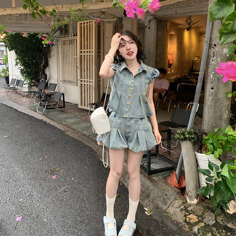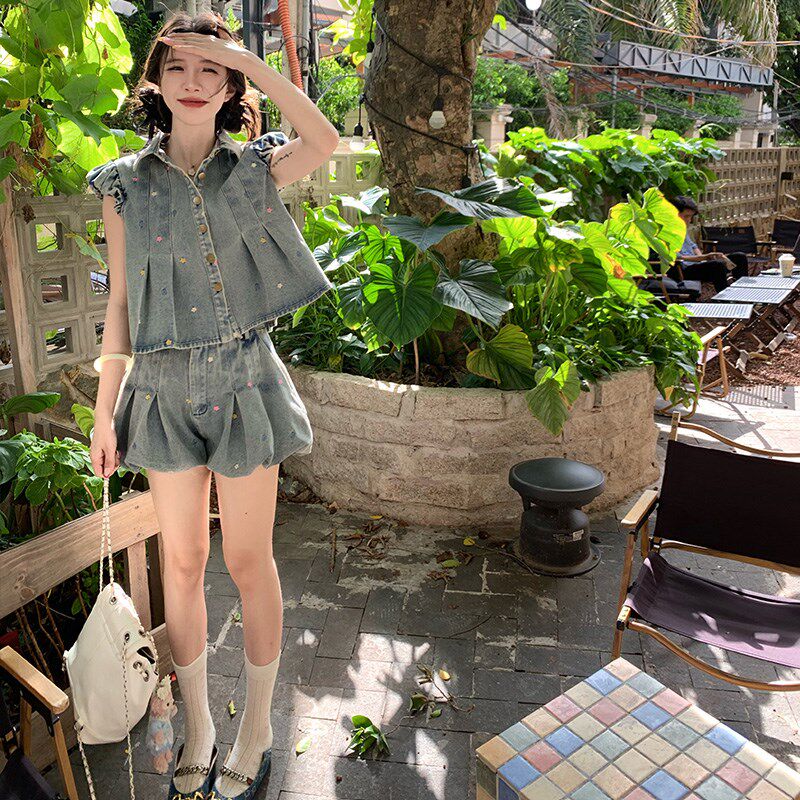 花花同学会 搭配一整套时尚 牛仔套装 夏装 两件套 女2024新款 渔小平