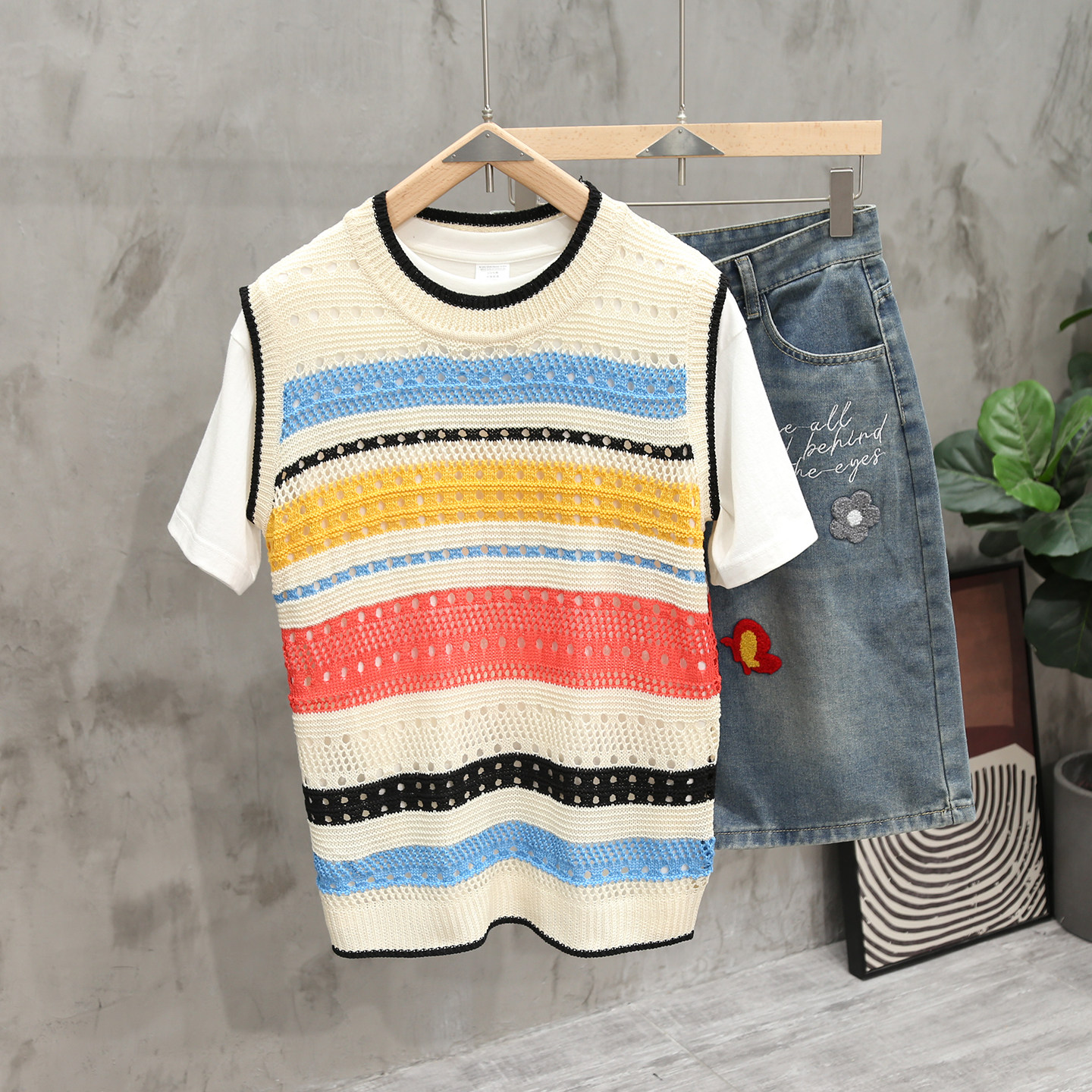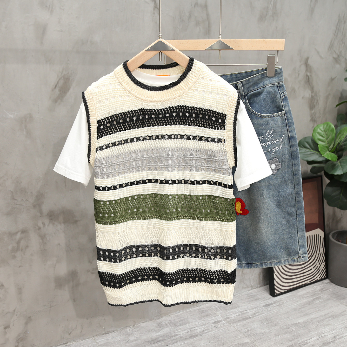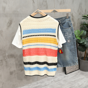 宽松休闲上衣潮 叠穿背心男女情侣装 夏季 镂空透气条纹撞色复古无袖