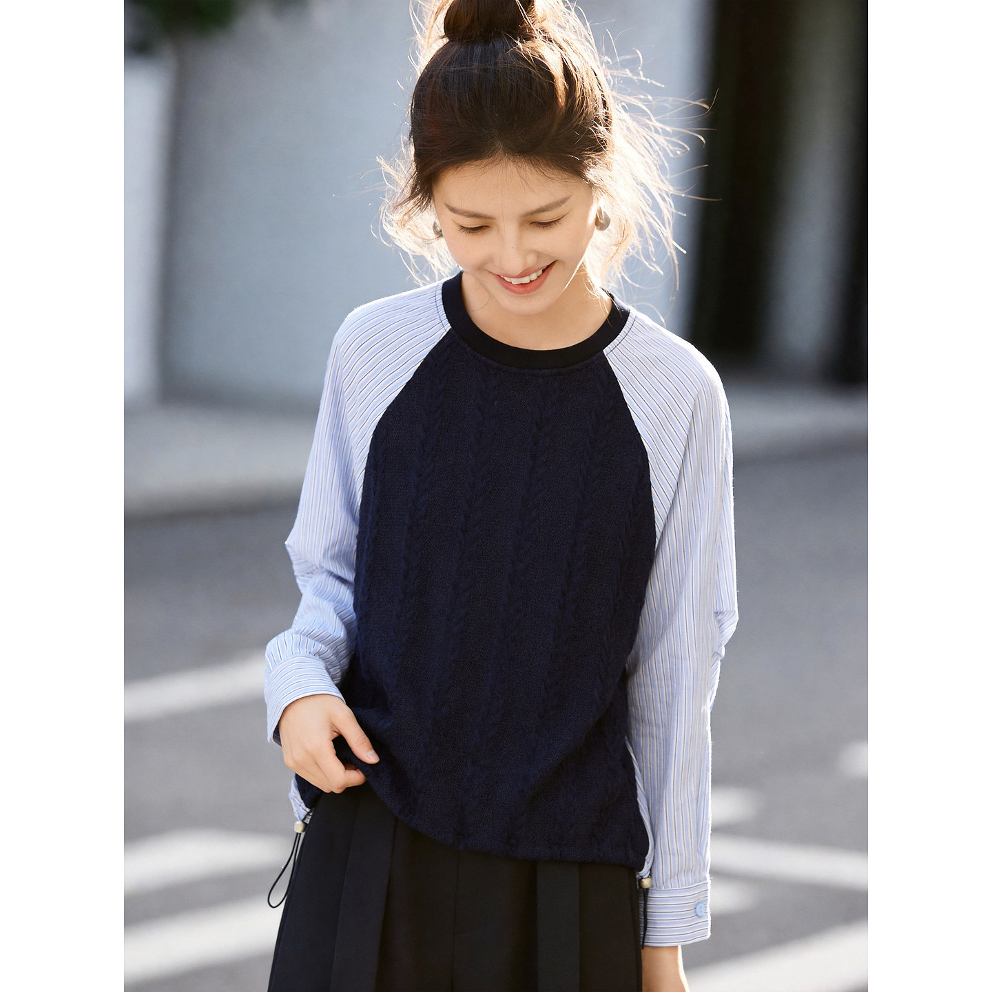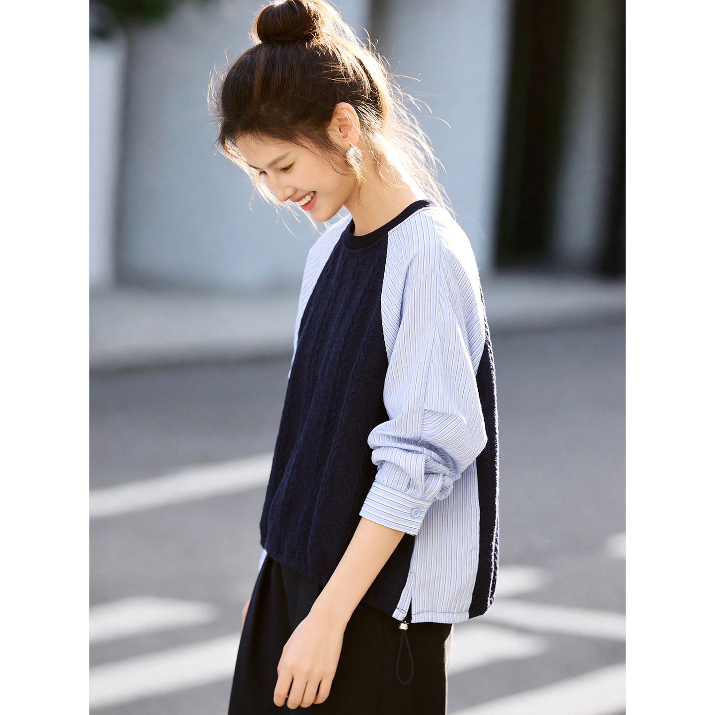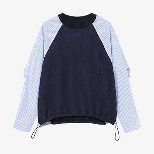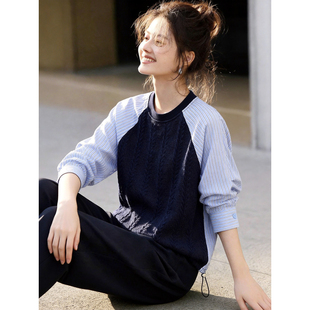 女灰色麻花针织宽松显瘦抽绳上衣 假两件针织衫 百家好2026春季 新款