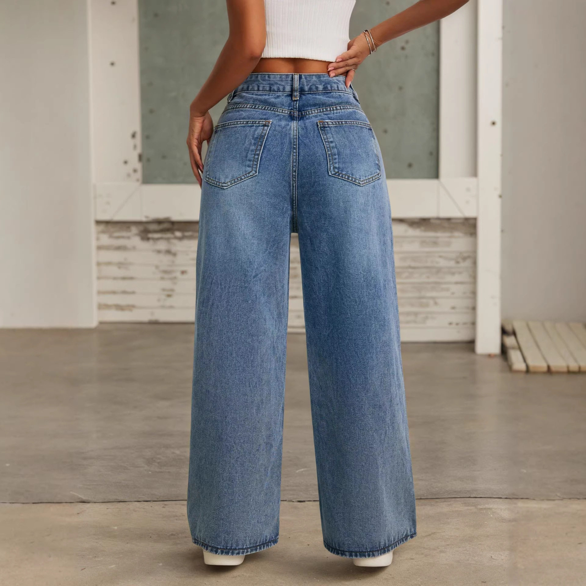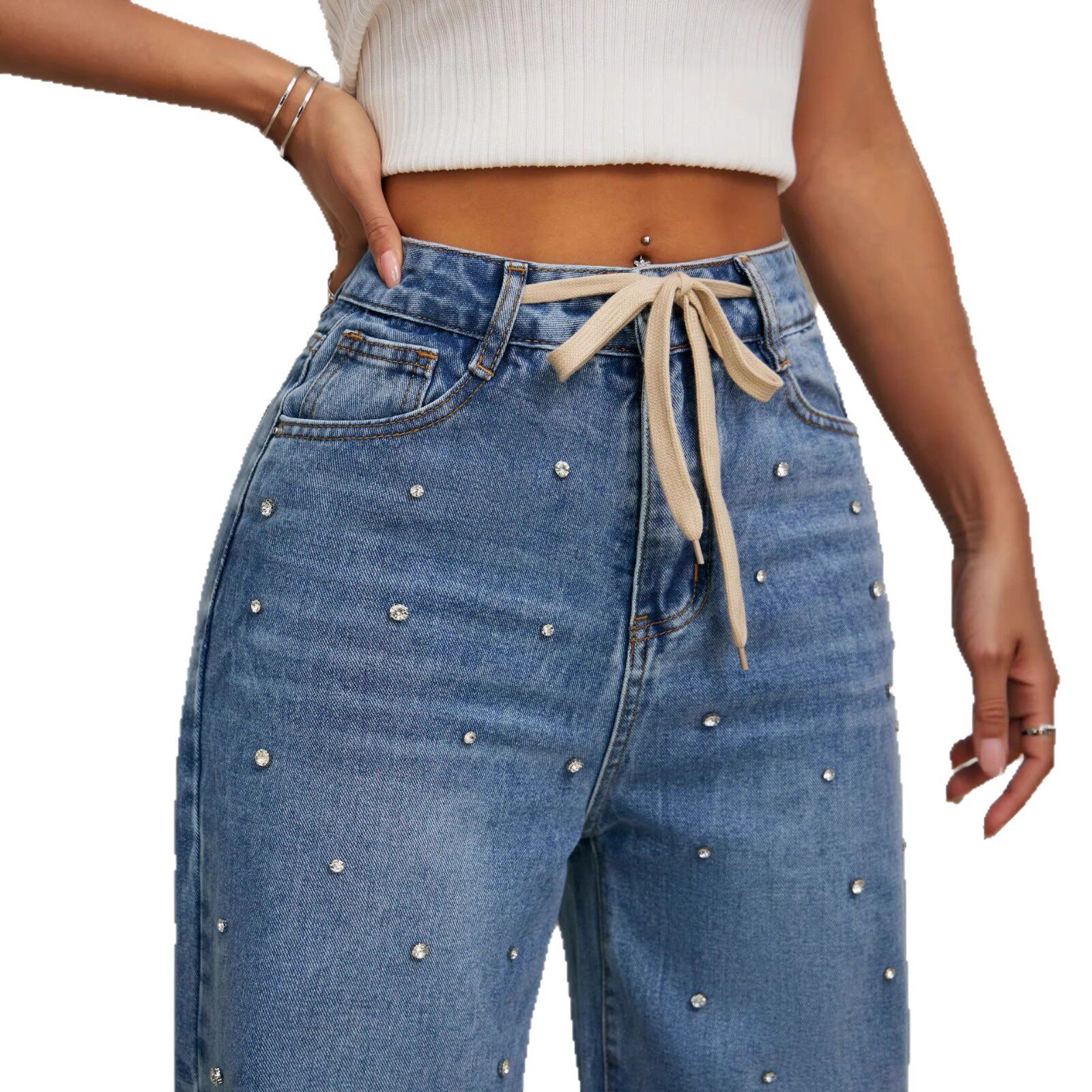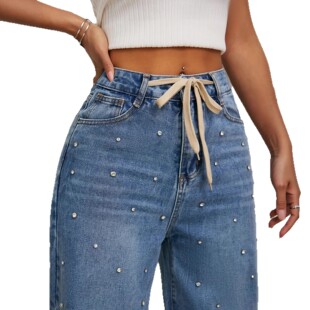 女夏高腰宽松阔腿拖地裤 Women Pants钉珠牛仔裤 Jean 带铢 Denim