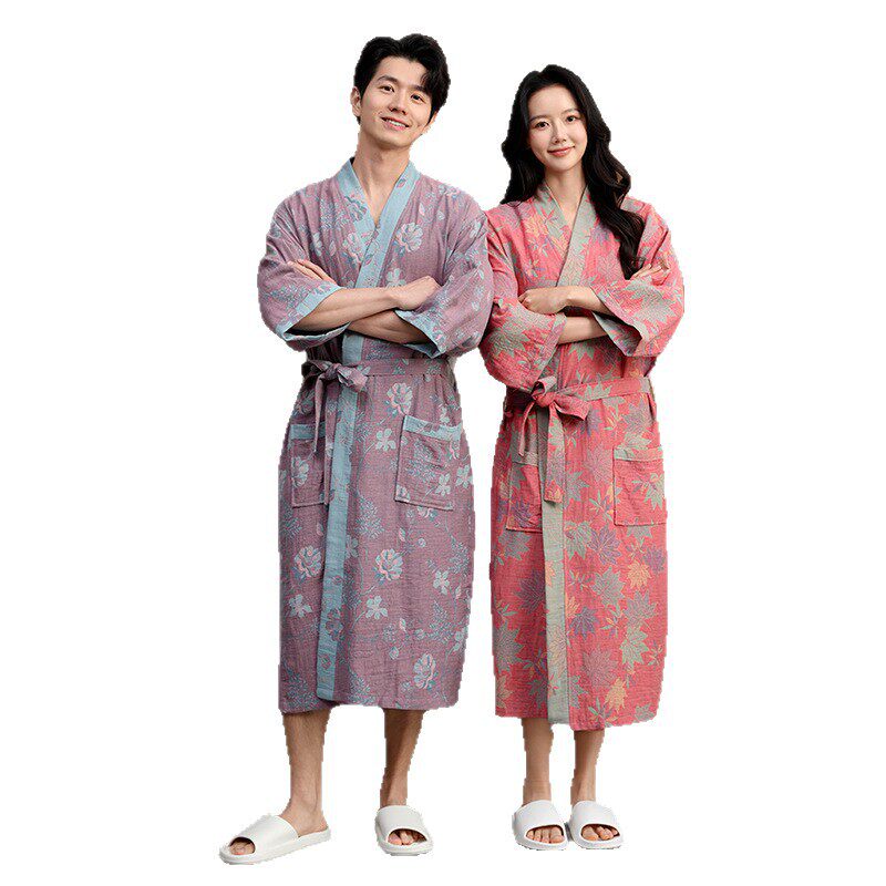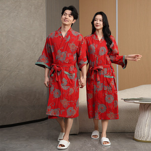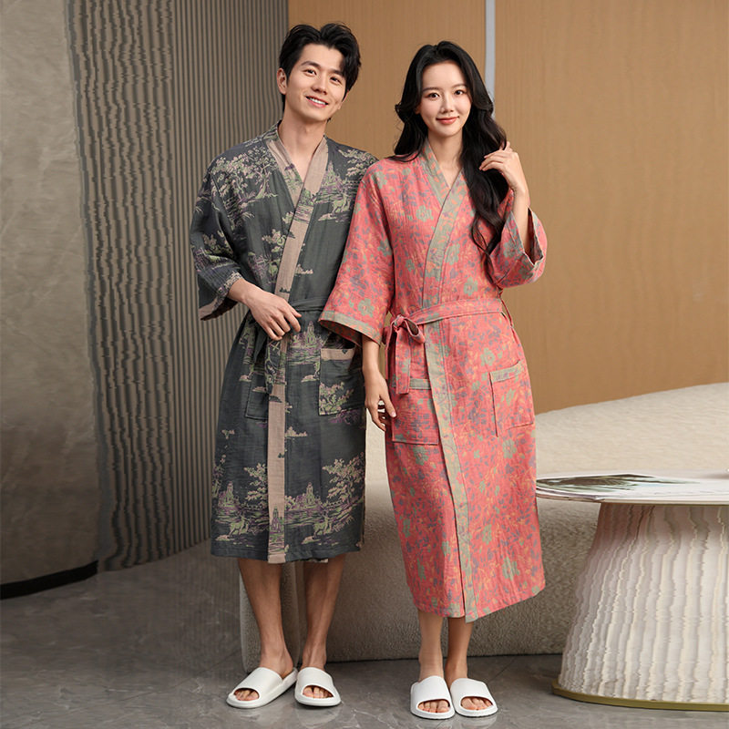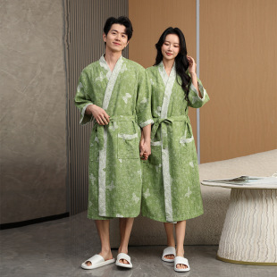 双层纱布纯棉汉服交领右衽睡袍美容院男女七分袖 国风酒店情侣浴袍