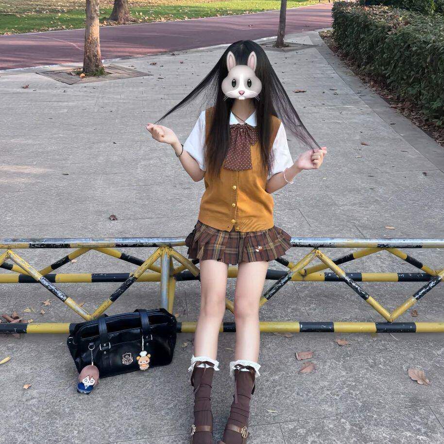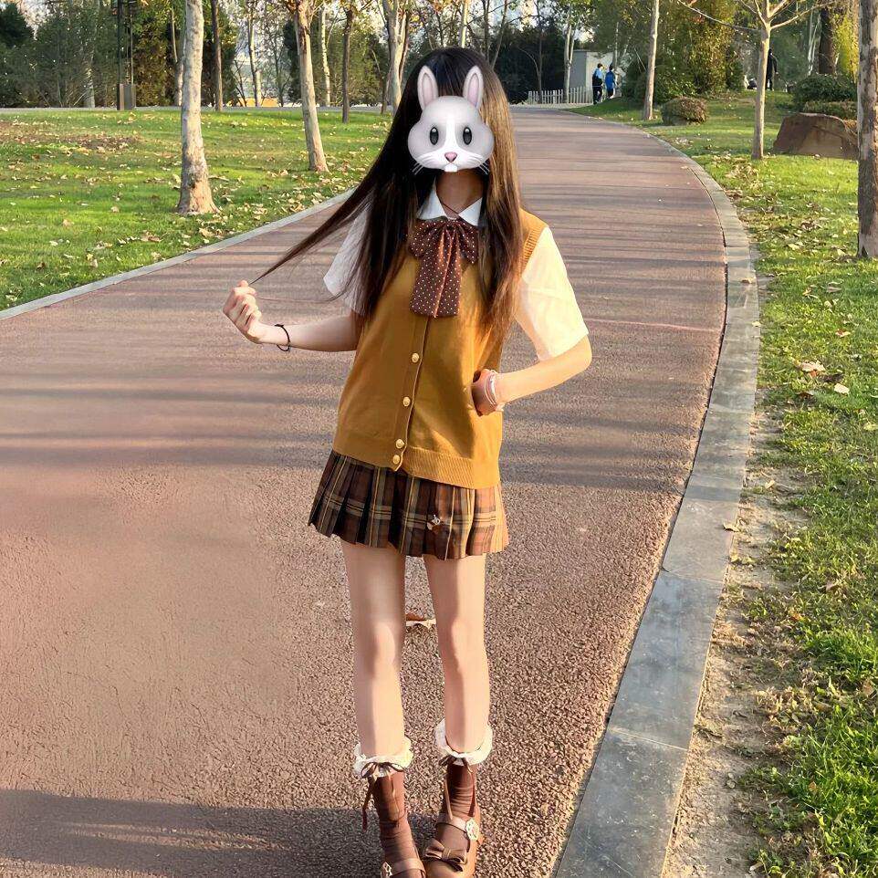 日系JK制服马甲背心软妹叠穿早秋女短袖 上衣内搭焦糖可颂格裙套装