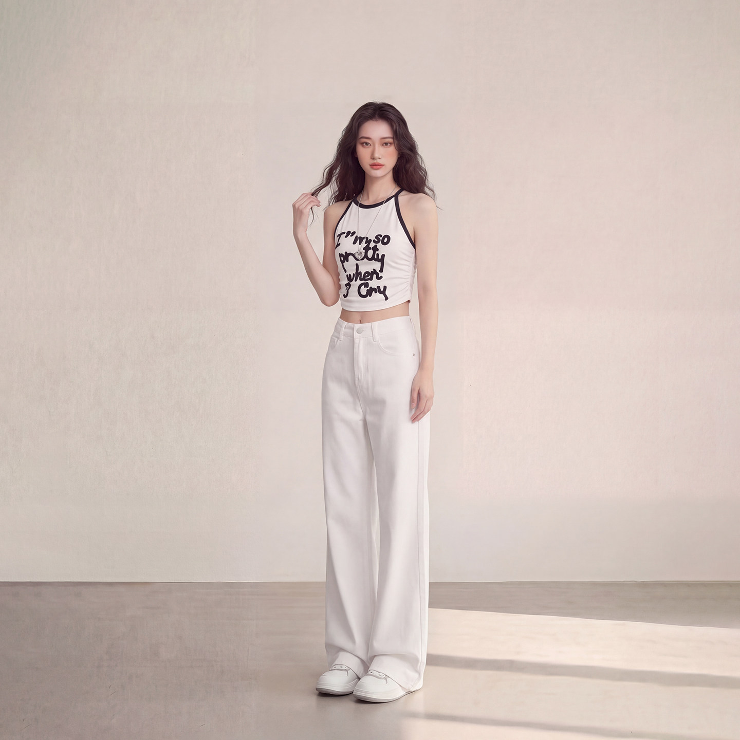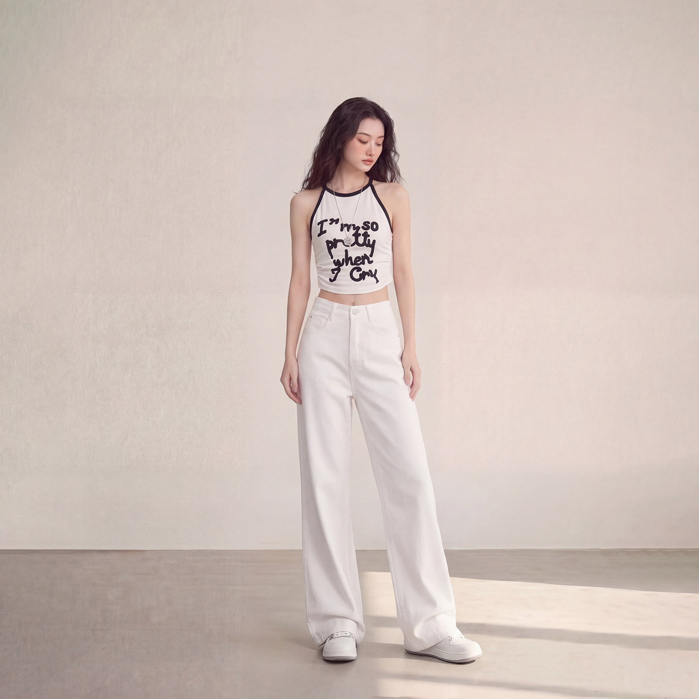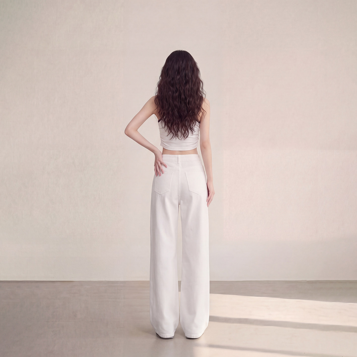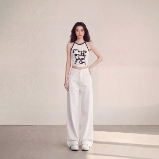 休闲裤 艾格极简风白色高腰阔腿牛仔裤 女宽松显瘦百搭垂感拖地裤