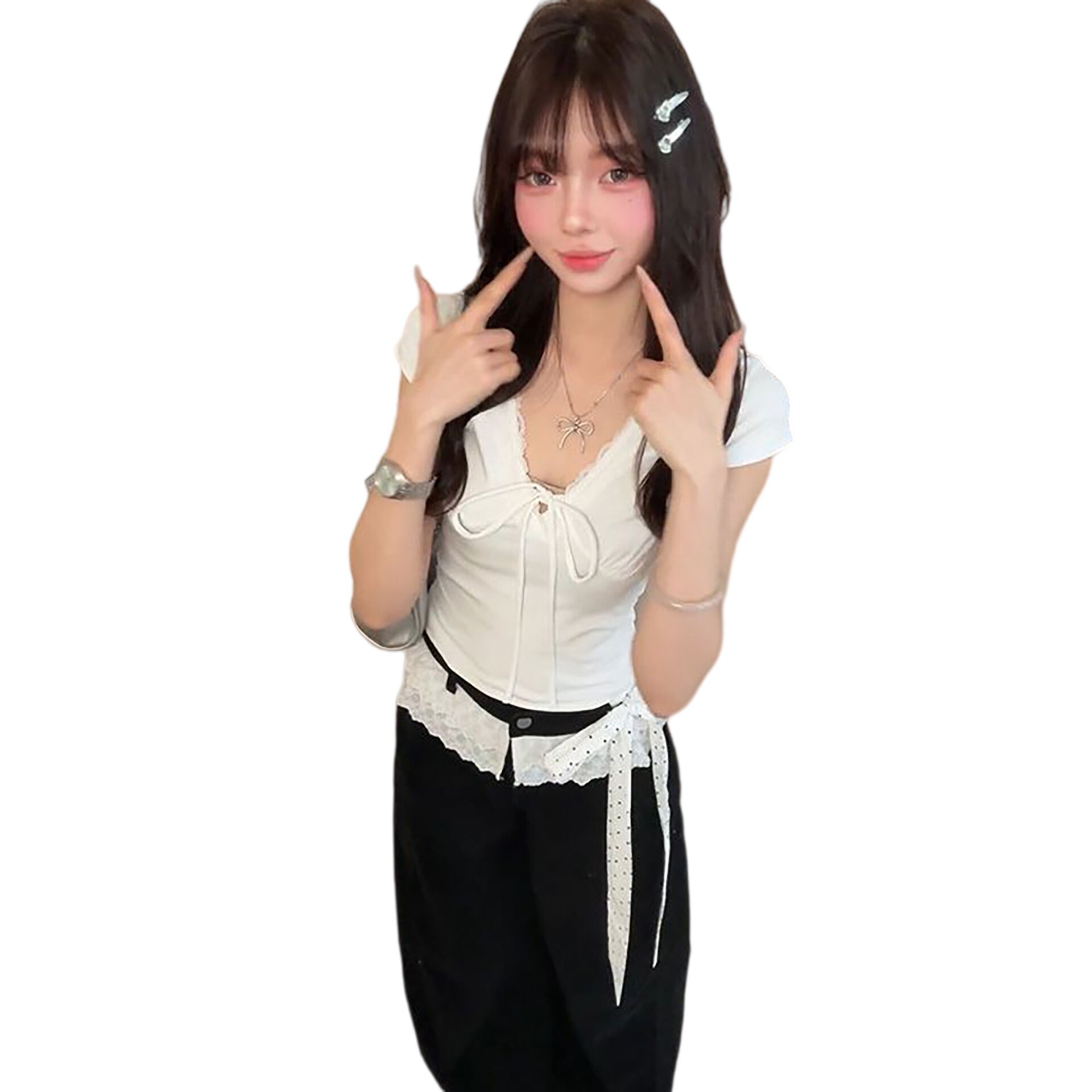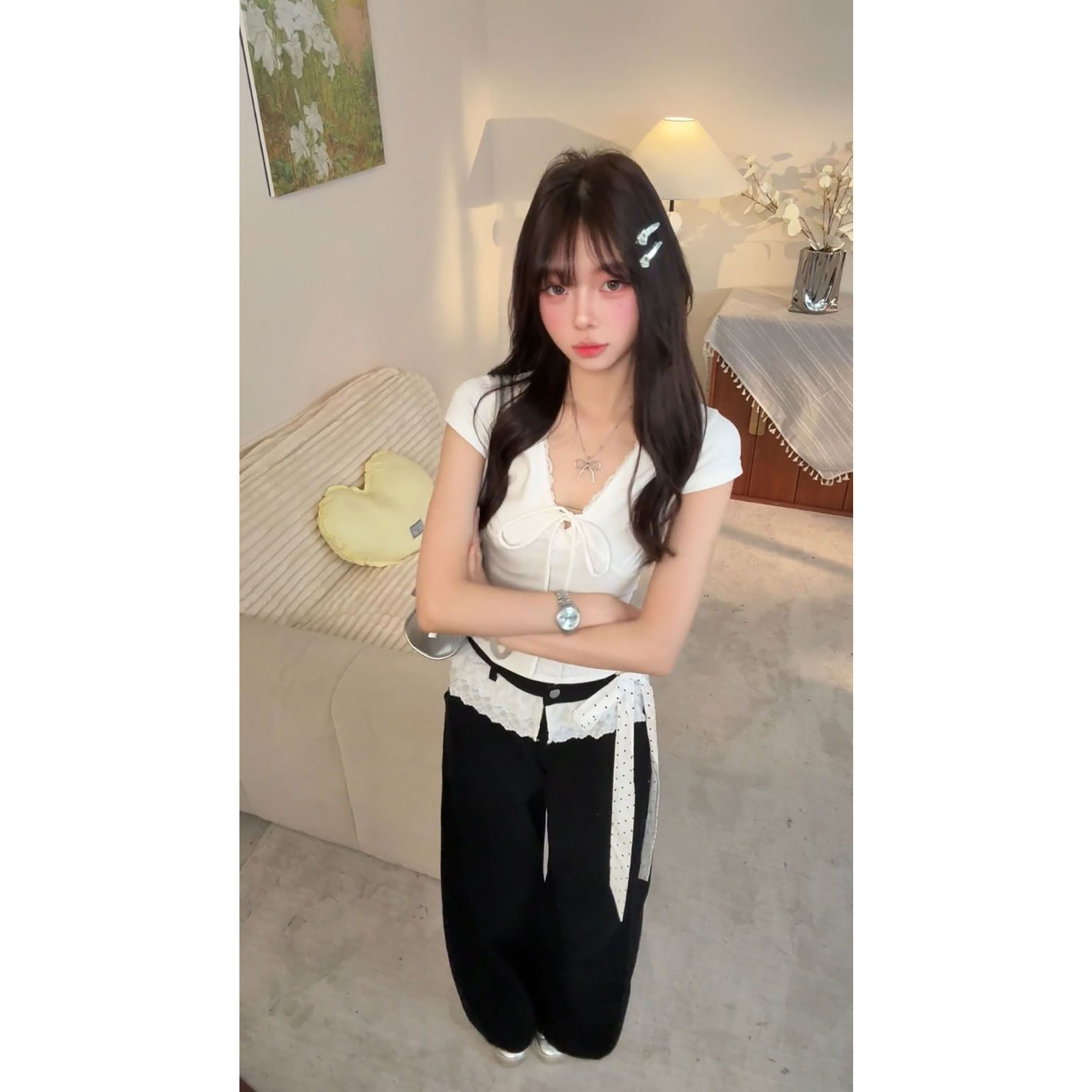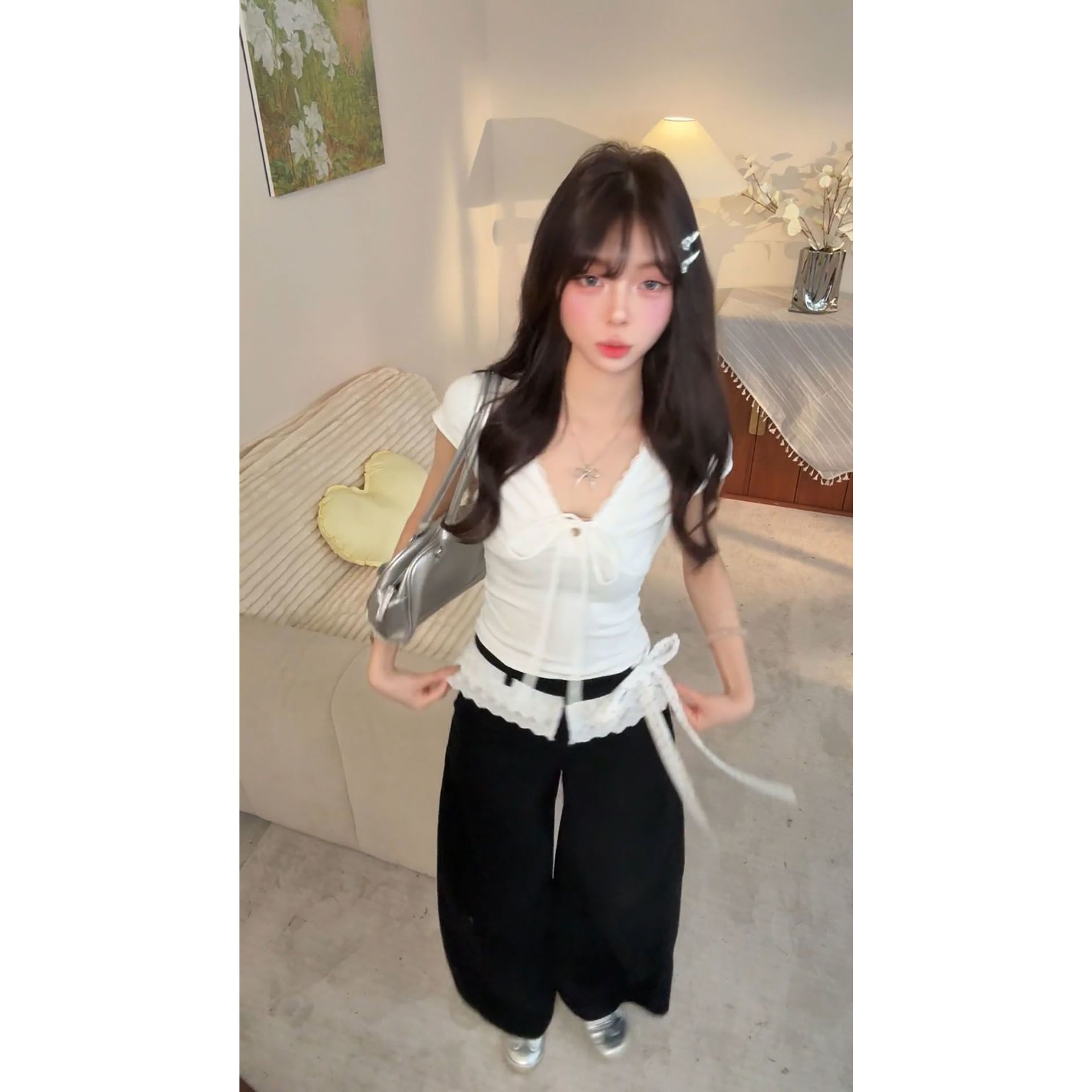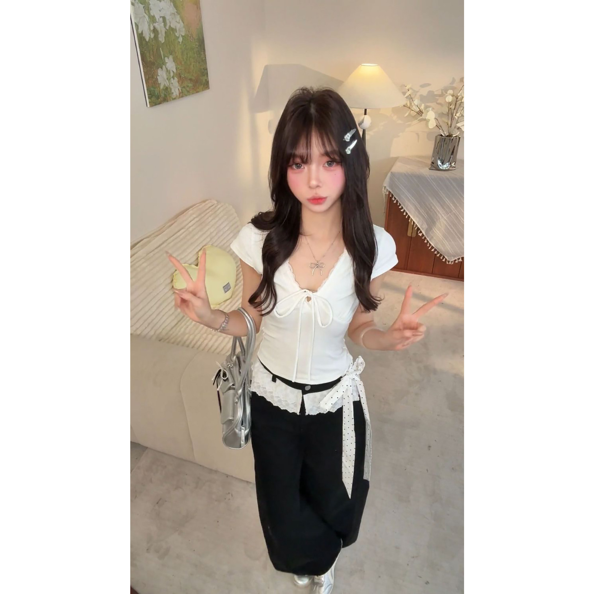 两件套 韩系穿搭一整套绑带正肩V领上衣搭配高腰长裤 2026夏季 新款