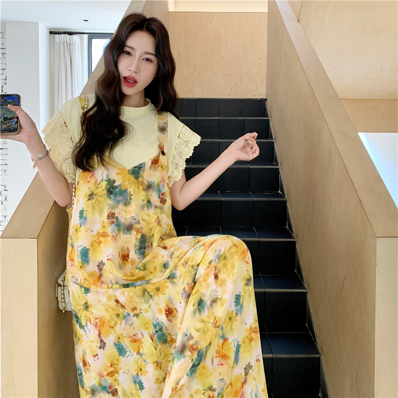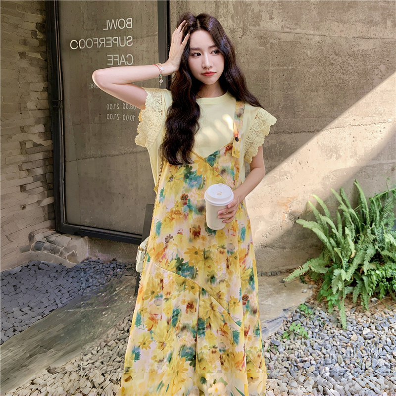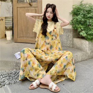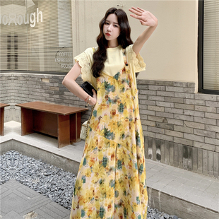 减龄海边度假风阔腿连体裙裤 法式 田园风黄色碎花连衣裙女2026夏季