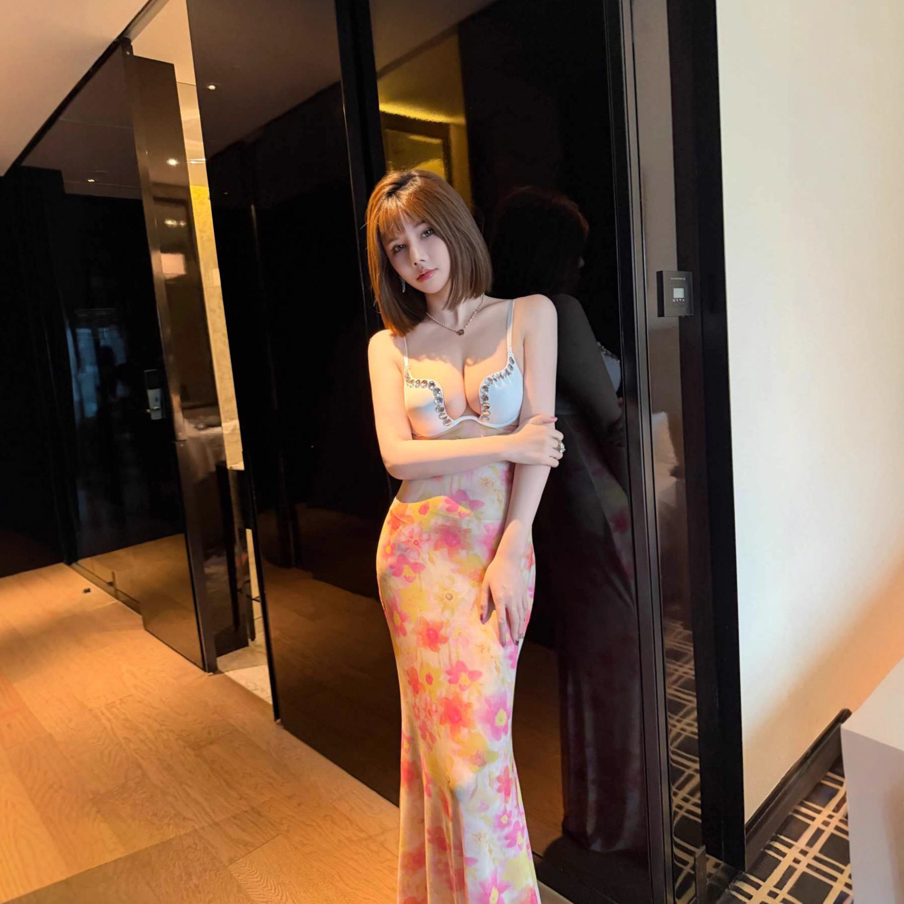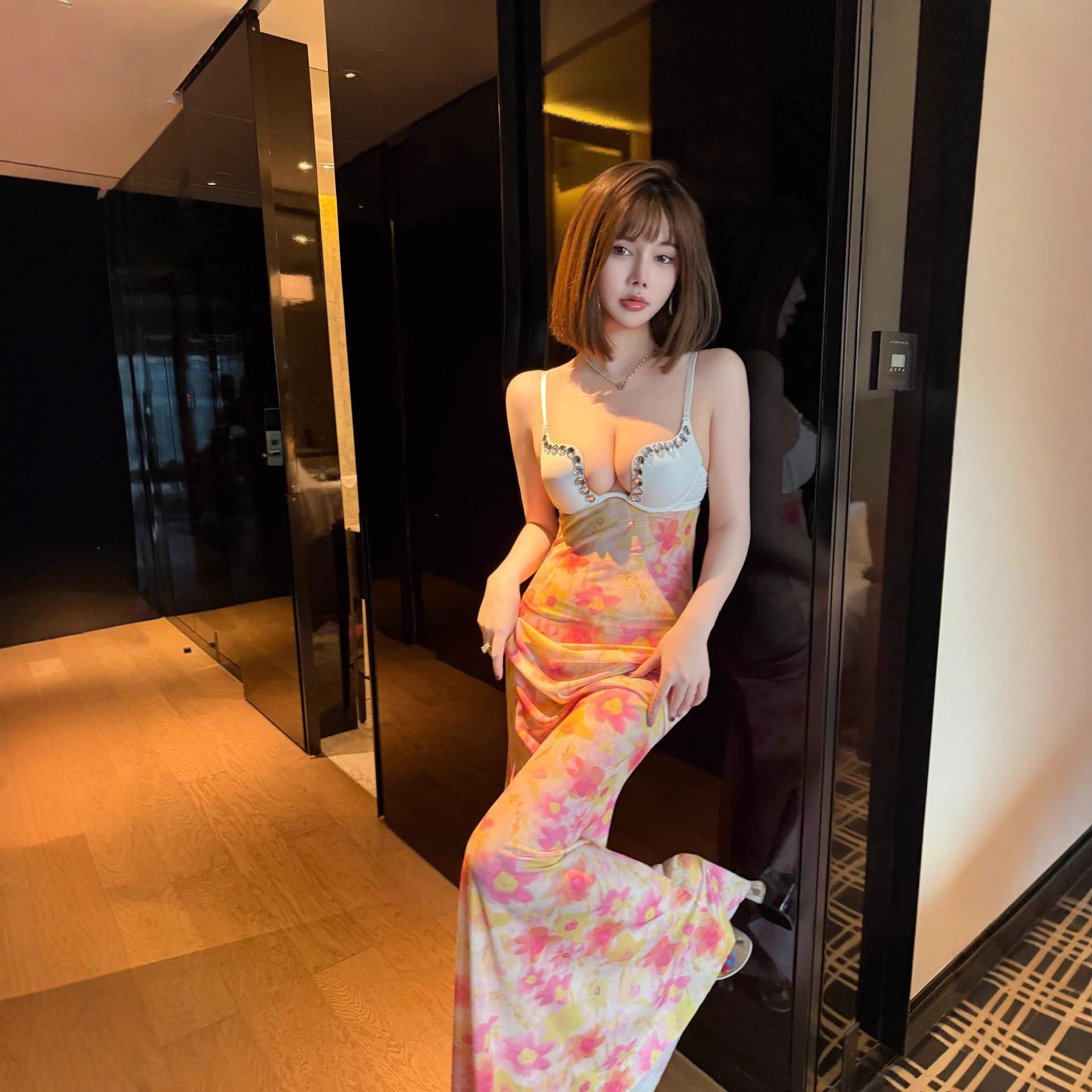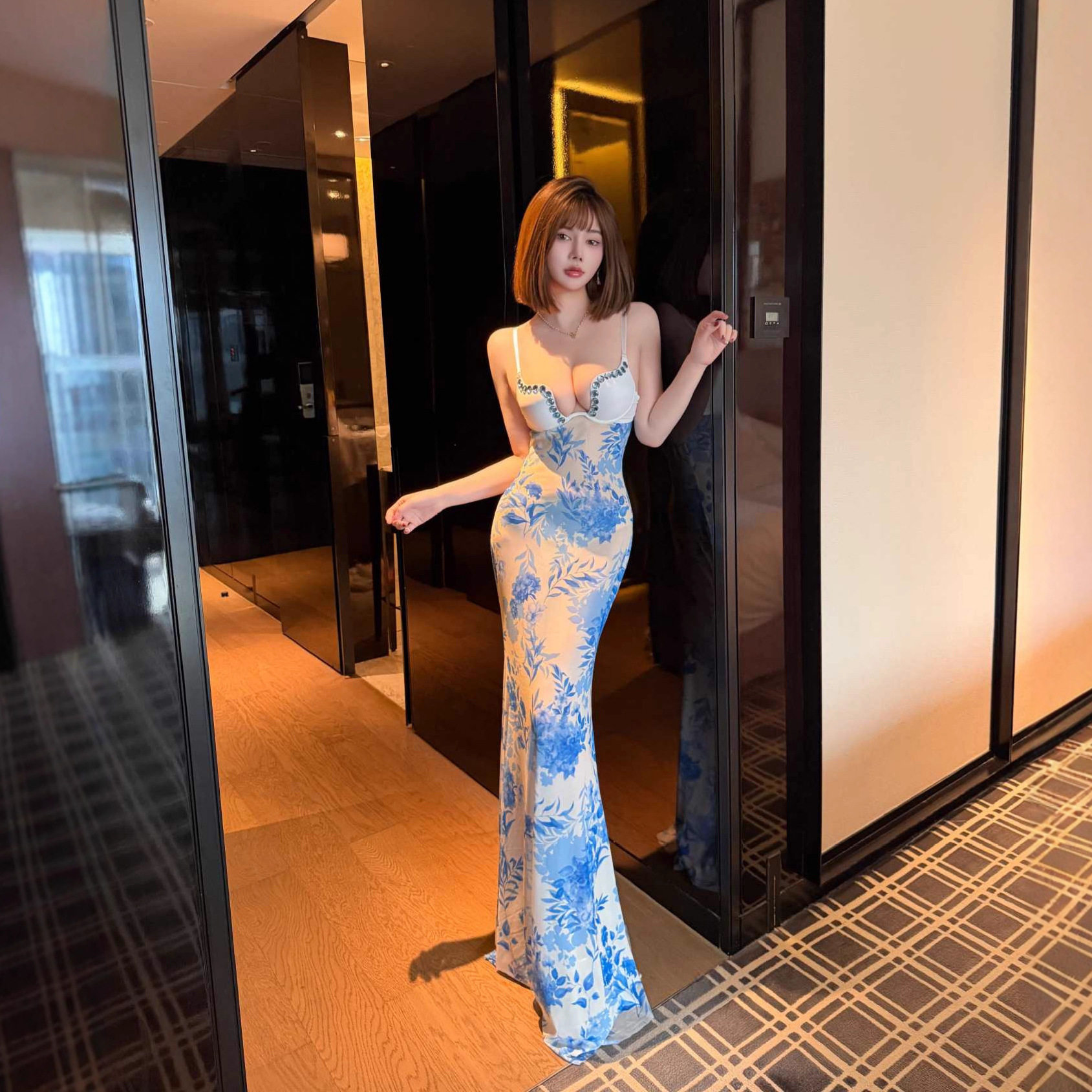 夜场性感鱼尾长裙青花瓷印花网纱弹力面料自带聚拢内衣长款 礼服裙
