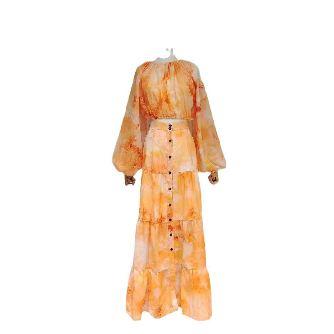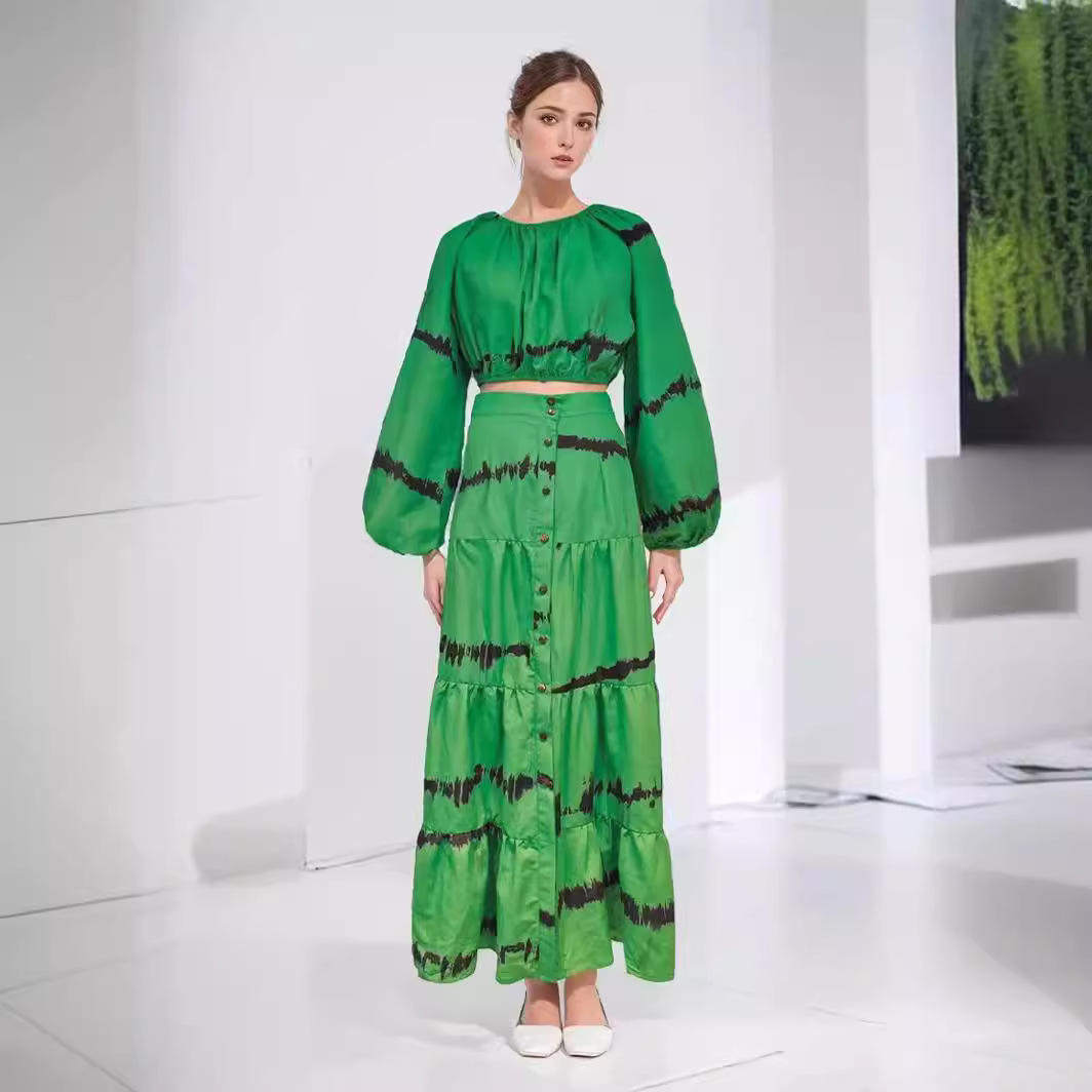 印花上衣配单排扣长裙套装 圆领灯笼袖 女 欧美外贸跨境2024春季 新款