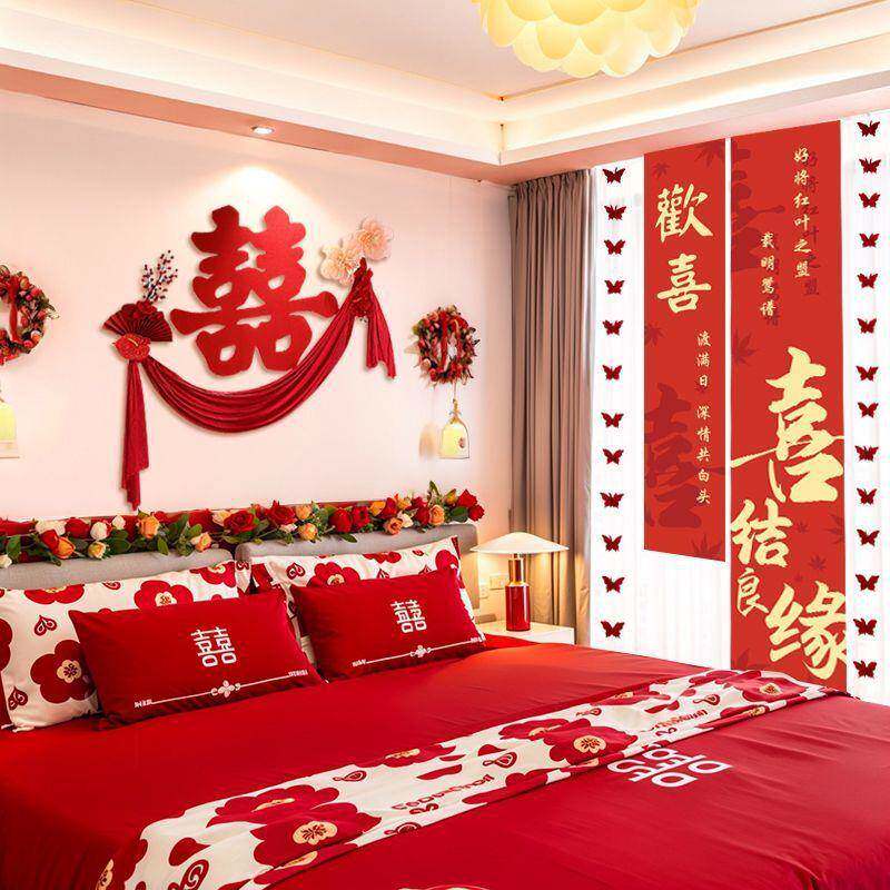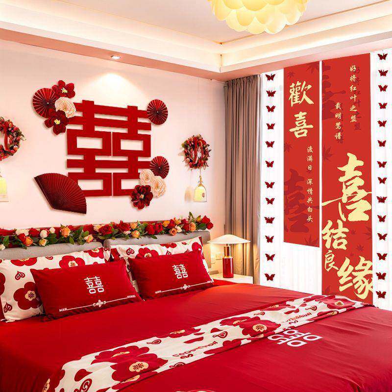 婚房装 饰布置女方卧室男方新房间床头背景墙结婚长条喜字拉花套装