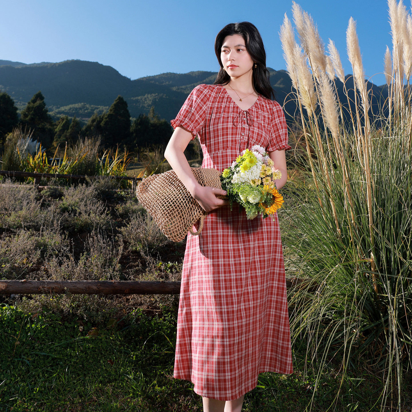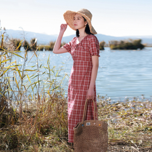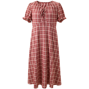 橙红格纹连衣裙V领短袖 三彩若潮大码 新款 2026夏季 收腰胖MM 女装