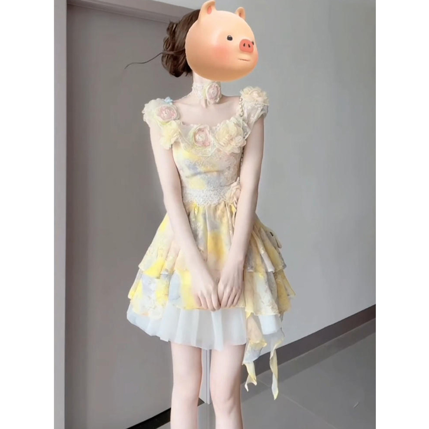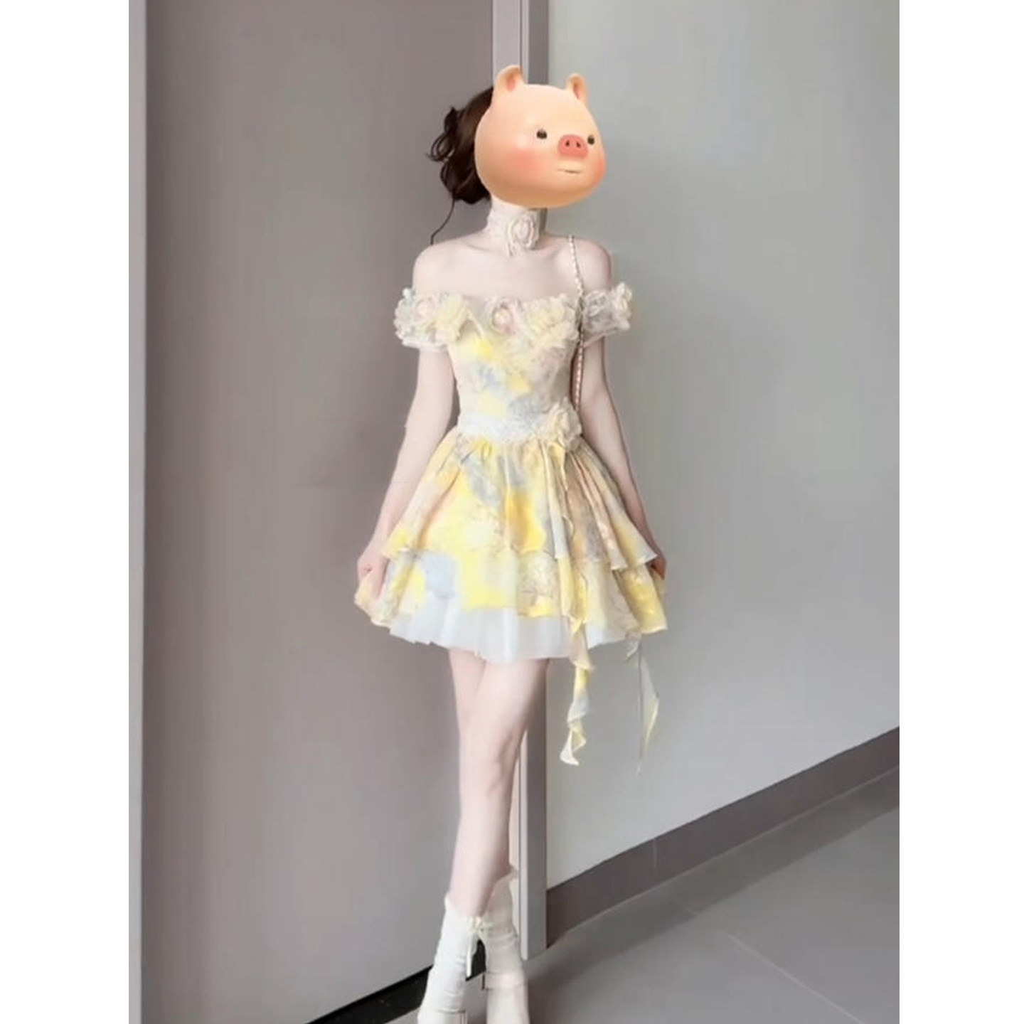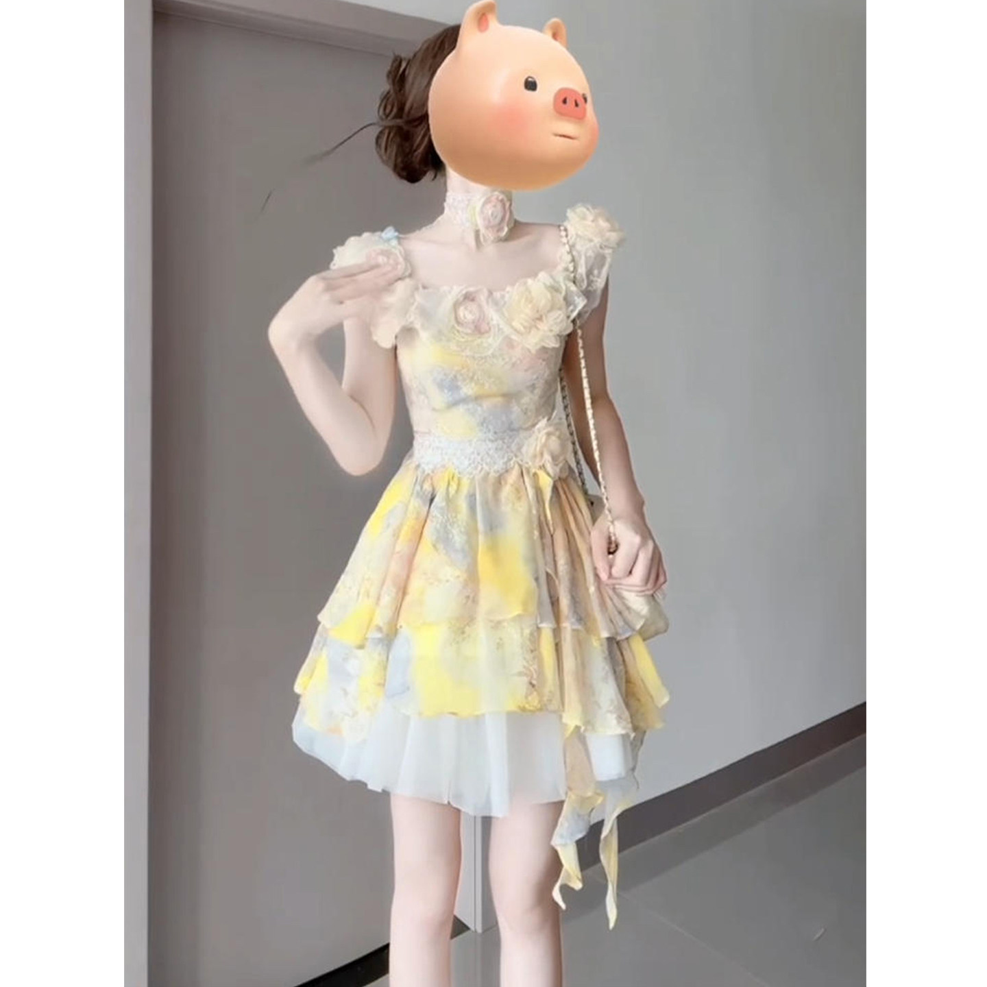 重工蕾丝拼接短裙子 甜美一字肩花朵连衣裙女26年夏季 XZY 微胖法式