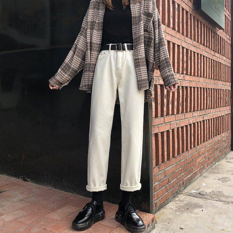 显瘦加绒阔腿老爹裤 高腰大码 女春秋直筒宽松2024新款 米白色牛仔裤