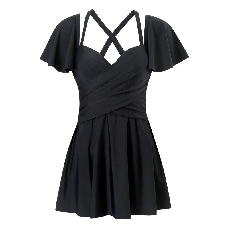 胖mm带钢托休闲黑色遮肚显瘦纯色 微胖大码 泡温泉泳衣女款 连体裙式