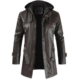 机车服风衣加绒加厚大衣外套 中长款 欧美大码 连帽真皮皮衣男秋冬季