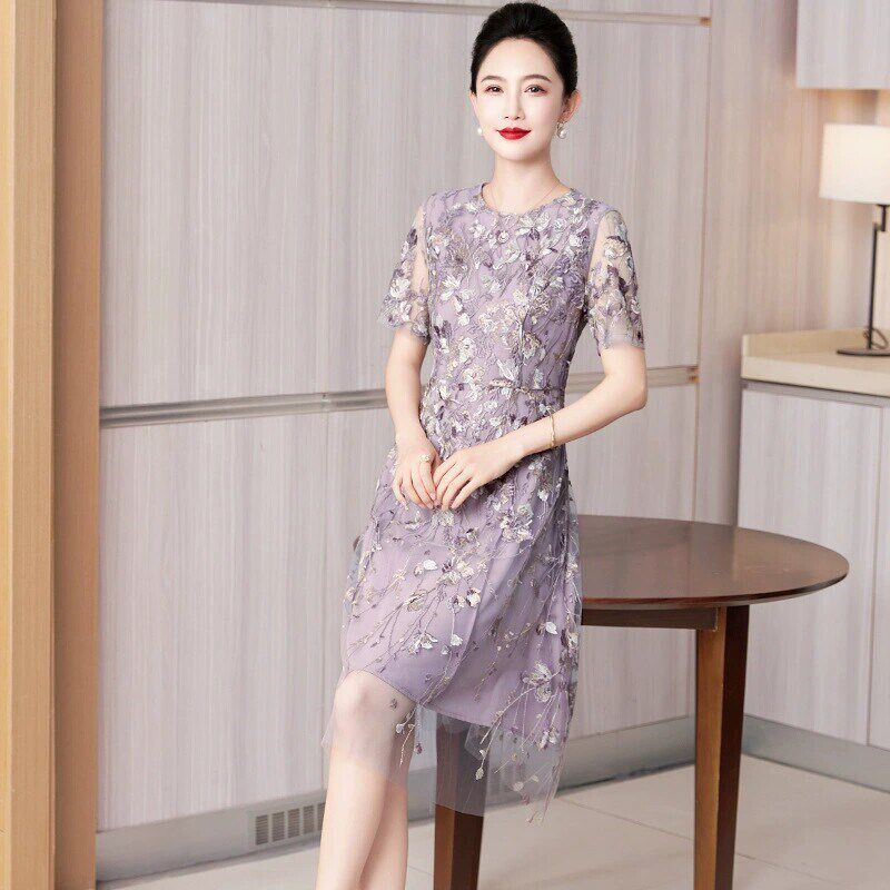 刺绣修身 2025新品 连衣裙妈妈套装 婚宴礼服圆领喜婆婆大码 显瘦型 款