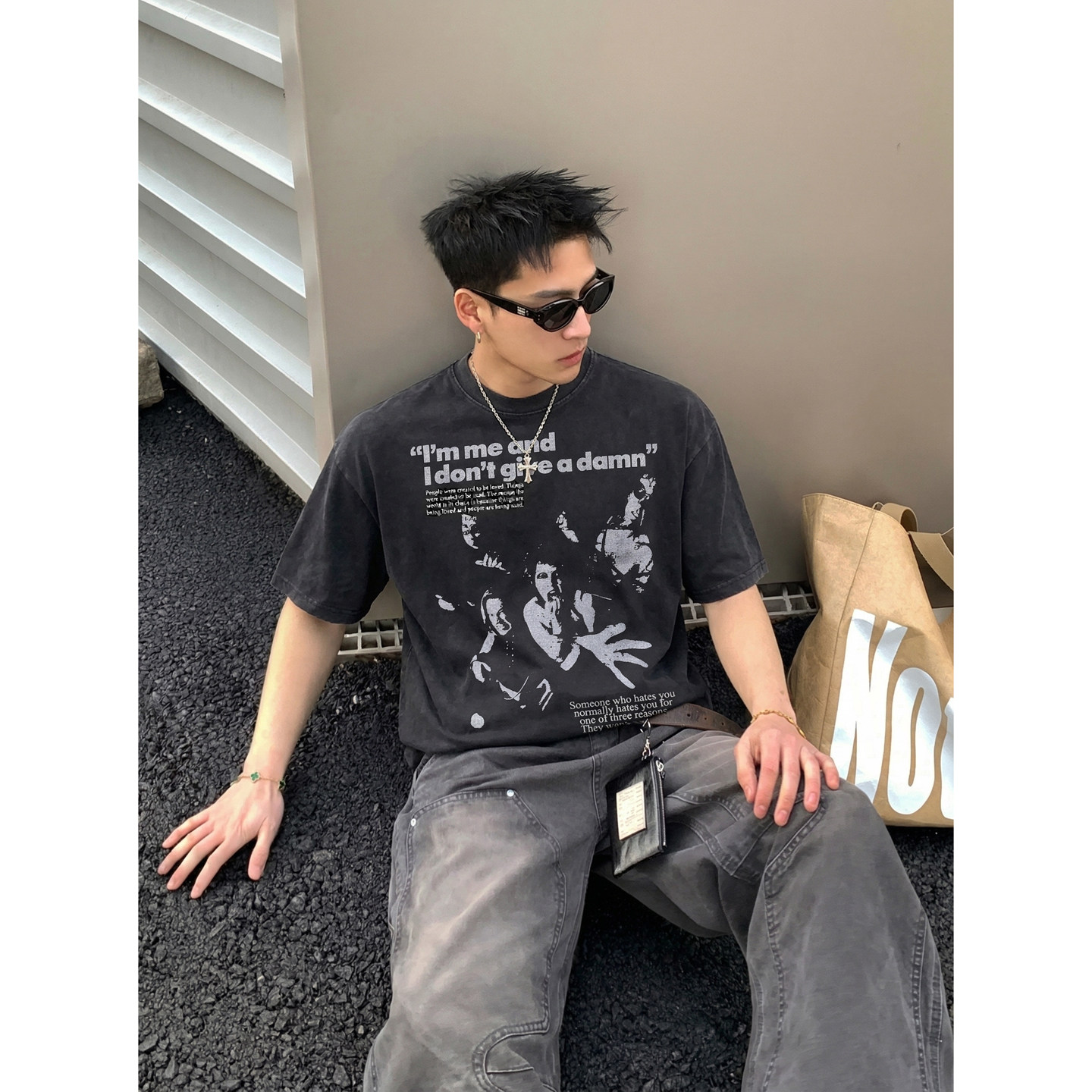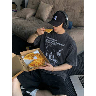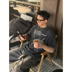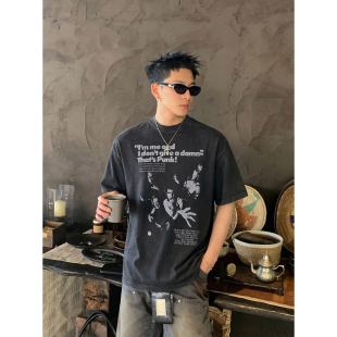 复古重磅做旧水洗朋克乐队印花短袖 美式 T恤男宽松高街潮 夏季 PLTH