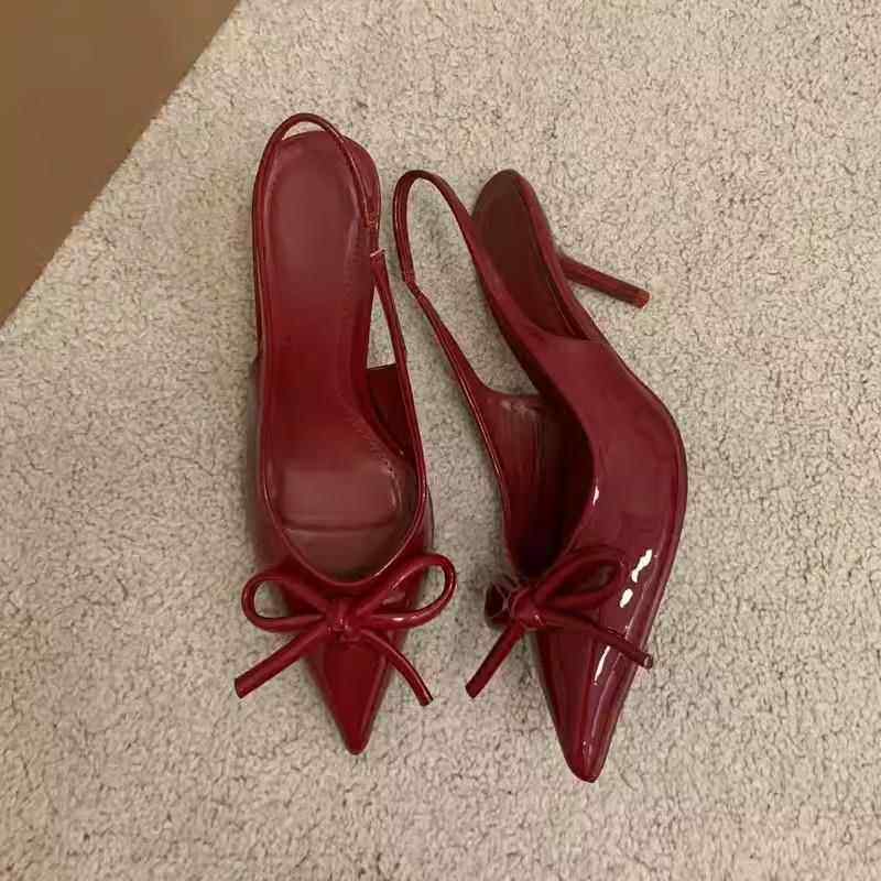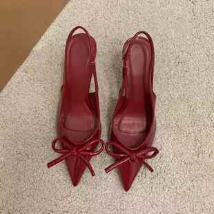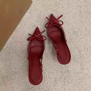 蝴蝶结2026新款 酒红色一字高跟鞋 外穿绝美尖头细跟0325d 法式 夏款
