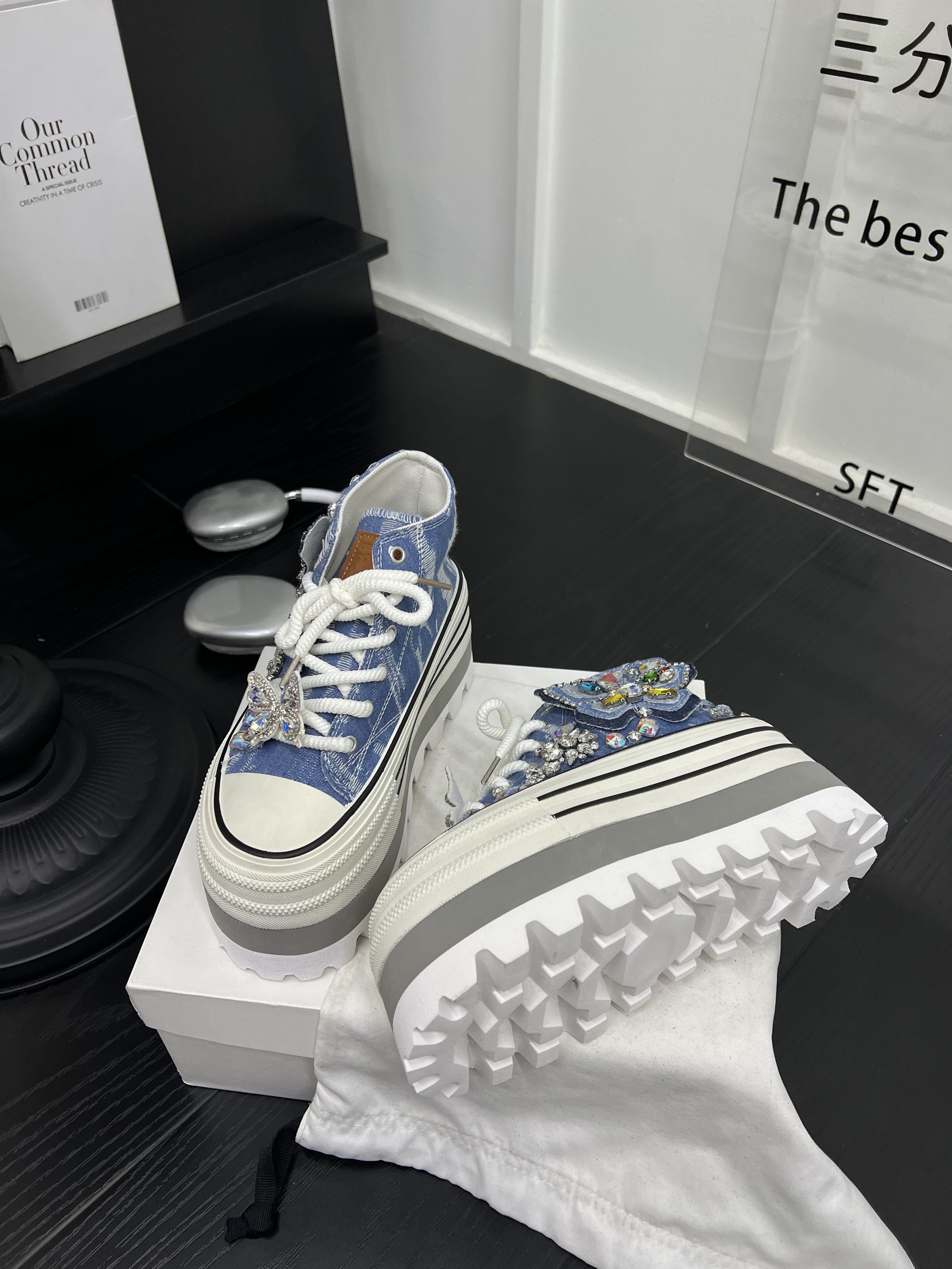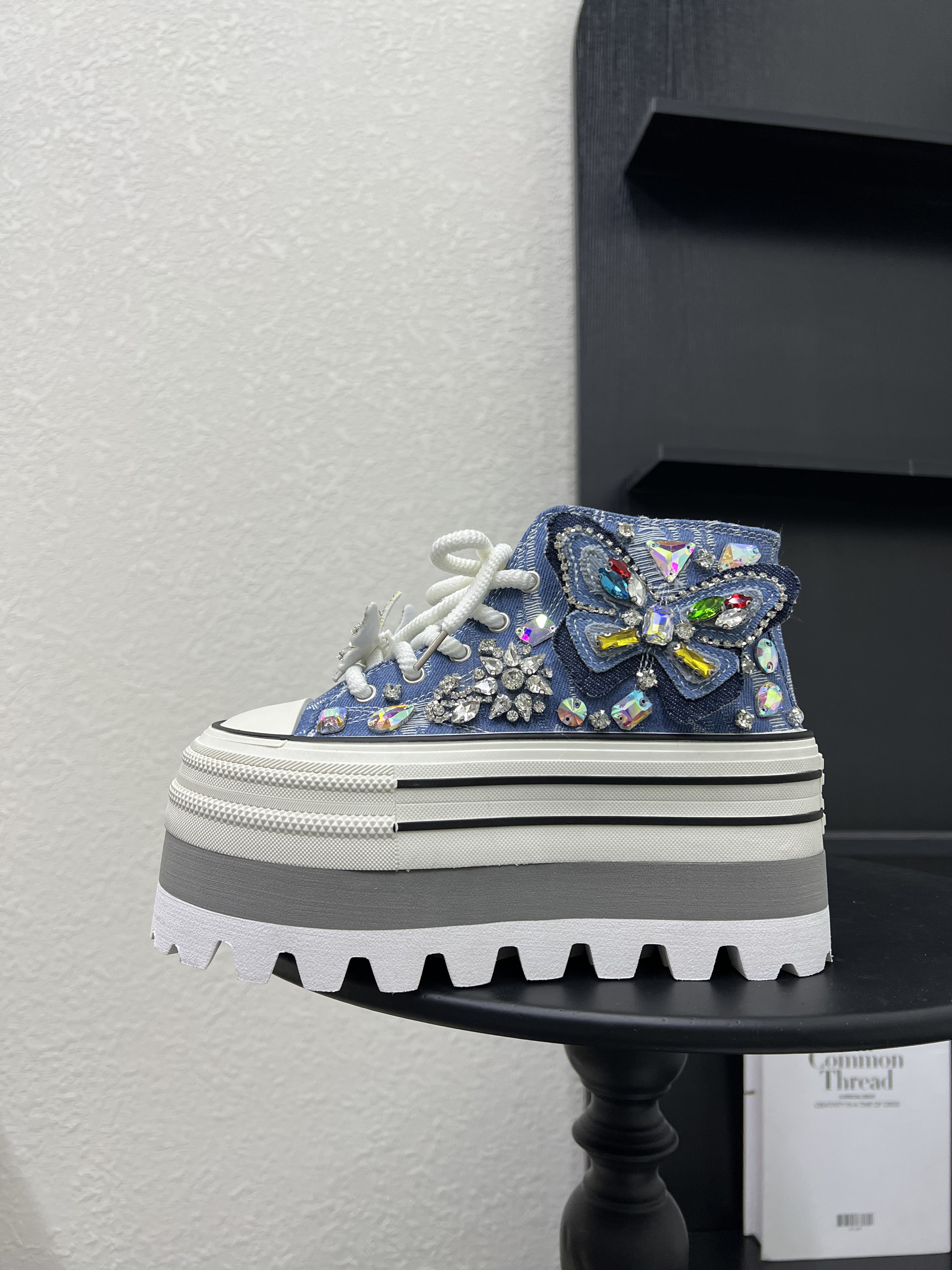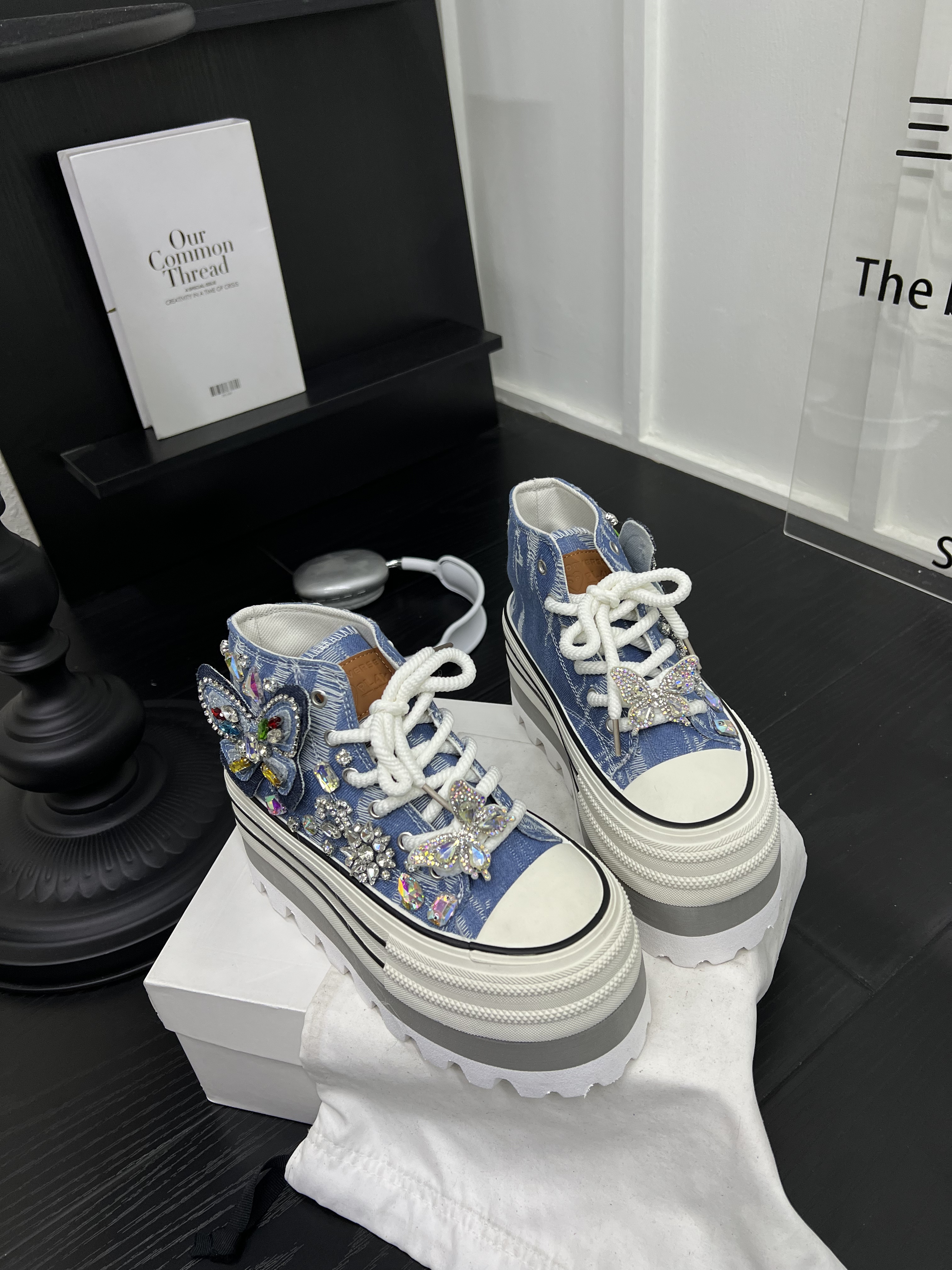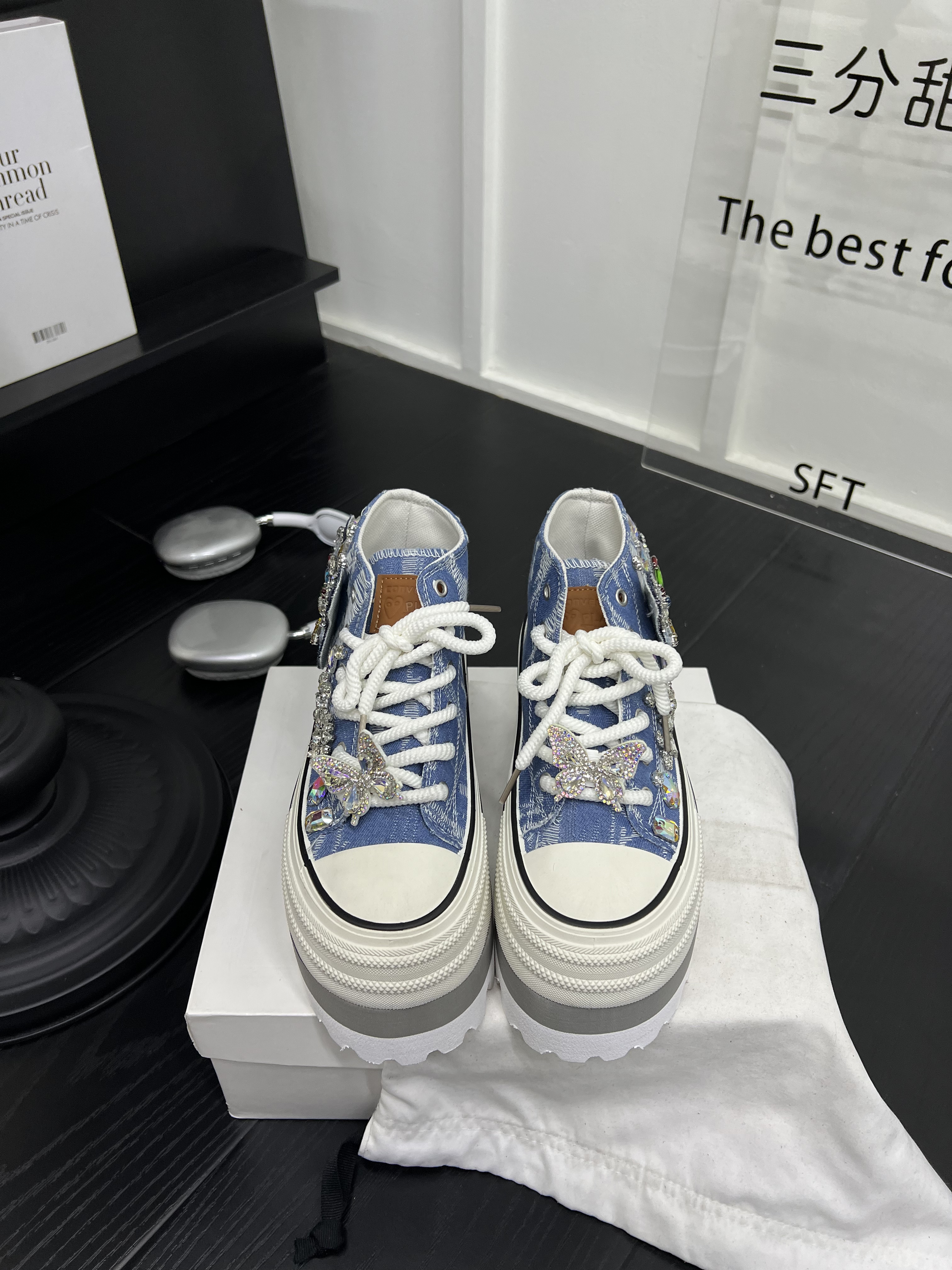 百搭水钻休闲板鞋 超火牛仔布厚底松糕小个子高帮鞋 女2026春夏新款