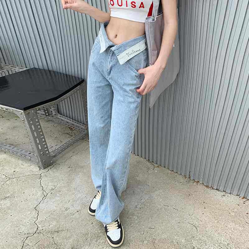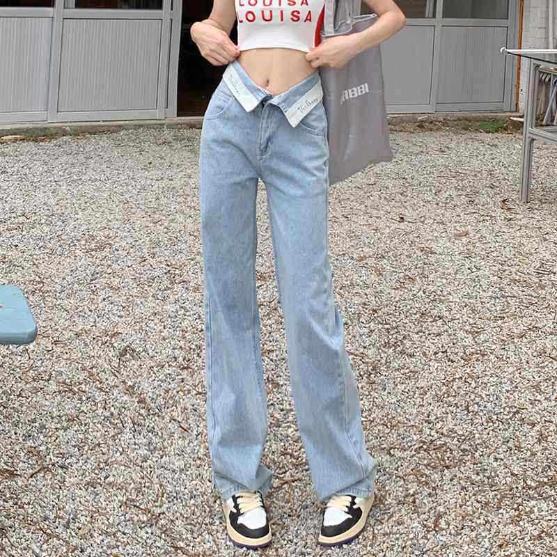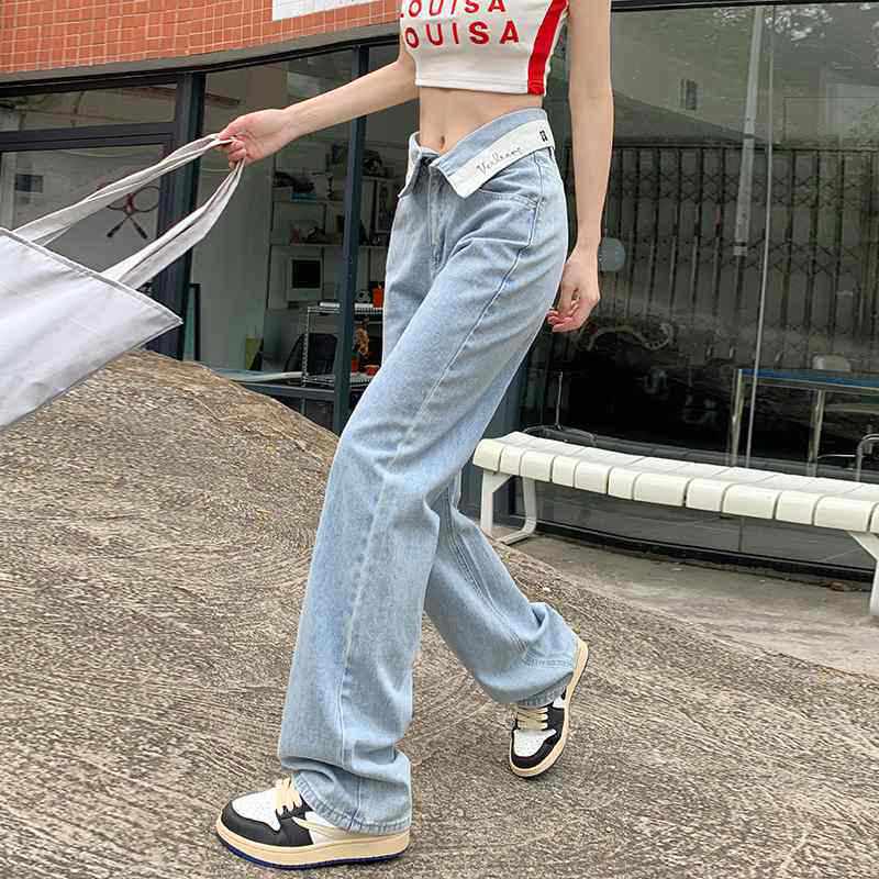 小个子高腰宽松百搭阔腿拖地长裤 翻边腰韩版 款 女春秋夏季 子 牛仔裤