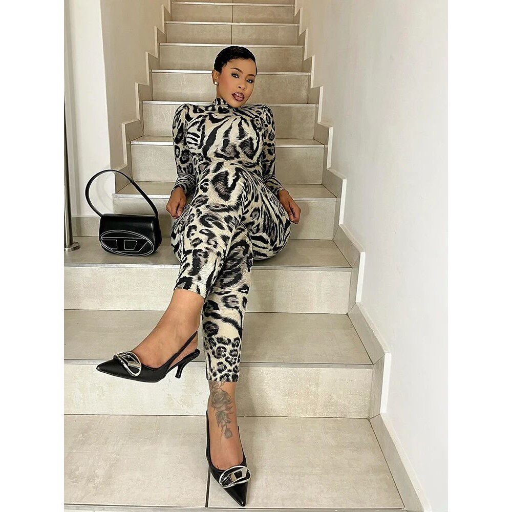 女Leopard neck print high jumpsuit semi 豹纹印花半高领连体裤