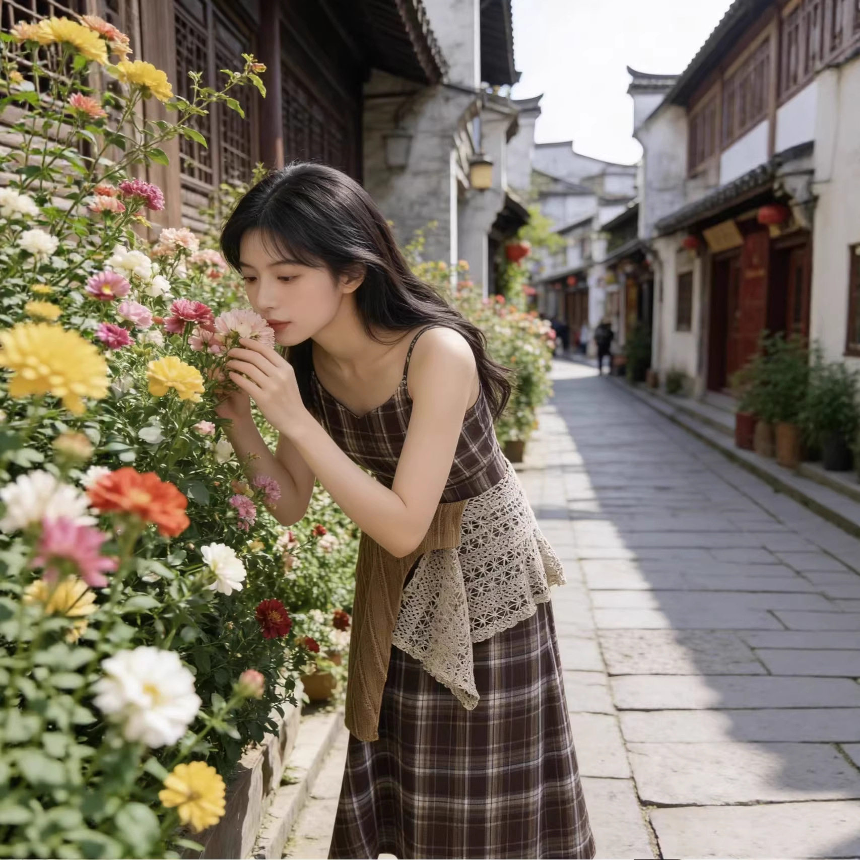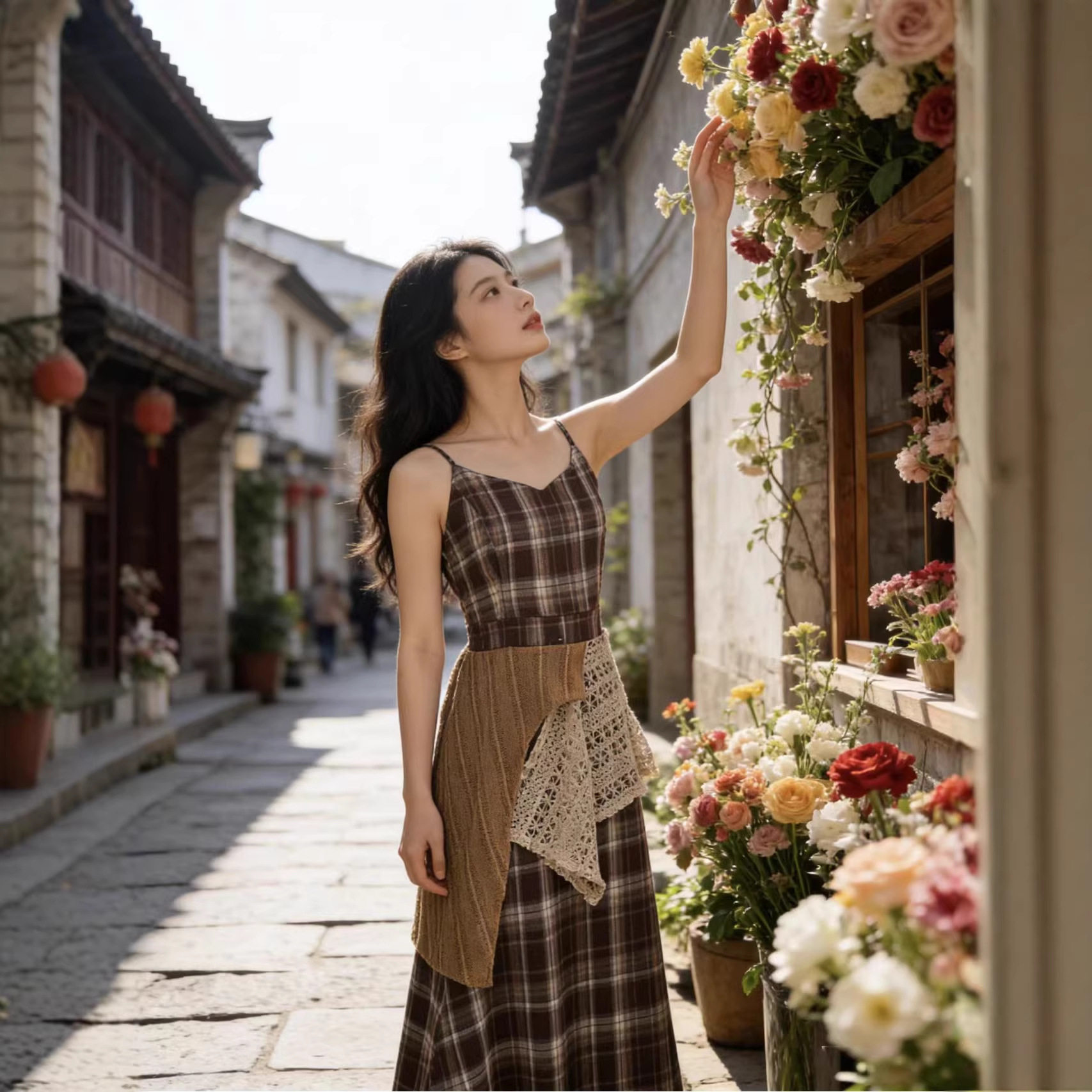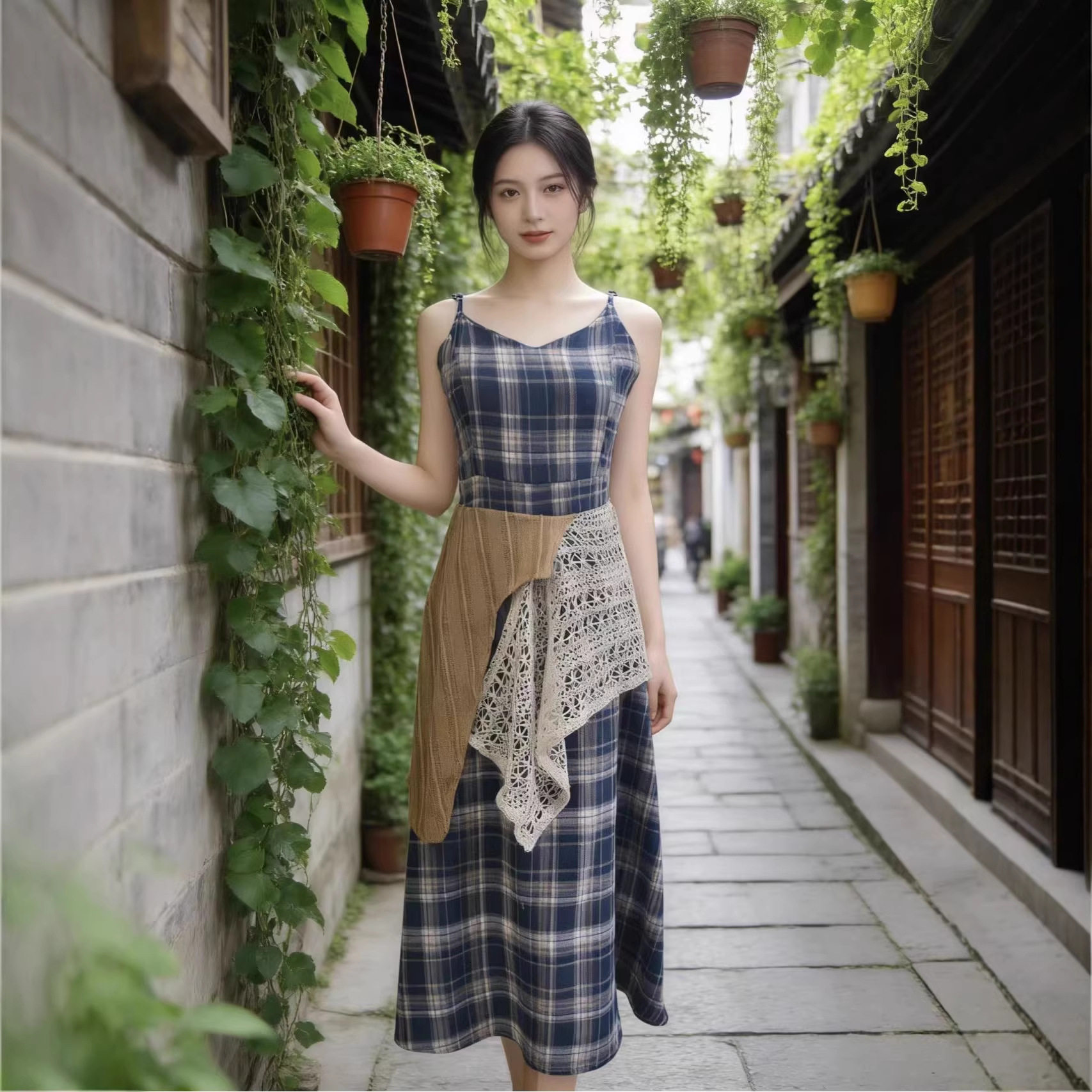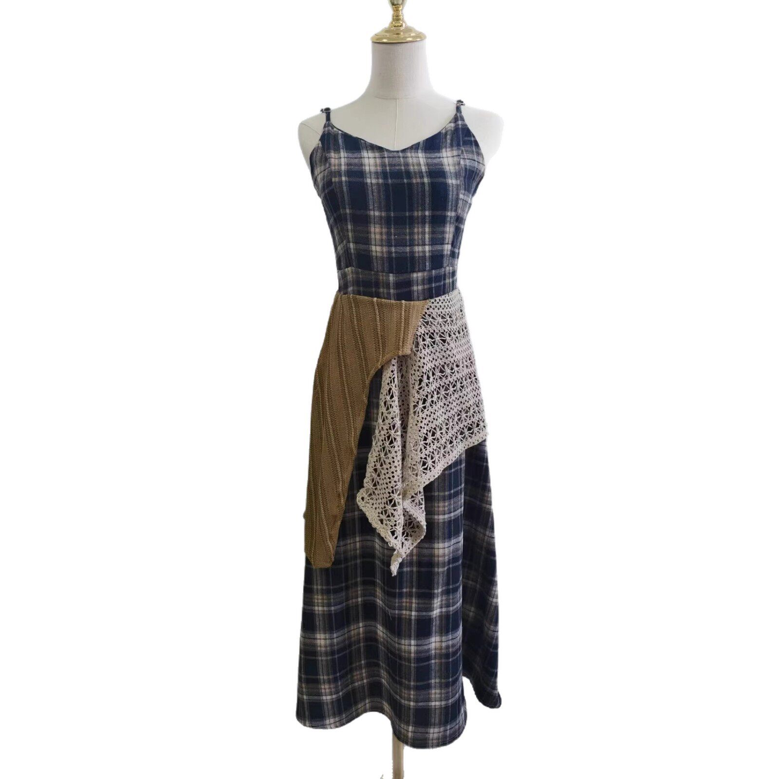 波西米亚复古连衣裙格子裙夏季 蕾丝吊带连衣裙海边度假长裙 新款