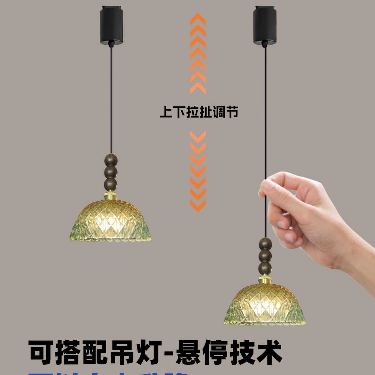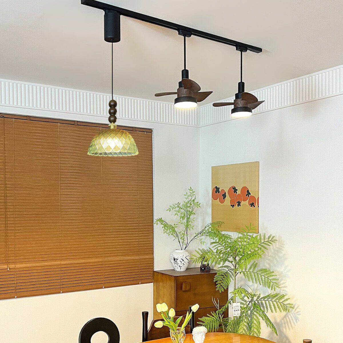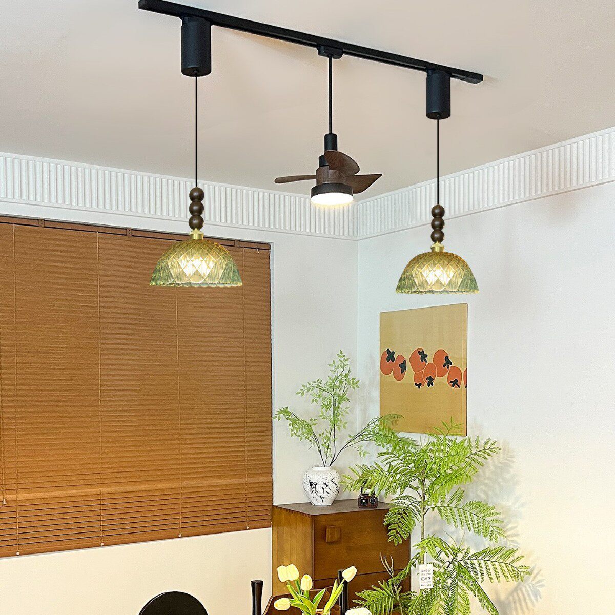 新款 中古风餐厅吊灯轨道风扇灯可移动悬停岛台餐桌绿色玻璃灯 法式