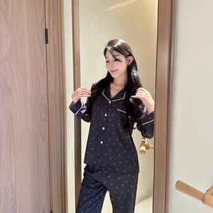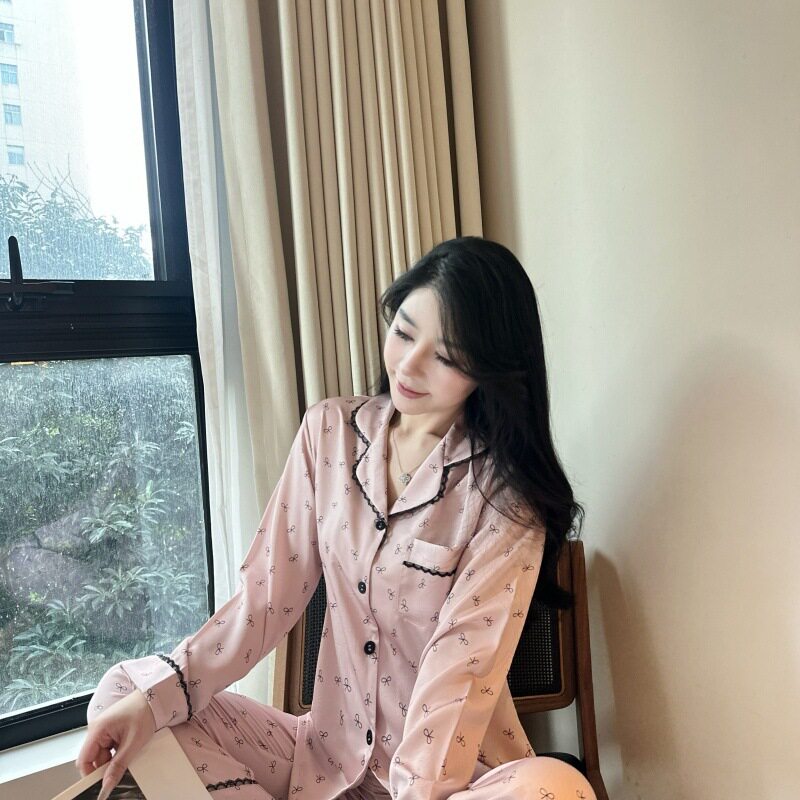 新款 春秋季 冰丝睡衣女甜美纯欲蝴蝶结家居服套装 抓纹蝴蝶结