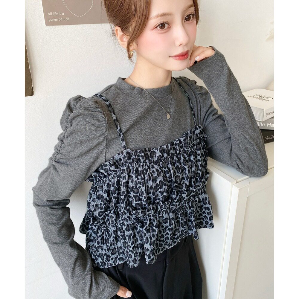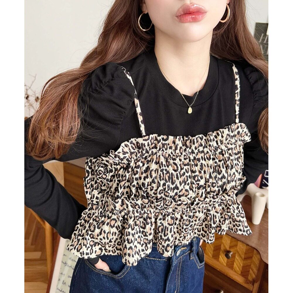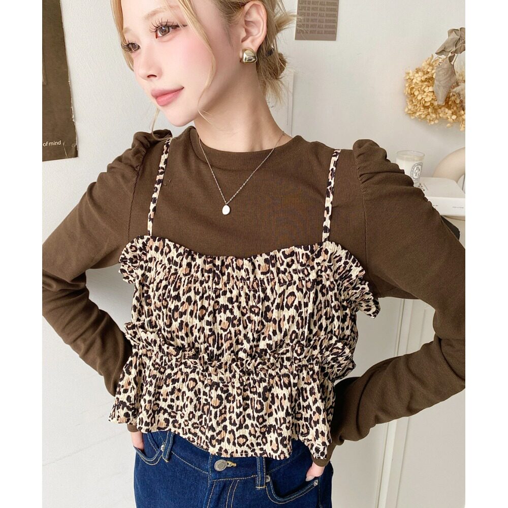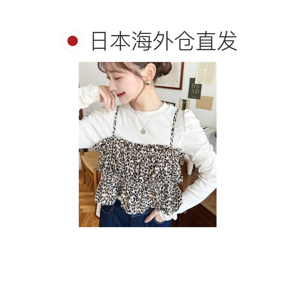 螺纹上衣 日本直邮moment 长袖 豹纹背心两件套 可单穿设计 女装