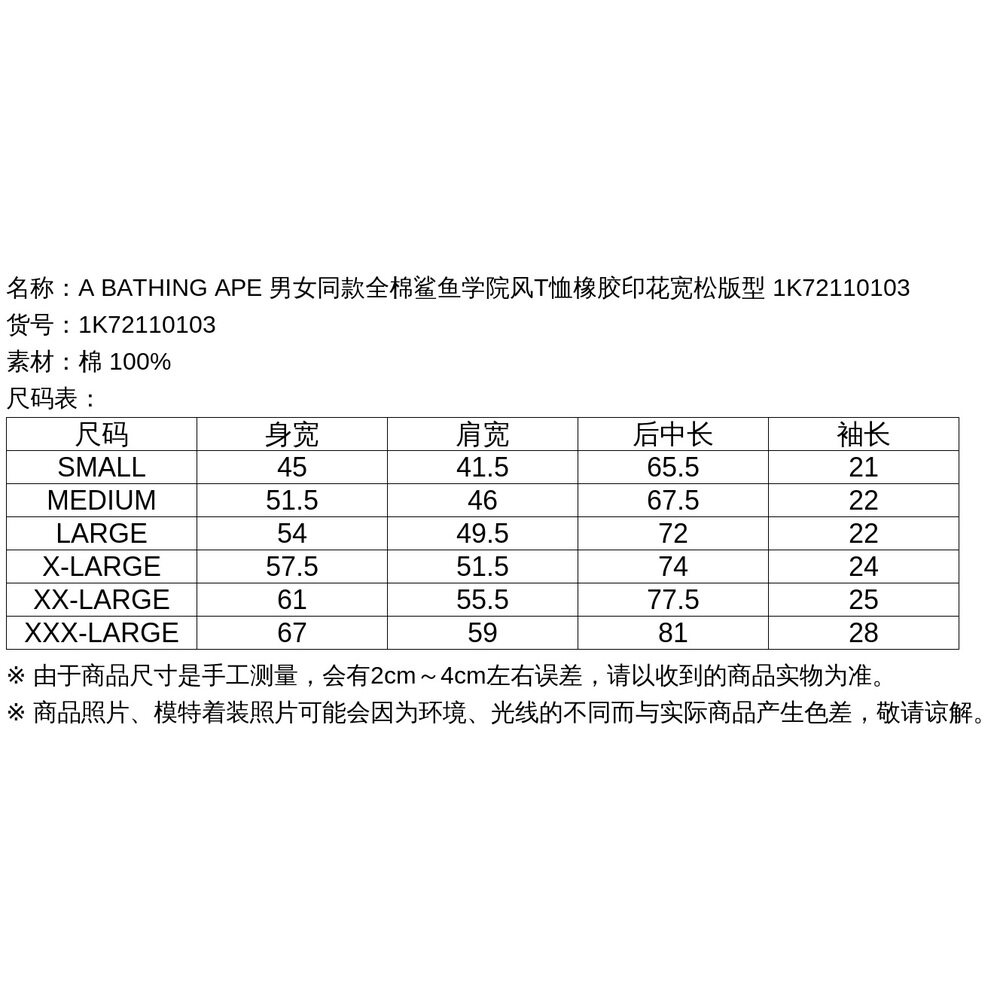 男女同款 1h可退 APE BATHING 全棉鲨鱼学院风T恤橡胶印 日本直邮A