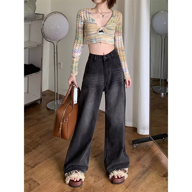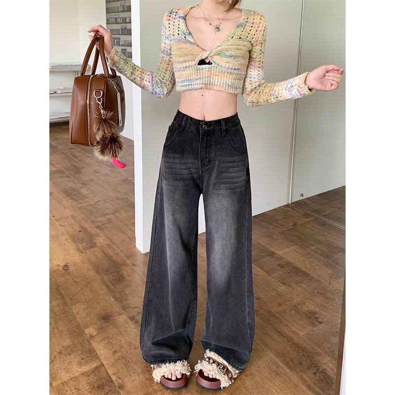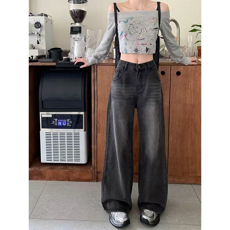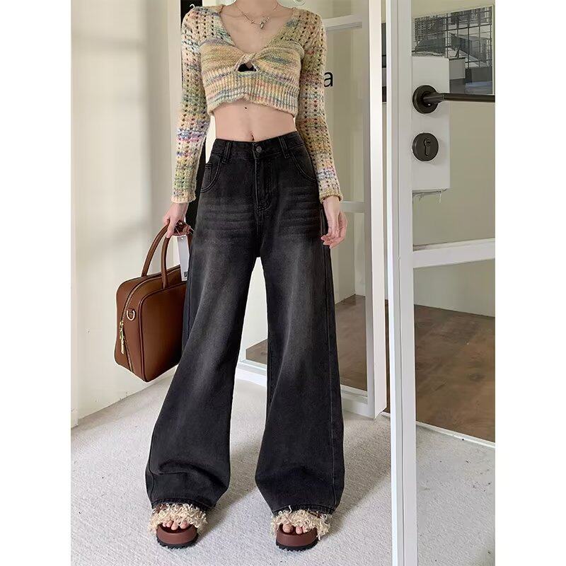 高腰宽松百搭阔腿长裤 女秋季 子潮 港味复古做旧水洗直筒牛仔裤 新款