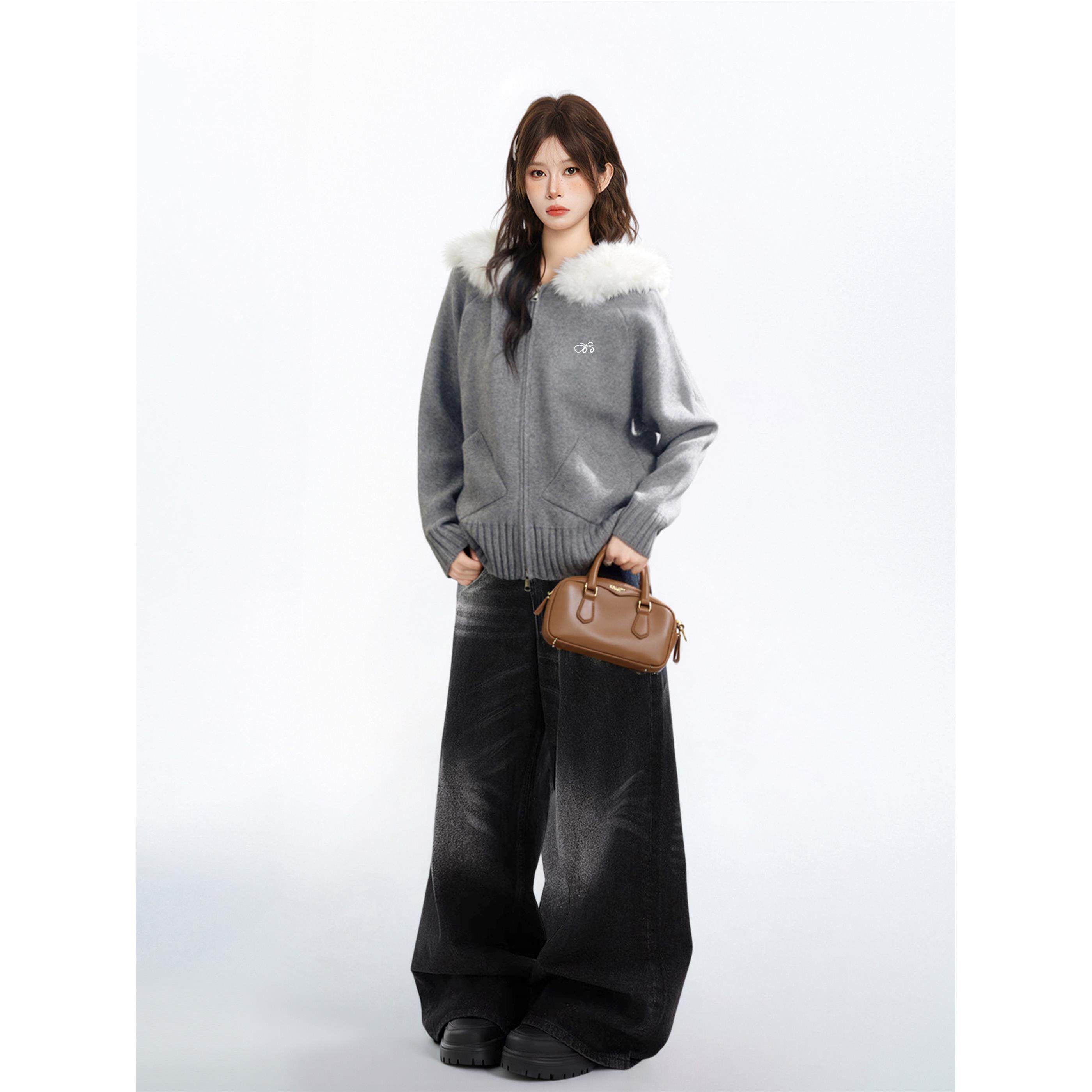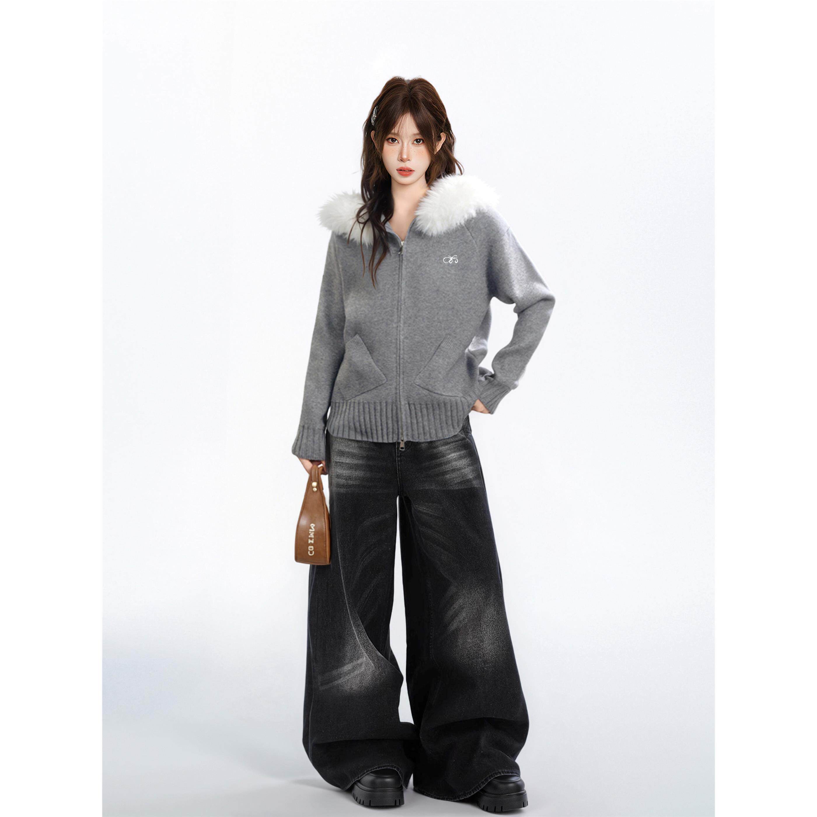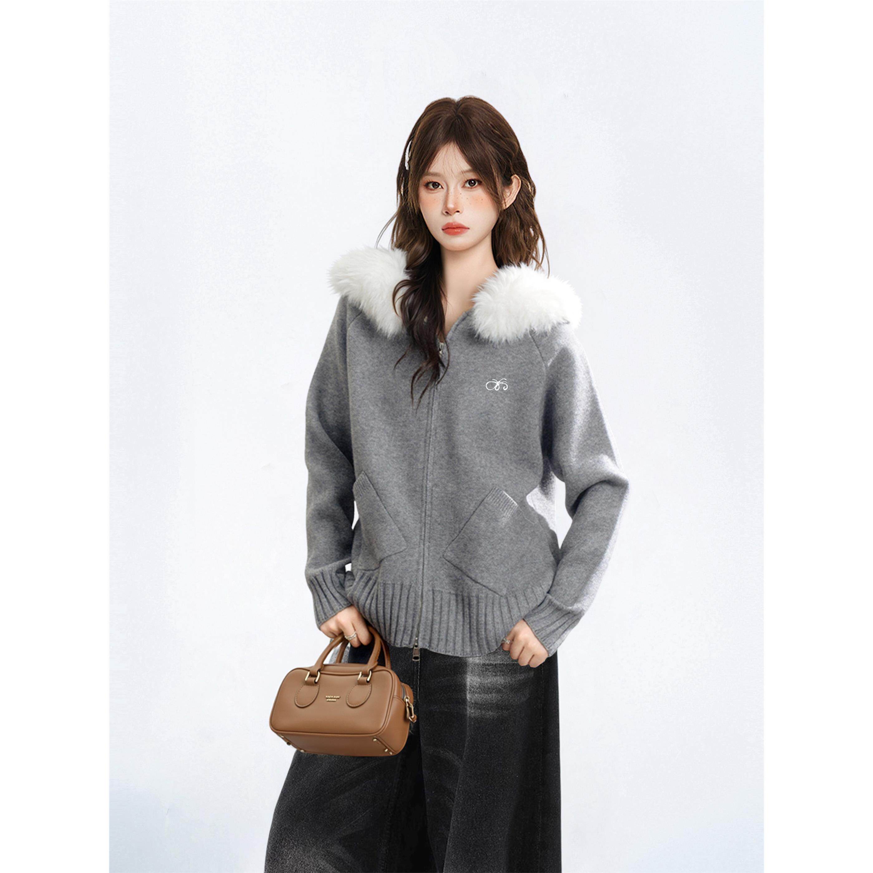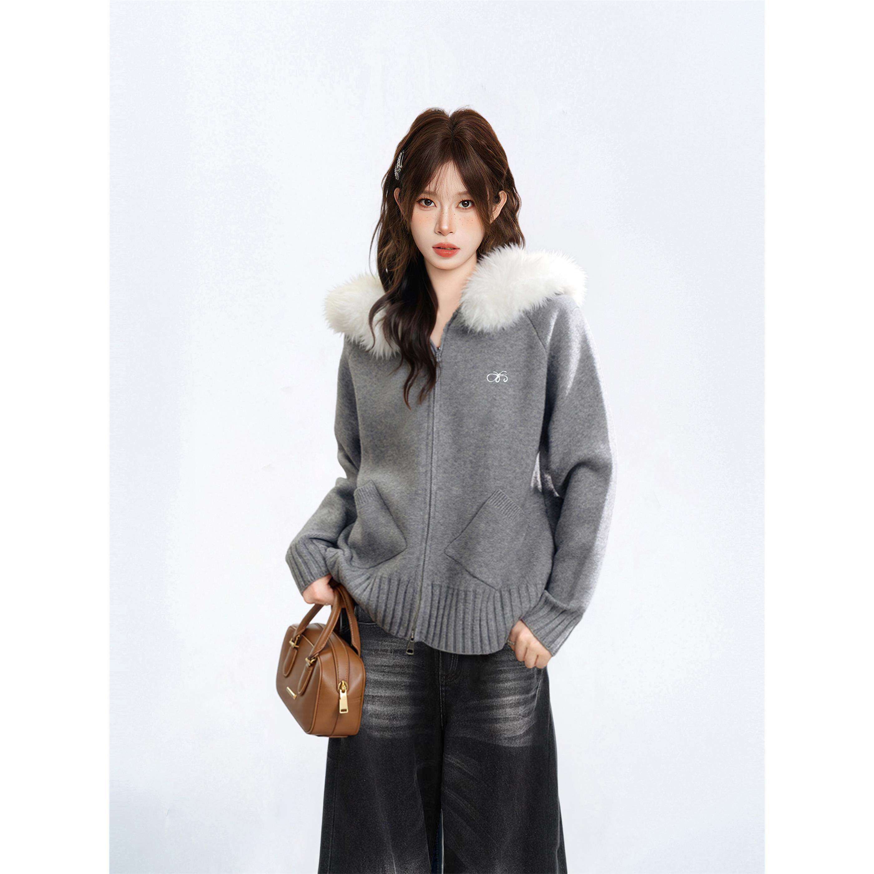 灰色连帽毛领毛衣外套女秋季 针织卫衣拉炼上衣 秋冬宽松慵懒风开衫