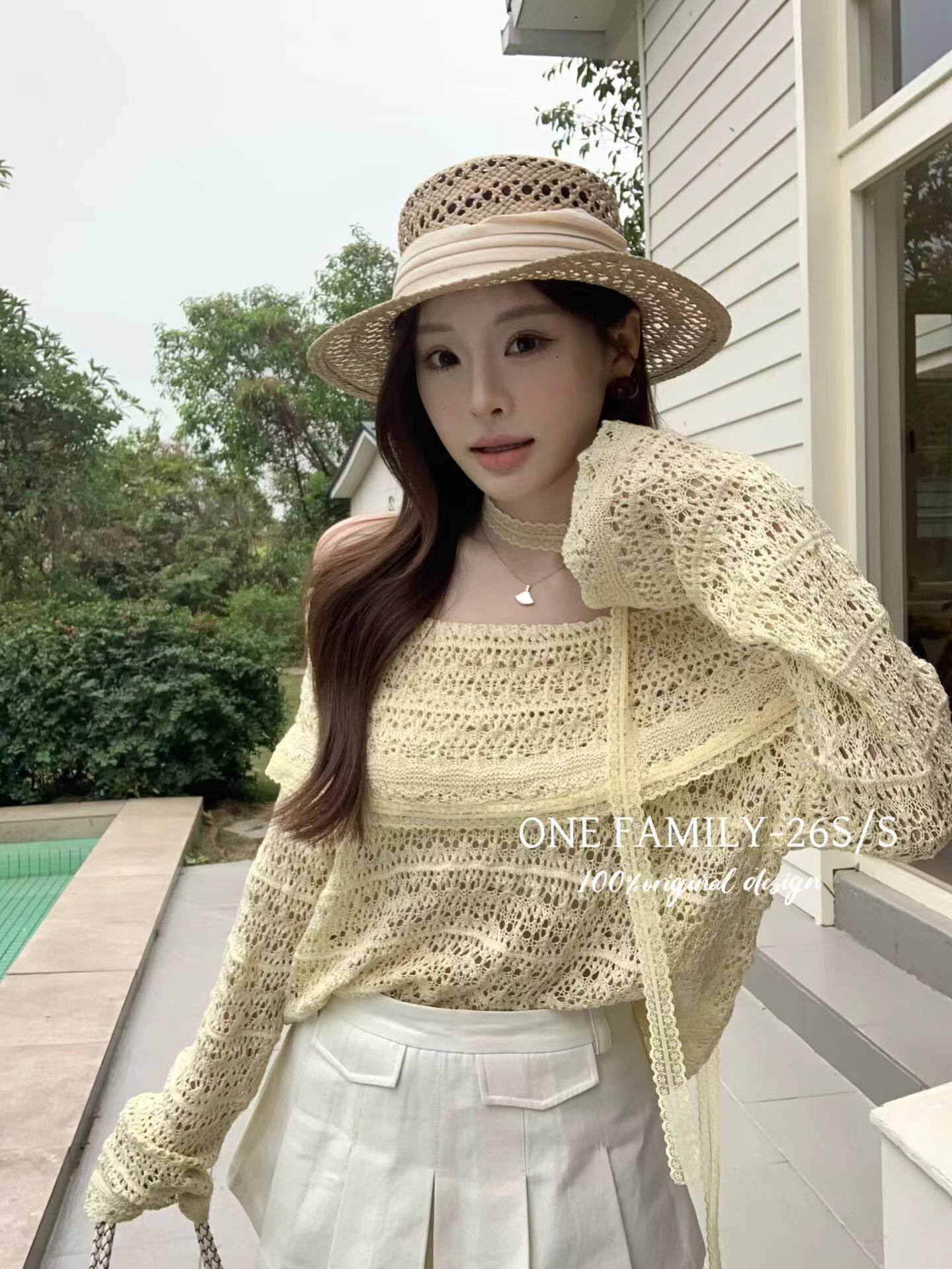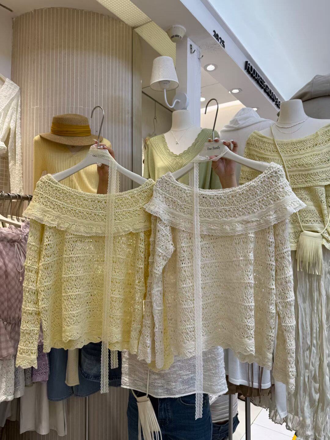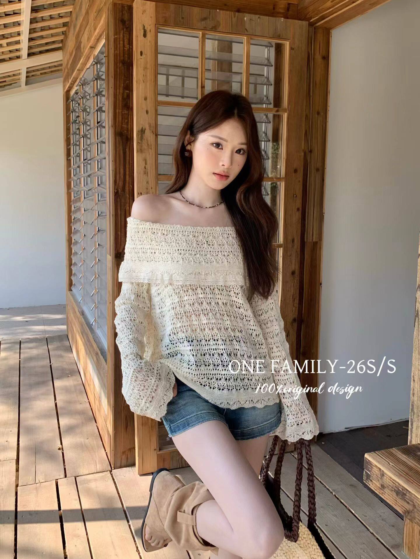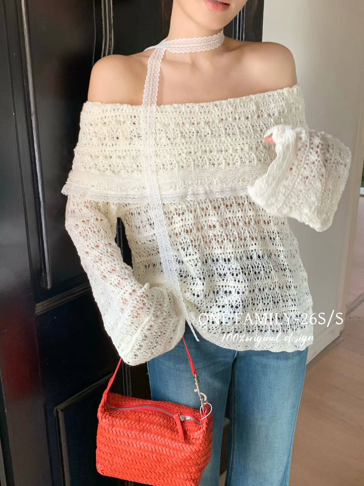 Family春夏新款 女修身 韩版 镂空针织衫 显瘦上衣 气质一字肩长袖 One