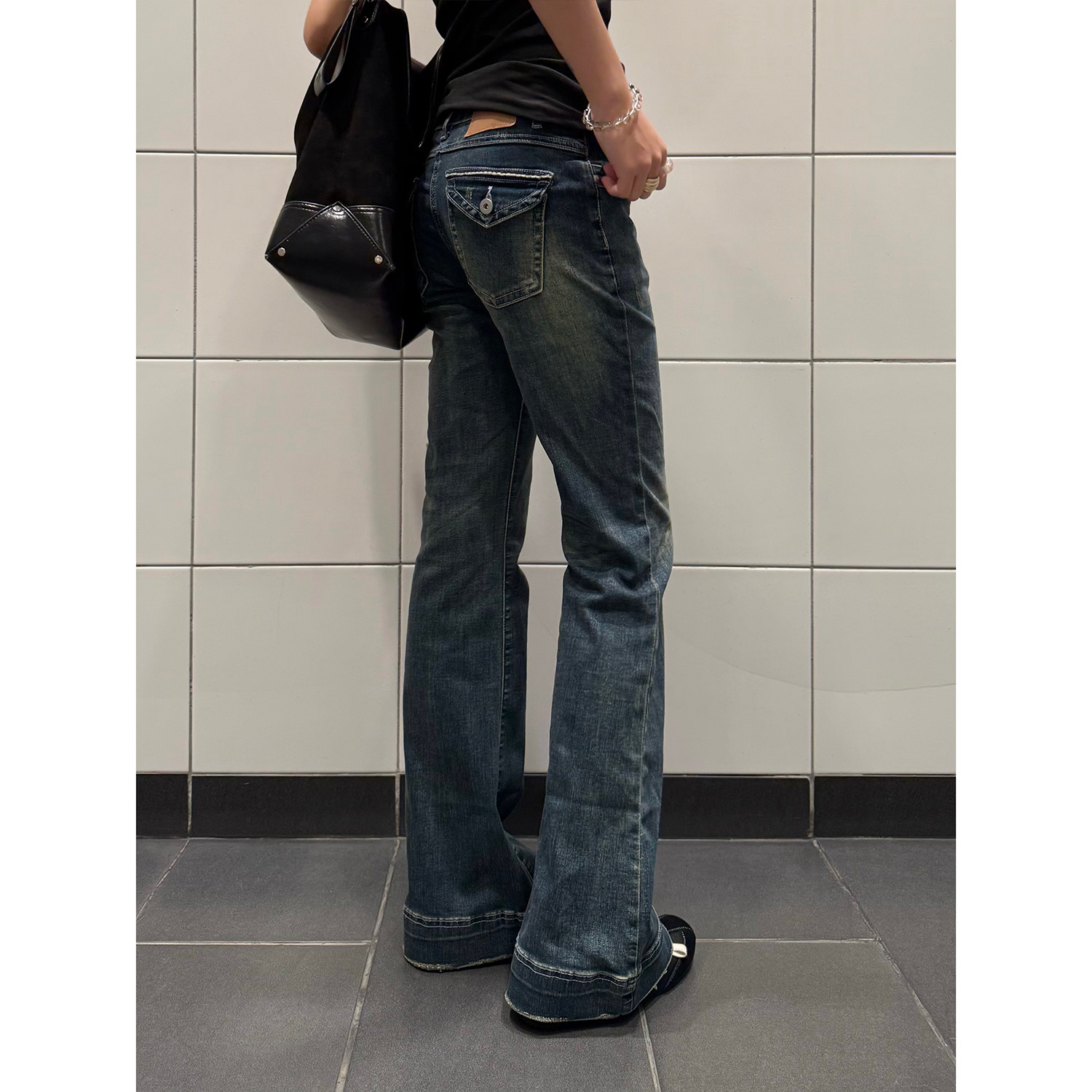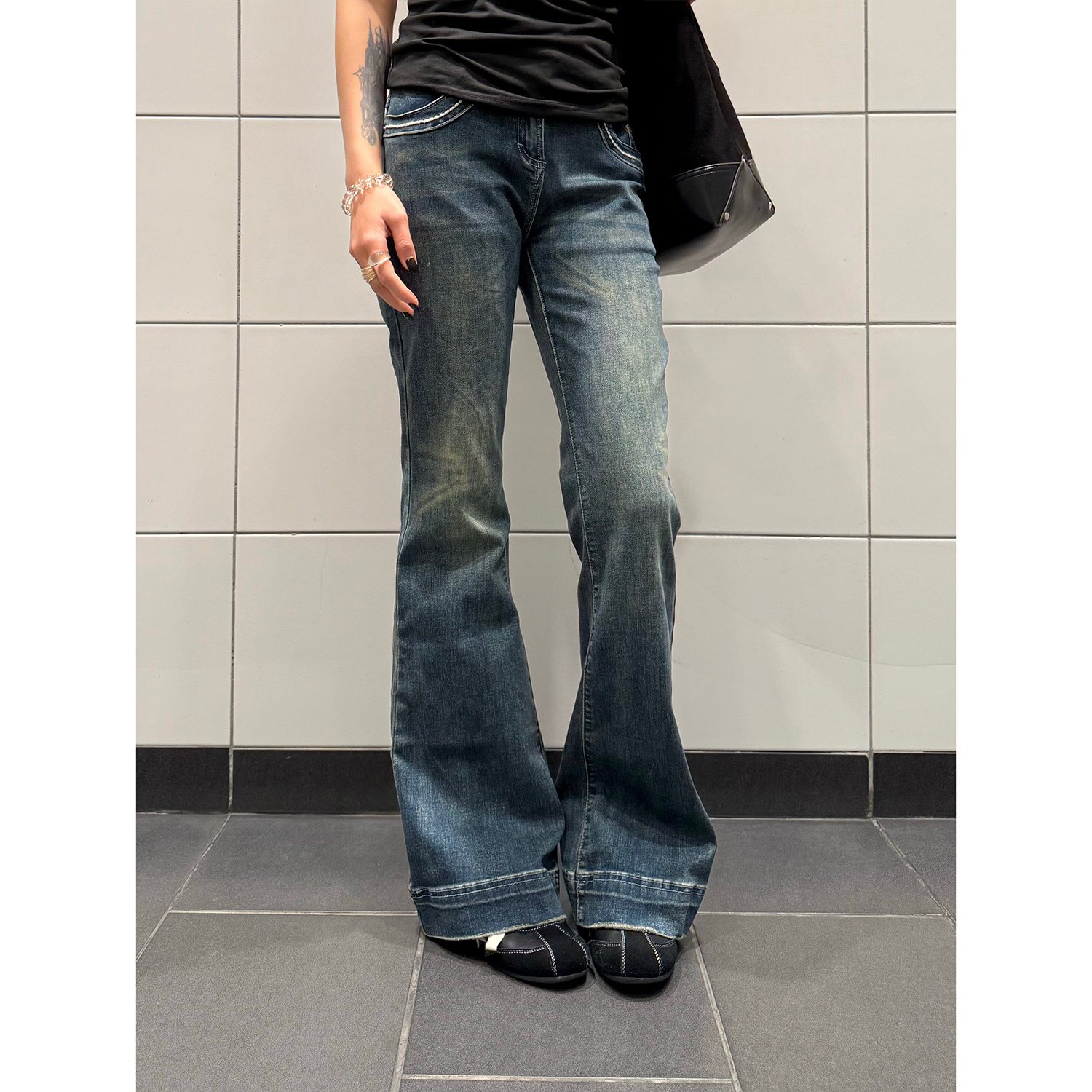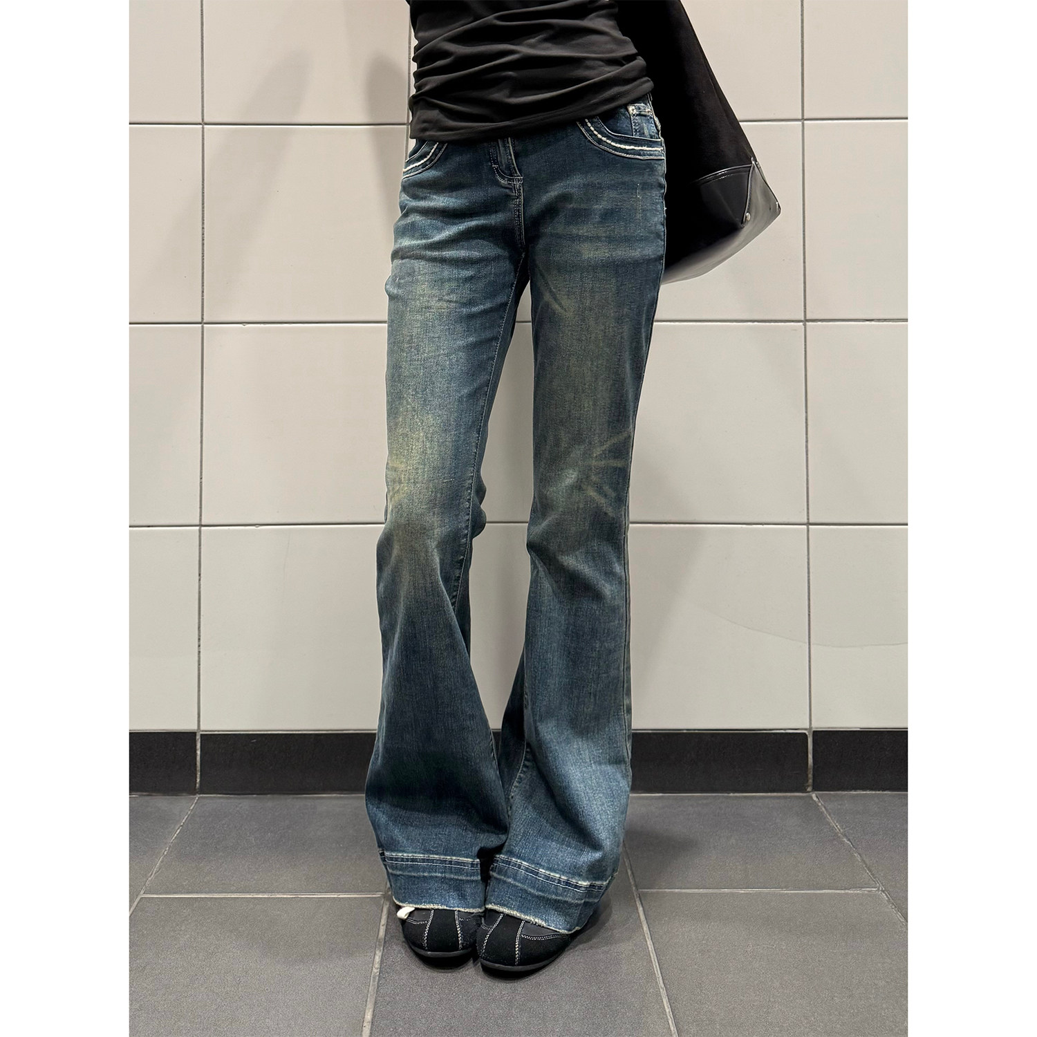 显瘦百搭长裤 F383 女设计感修身 复古水洗做旧低腰微喇牛仔裤 美式