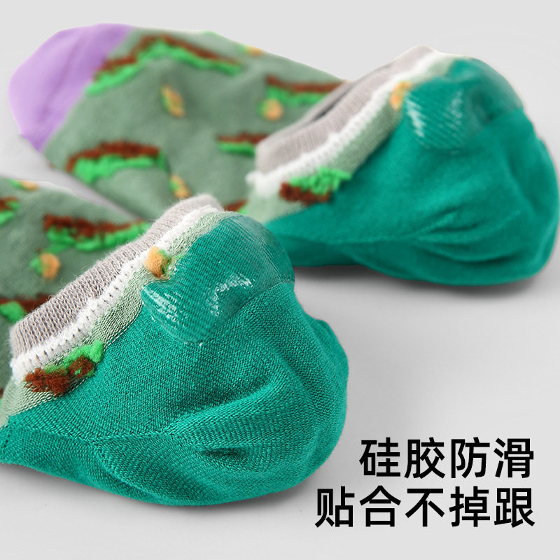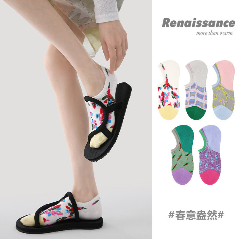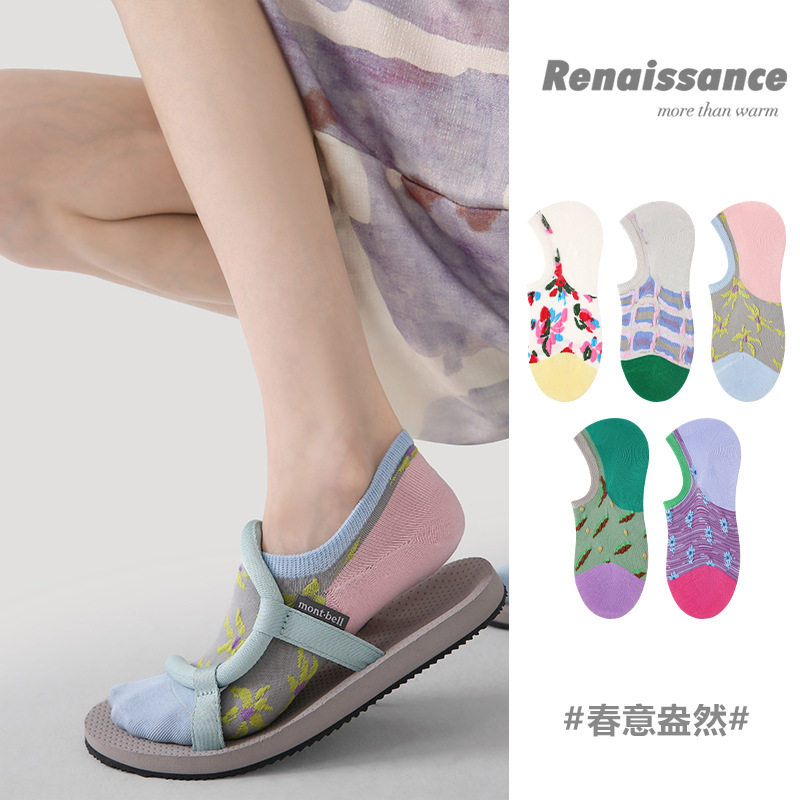 Renaissance春夏拼色花朵短袜无骨精梳棉船袜ins潮袜子女