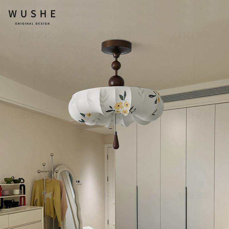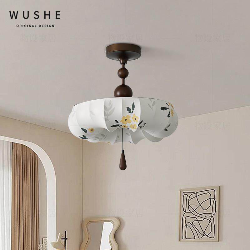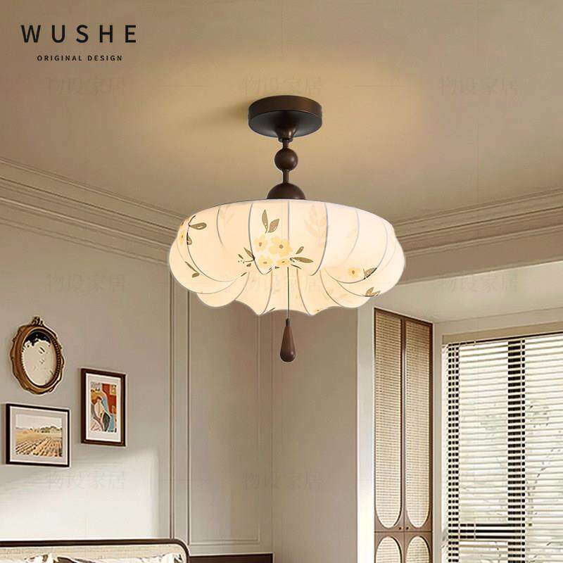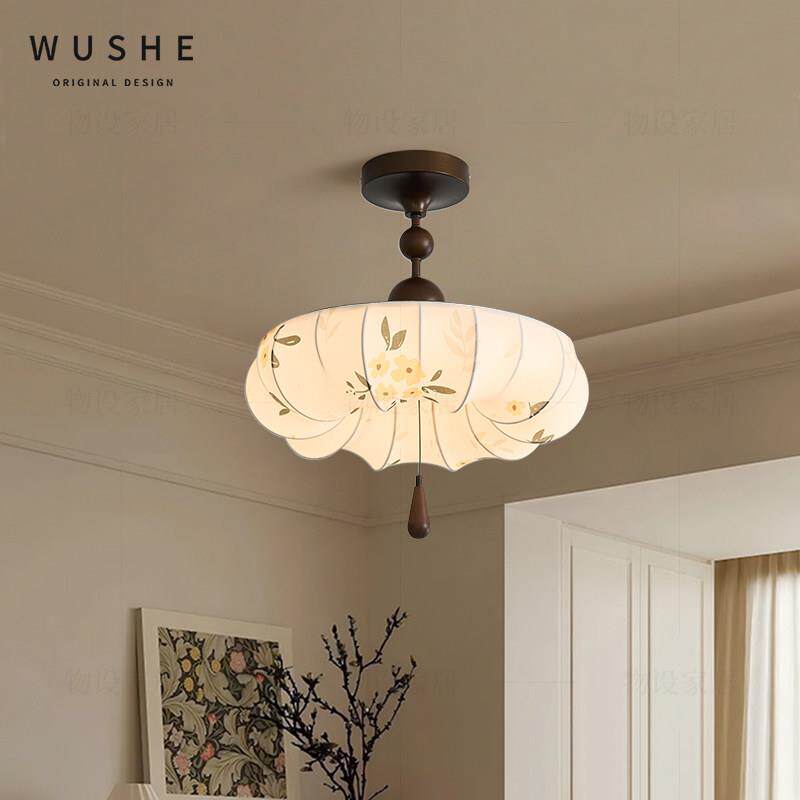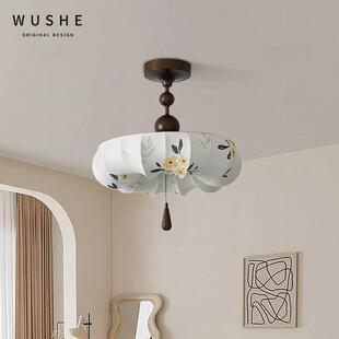 中古风卧室吸顶灯法式 覆古胡桃木色布艺花朵护眼主卧房间书房灯具
