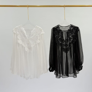 新款 甜水仙 春季 复古优雅立体钩花蕾丝拼接雪纺衫 宽松上衣 早樱子
