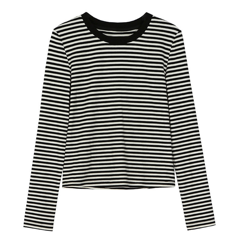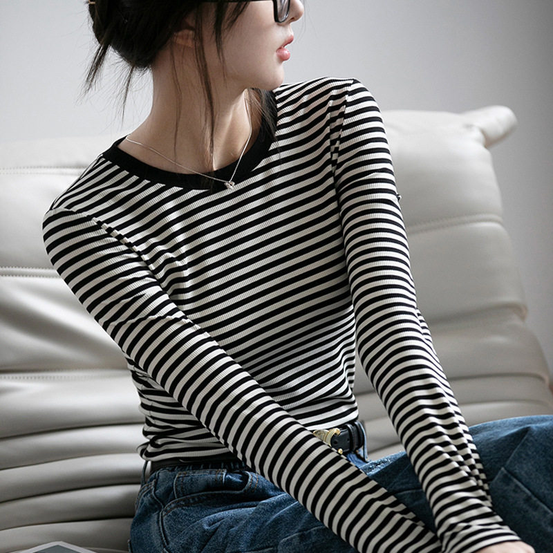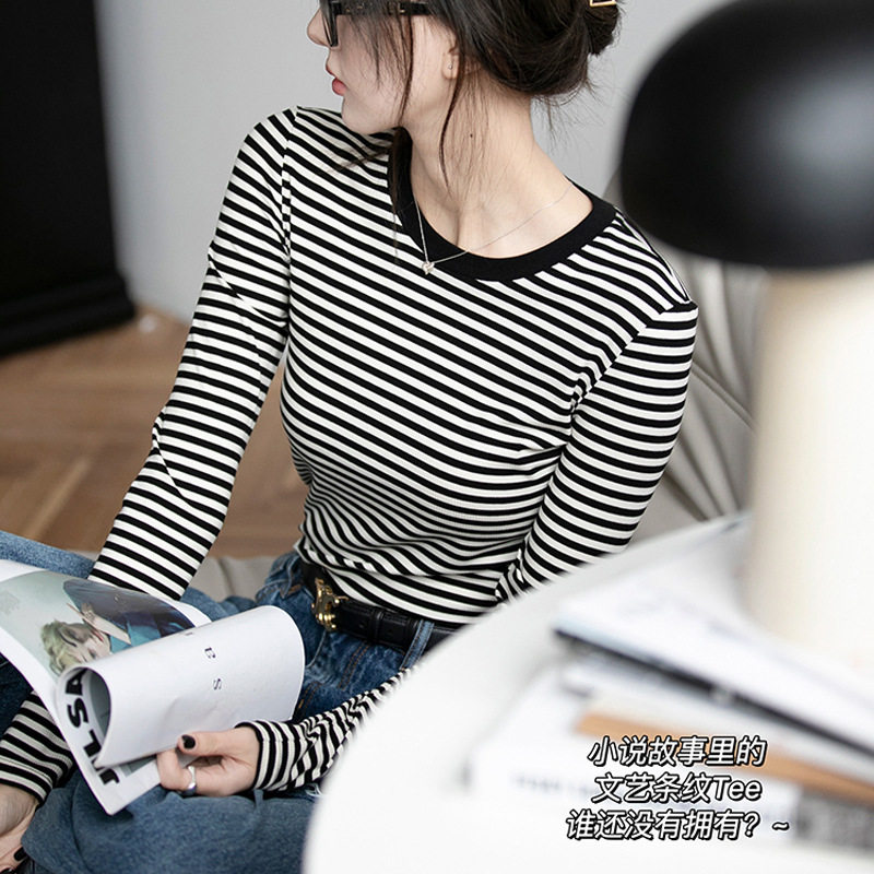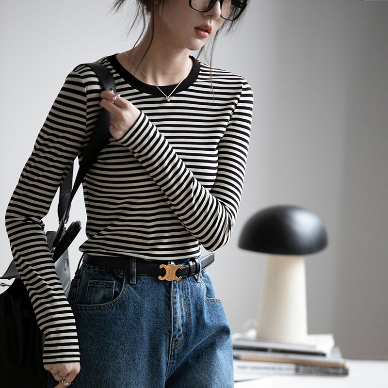 长袖 高品纯棉条纹撞色圆领修身 新款 女2026秋季 百搭内搭T恤 打底衫